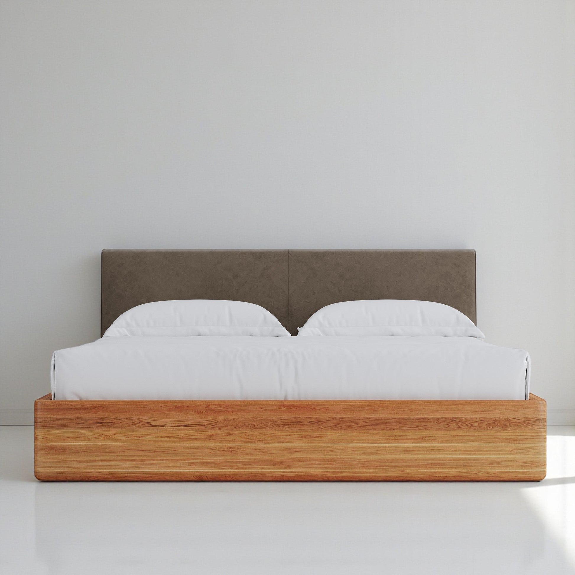 The Aari Bed reimagines smart storage without sacrificing elegance. Radius-milled corners soften the solid-wood shell (available in teak, oak, or walnut), while a tailored, linen-blend upholstered headboard invites you to read or lounge in comfort.
