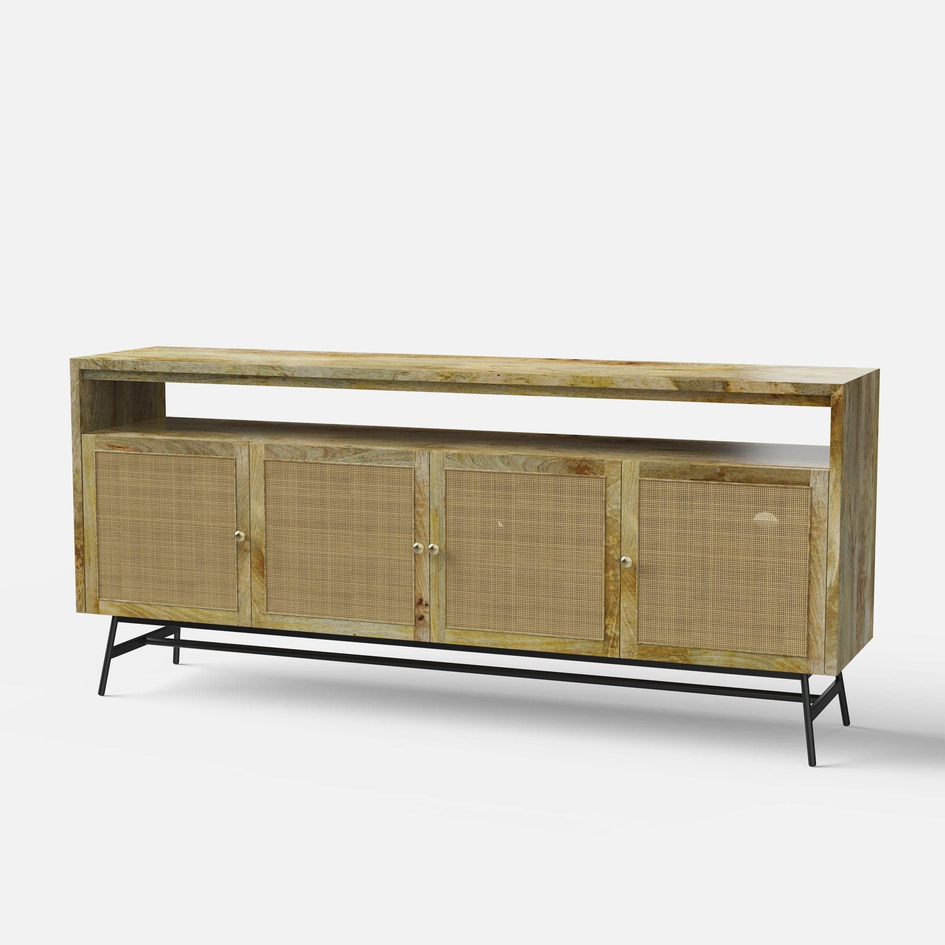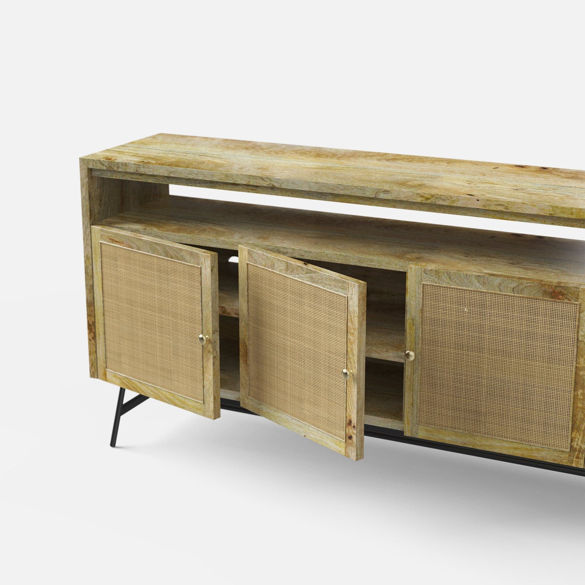 Introducing the Adelaide Extra Large TV Table Console, a statement piece that seamlessly blends style and functionality. Crafted from Mango wood with a Natural Finish, this console is adorned with elegant Rattan weave on the doors, adding a touch of natural charm. Supported by sleek metal legs, it's available in multiple finishes to suit your aesthetic.
