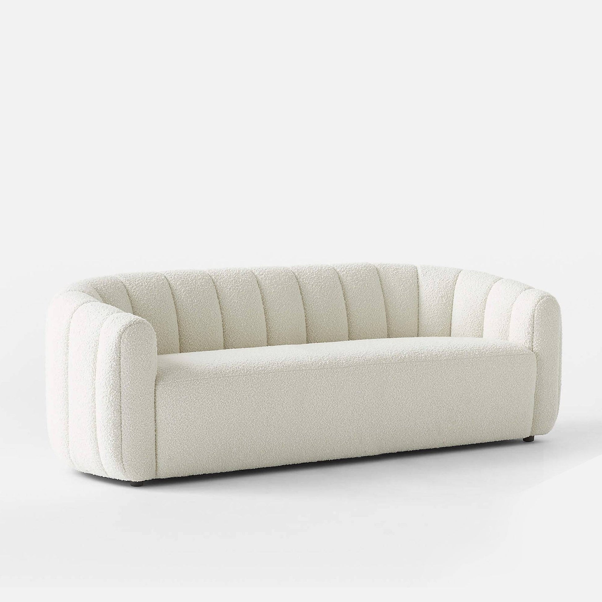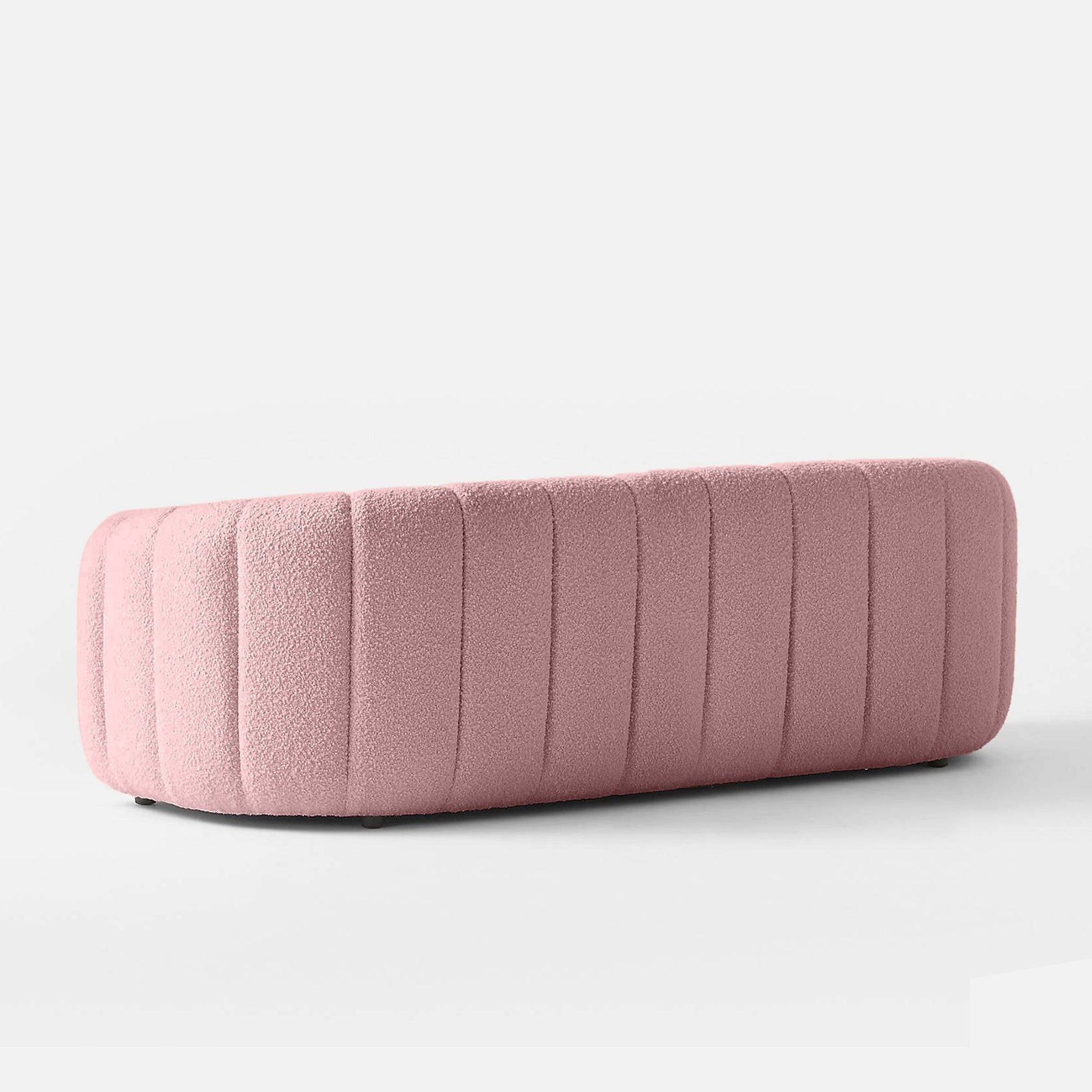 Introducing the Alba 3 Seater Sofa - 84", a beautifully designed piece that combines vintage elegance with modern comfort. Channel-tufted in Soft Boucle Fabric, this deco-inspired sofa makes a striking statement in any room. The plush boucle fabric in Rose Gold colour and soft foaming ensures it's one of our most comfortable sofas.
