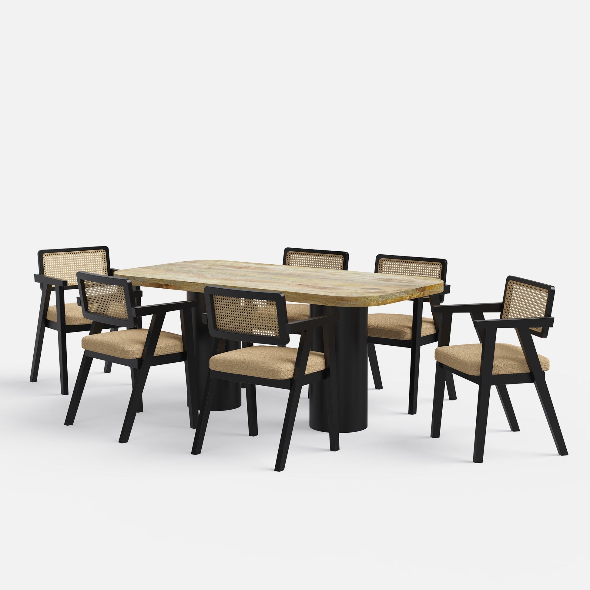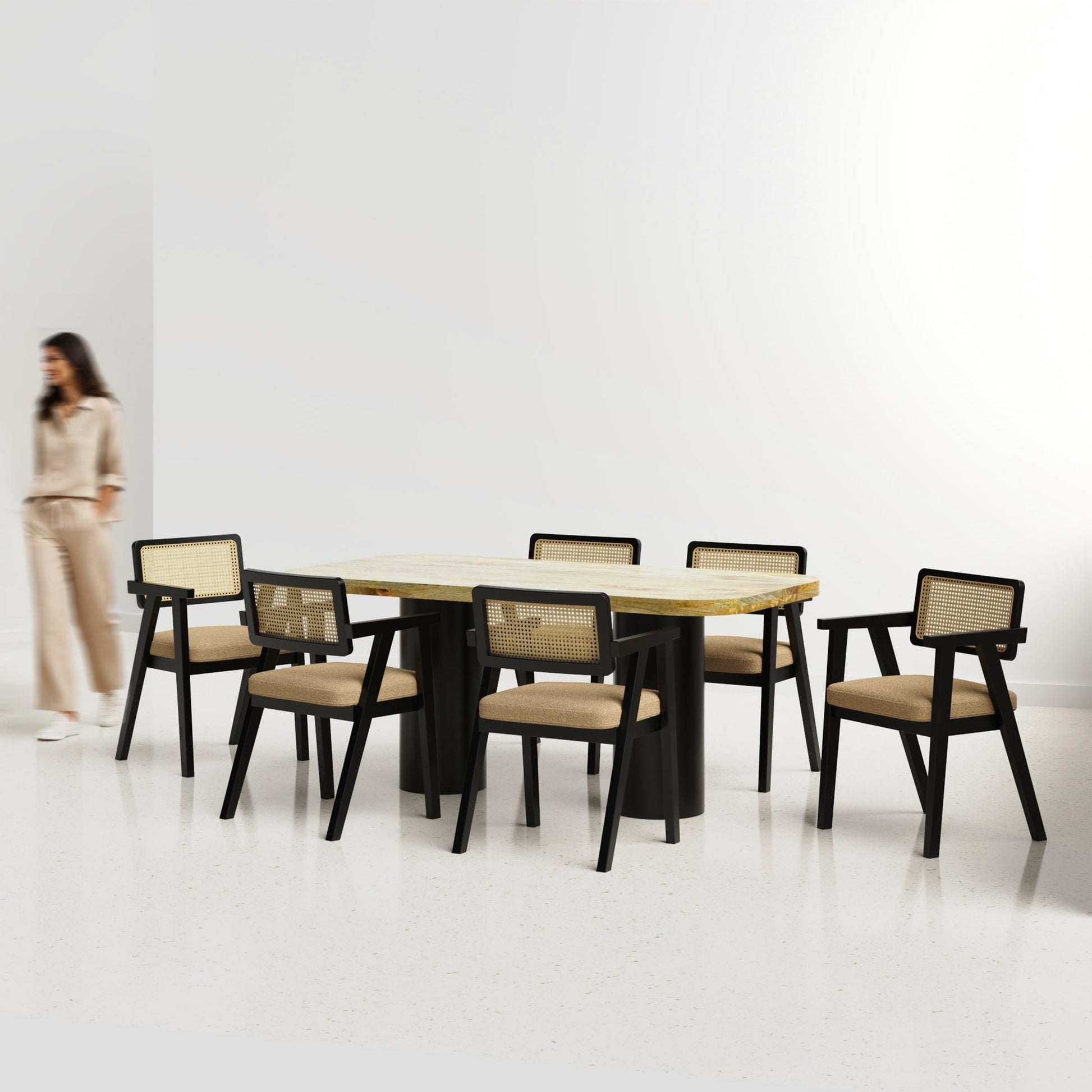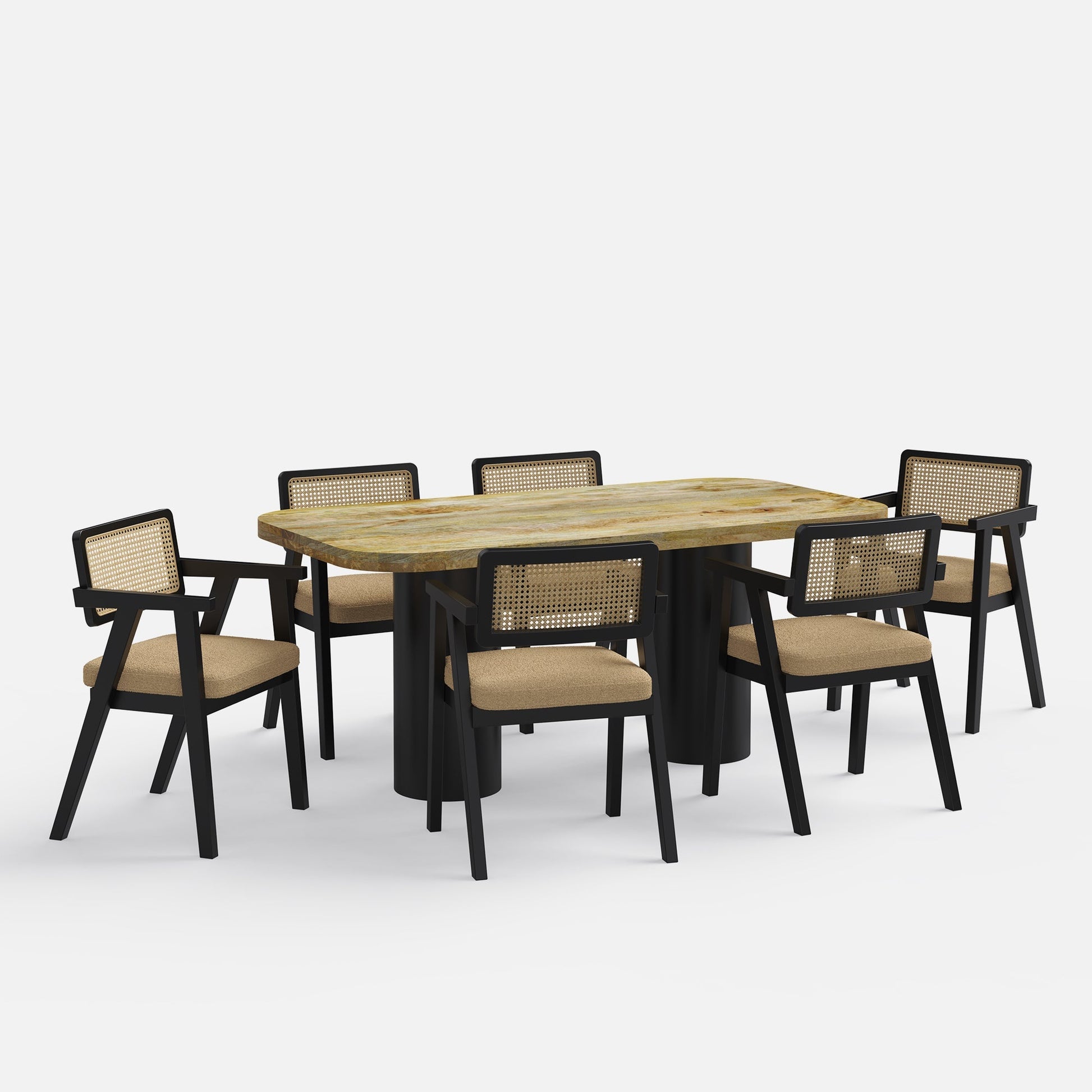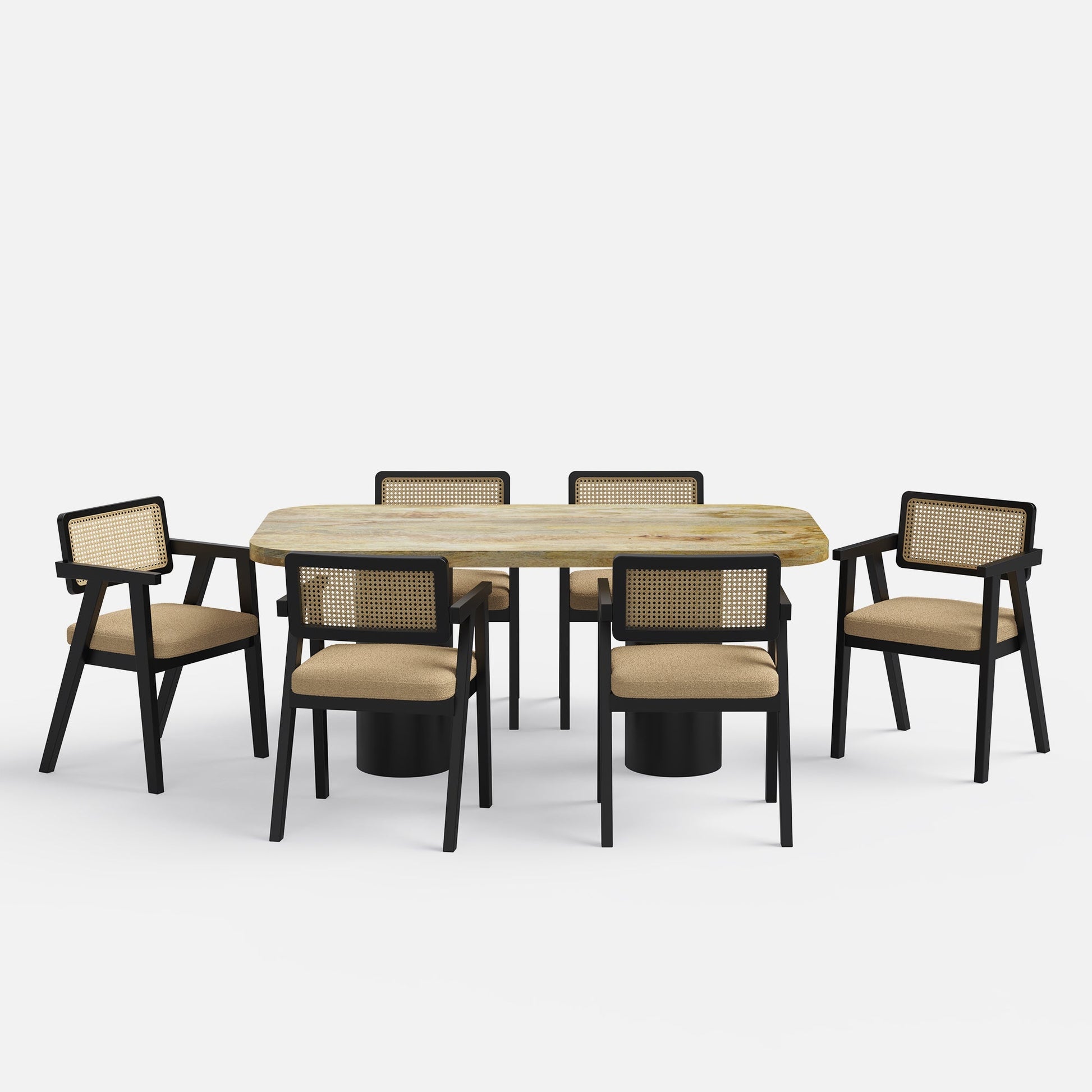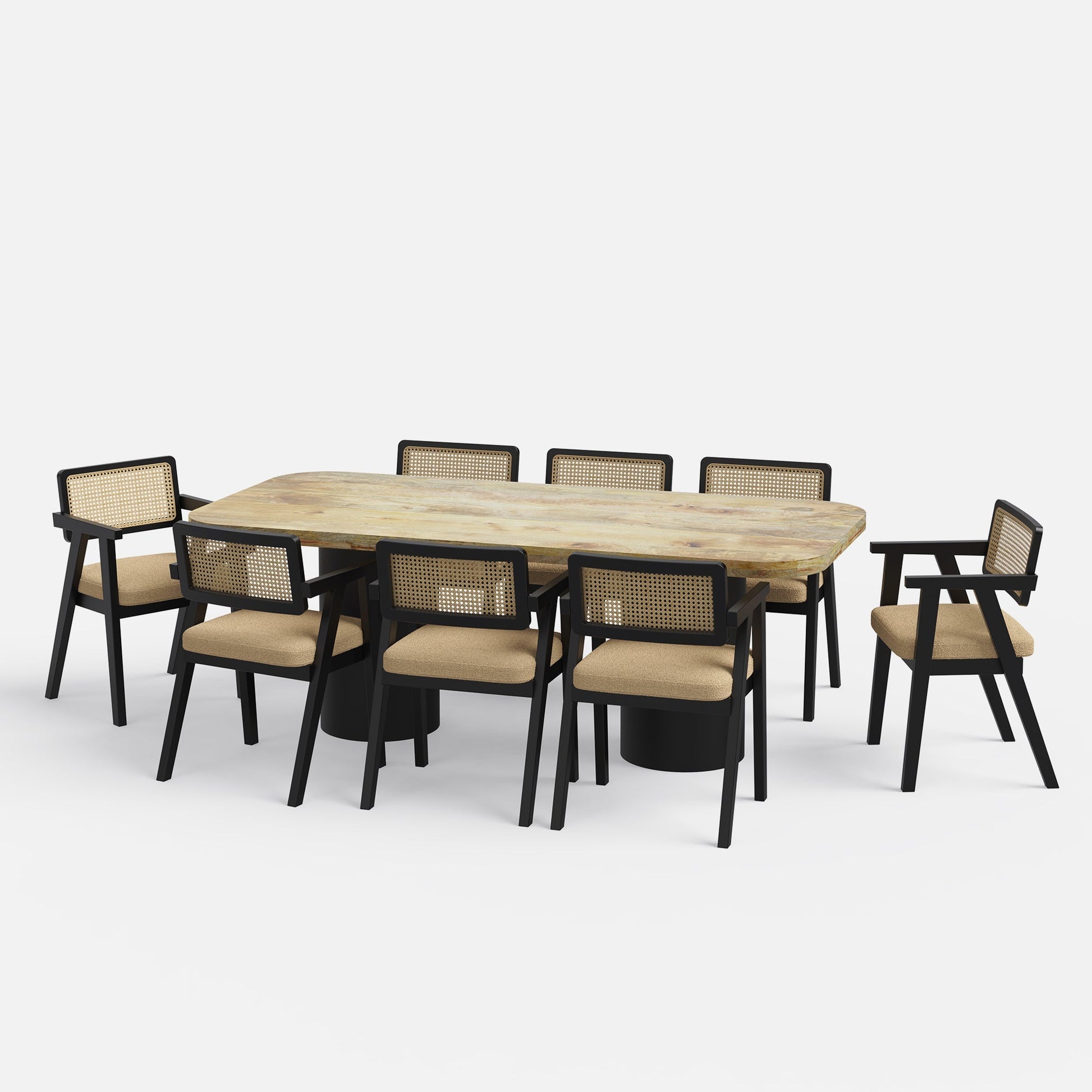 Introducing the "Alba-Bob Dining Table Set - 6 & 8 Seater/All Sizes," a perfect fusion of modern design and classic craftsmanship. The Alba Table features a rectangular design with a flat top and rounded edges, complemented by cylindrical broad legs in mango wood with a sleek black matte finish and a natural finish tabletop. Paired with Bob Chairs, inspired by Pierre Jeanneret, these feature a rattan cane weave back, comfortable Cookie Boucle fabric upholstery, and a matte black finish.