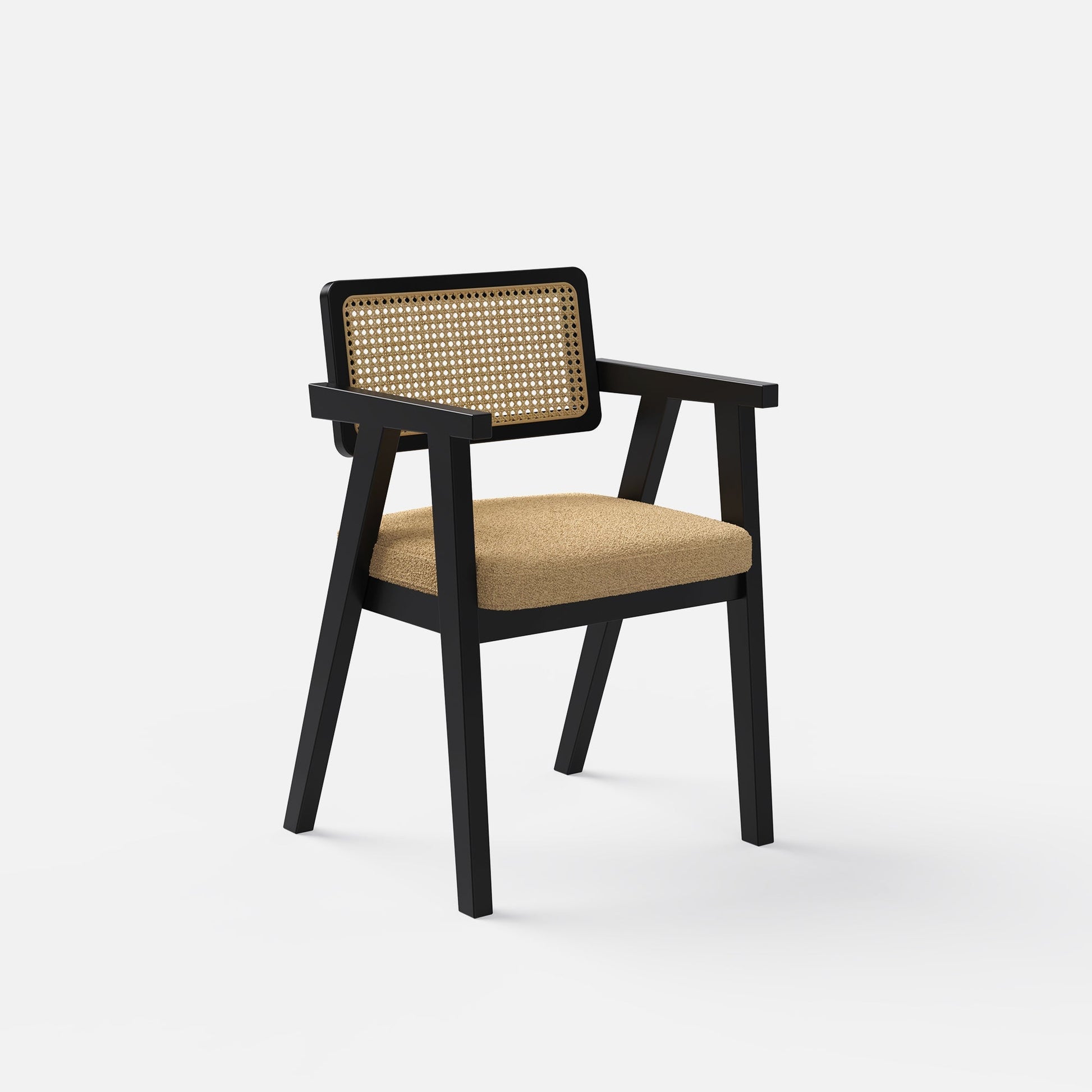 Bob Chairs with rattan cane weave back and Cookie Boucle fabric upholstery