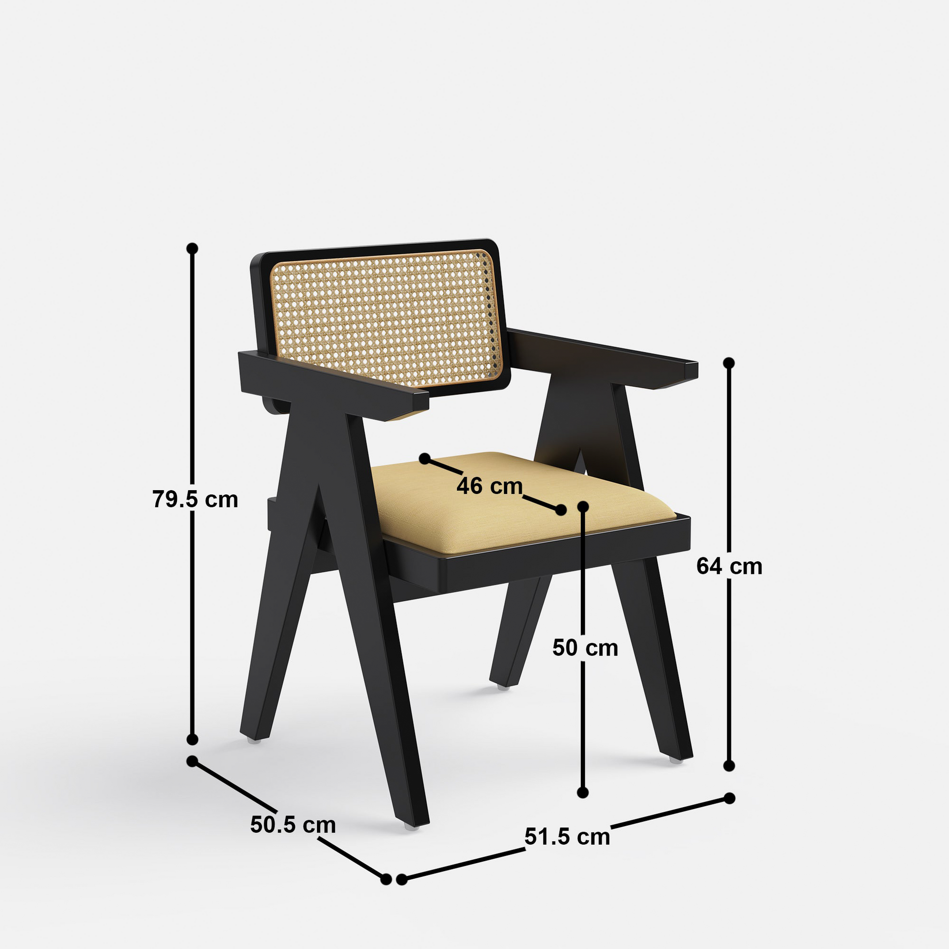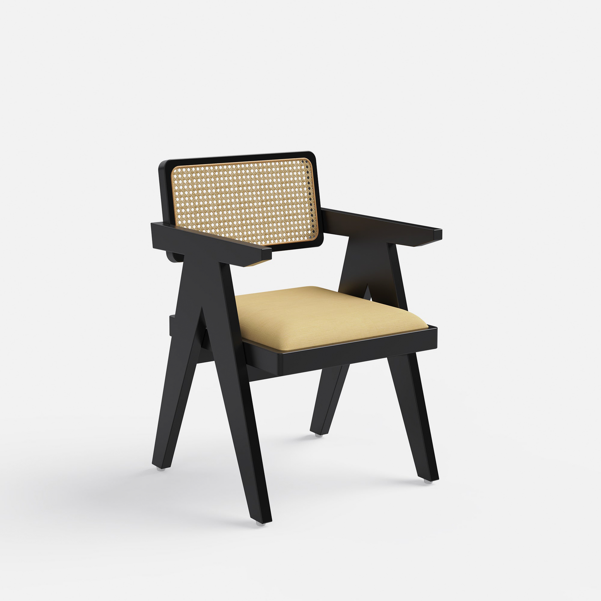 Introducing the "Alba-Pierre Dining Table Set - 6 & 8 Seater/All Sizes," a sophisticated blend of contemporary design and classic craftsmanship. The Alba Table features a rectangular flat top with rounded edges and cylindrical broad legs, crafted from mango wood with a natural finish. Paired with the Pierre Chair, inspired by Pierre Jeanneret, this set boasts a rattan cane weave back and upholstered seating in amber yellow cotton blend fabric, with a matte black finish on Sheesham wood.