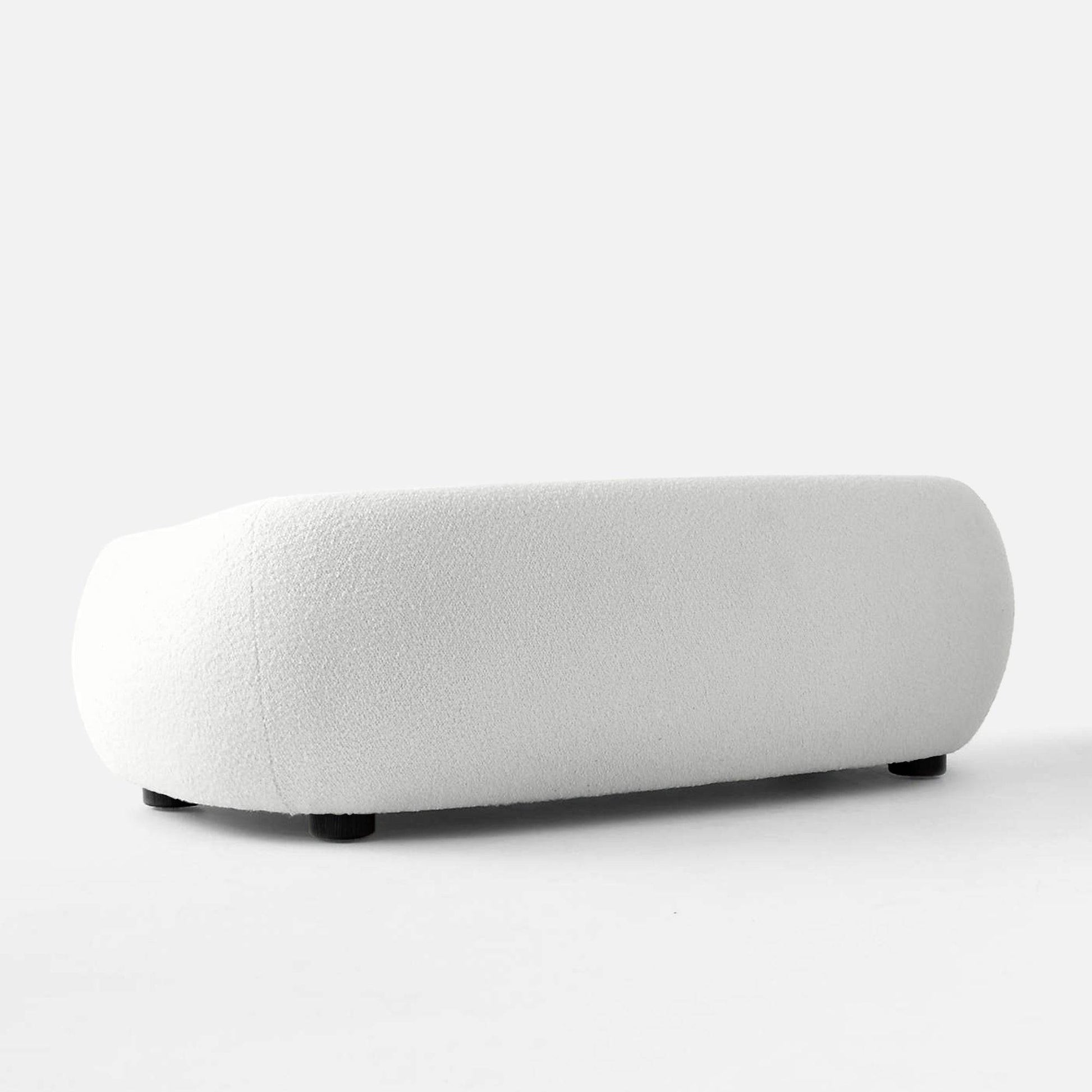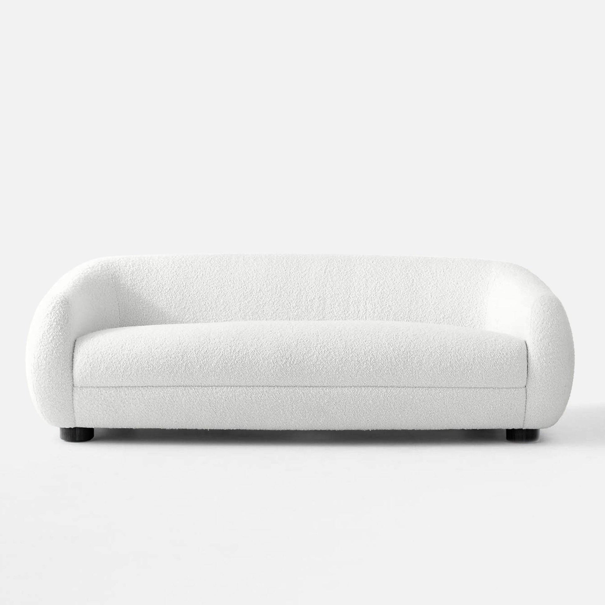 Introducing the Amor 3 Seater Sofa - 80", a perfect blend of comfort and style. The design features boucle fabric in pastel hues on a loungeable sofa, with a curved back that hugs a generously cushioned seat. The texture-rich custom boucle in Lilia White Color offers a uniquely fluffy hand for an ultra-plush sit. Plush boucle fabric and soft foaming make it one of our most comfortable sofas.
