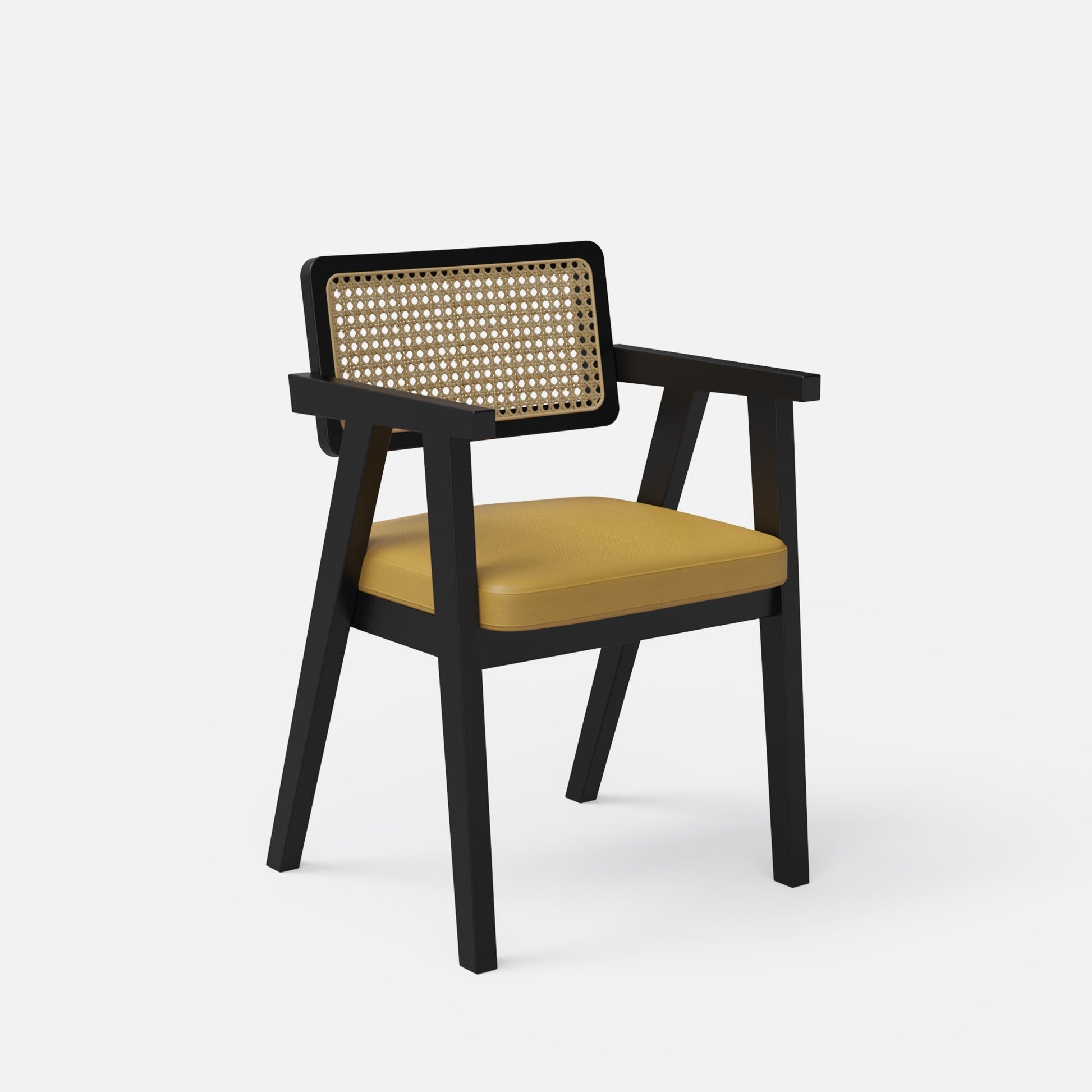 Bob chairs with mustard vegan leather upholstery and rattan back