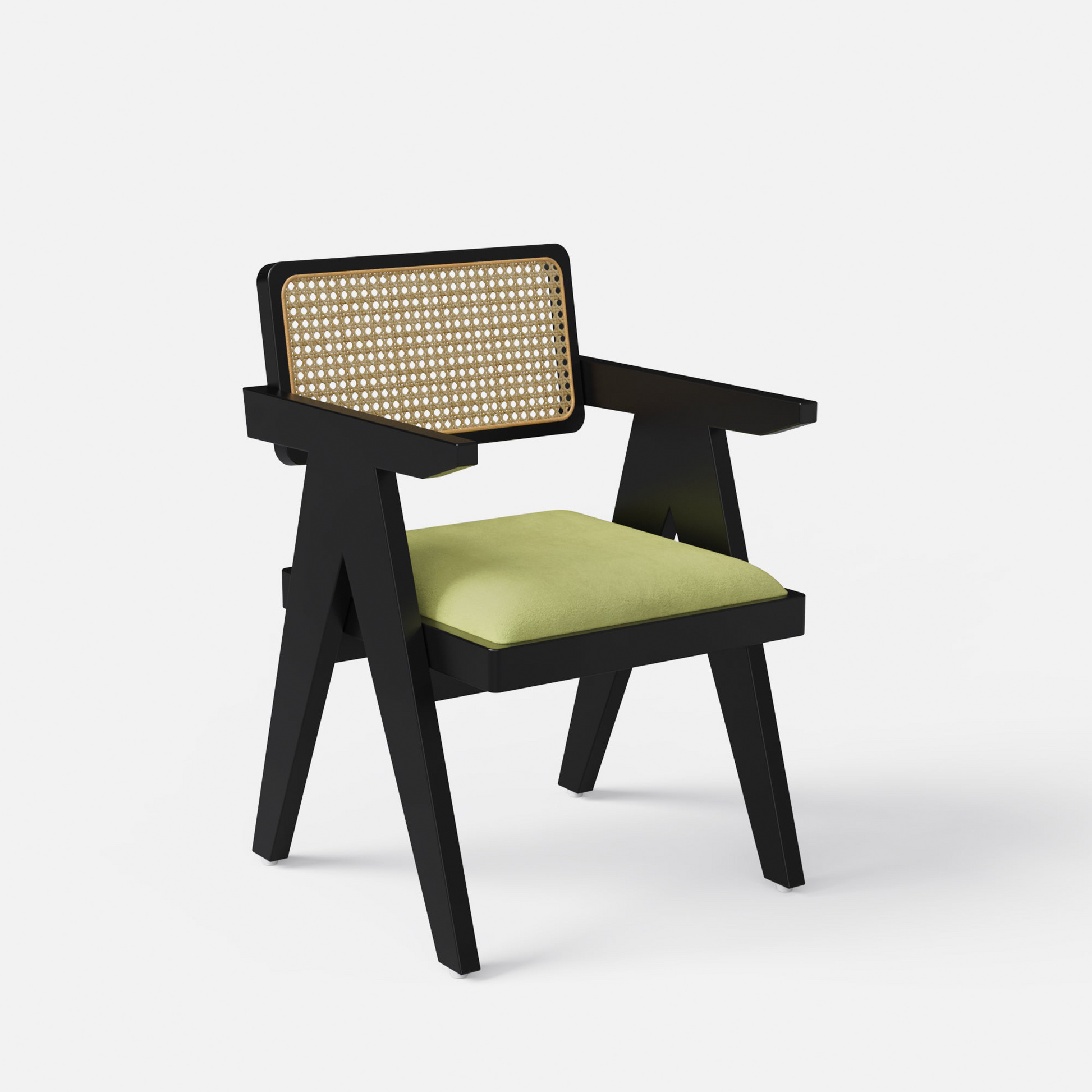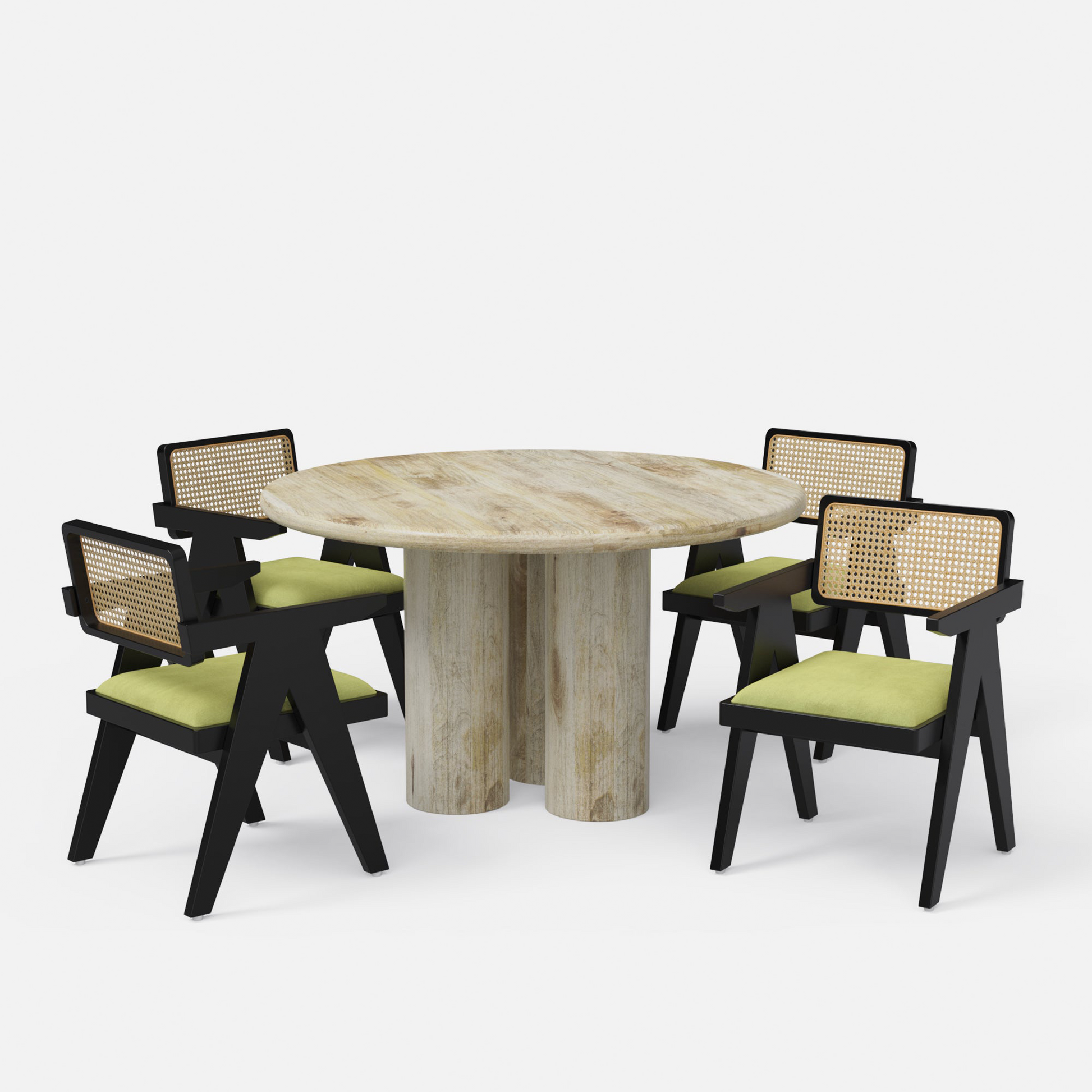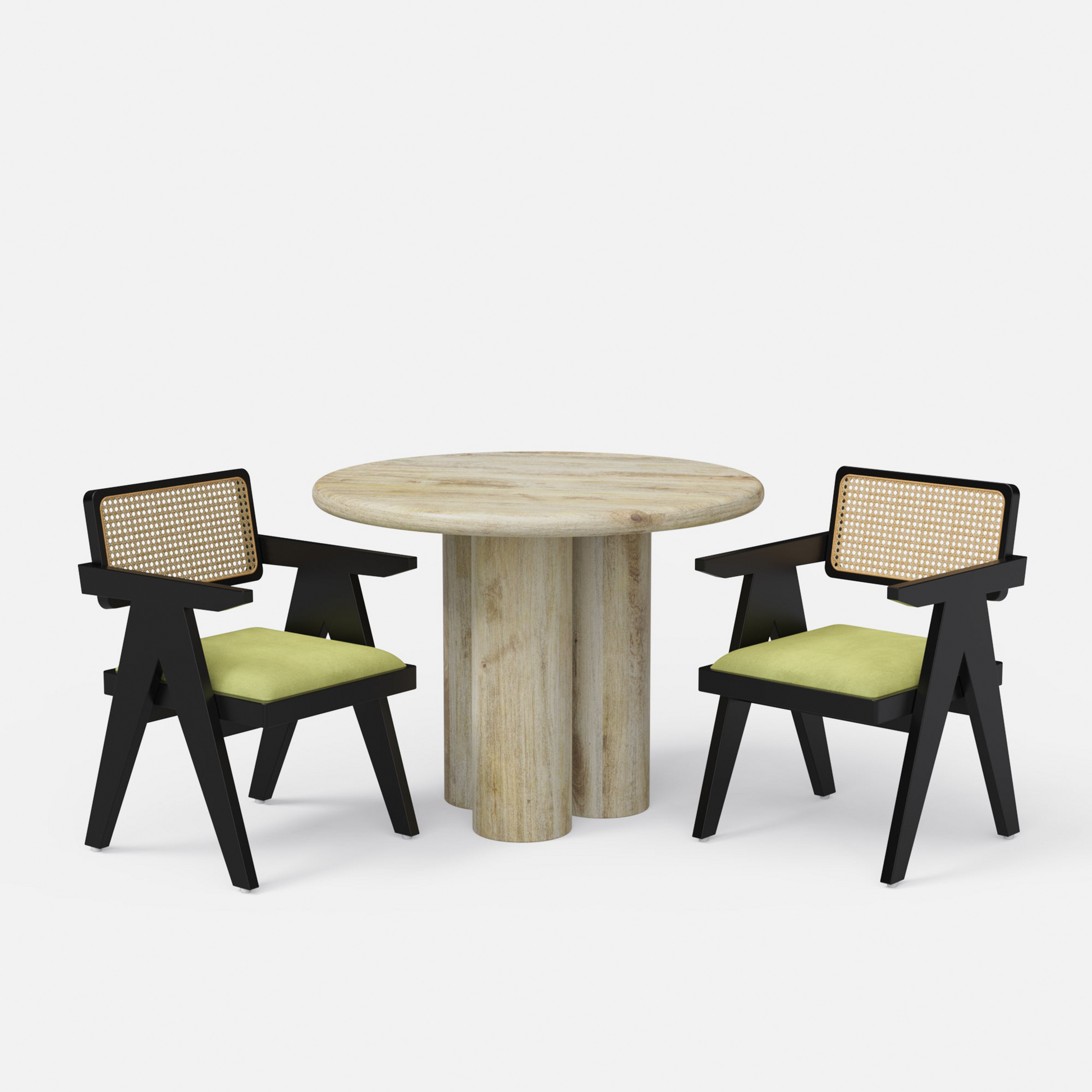 The "Amor-Pierre Dining Table Set" blends contemporary design with vintage charm. The Amor table features a round top with a unique triangular pedestal base, crafted from mango wood in a Bleach Teak finish. Paired with Pierre chairs, inspired by Pierre Jeanneret's iconic design, the chairs feature a rattan backrest and plush Olive Green Velvet upholstery for ultimate comfort. The Black Matte finish on the Sheesham wood frame complements the set's sleek, handcrafted aesthetic, offering soft foaming and superior seating comfort.