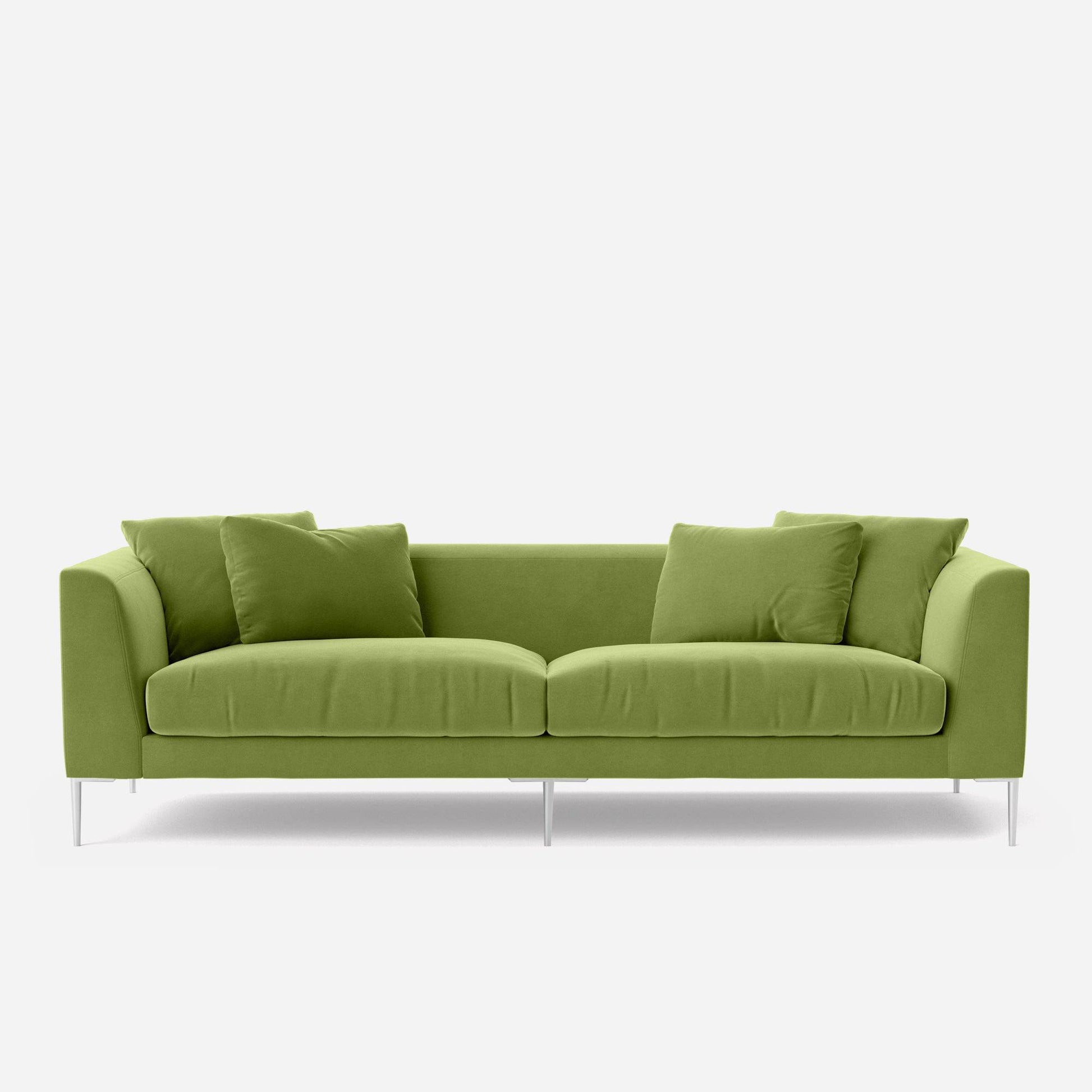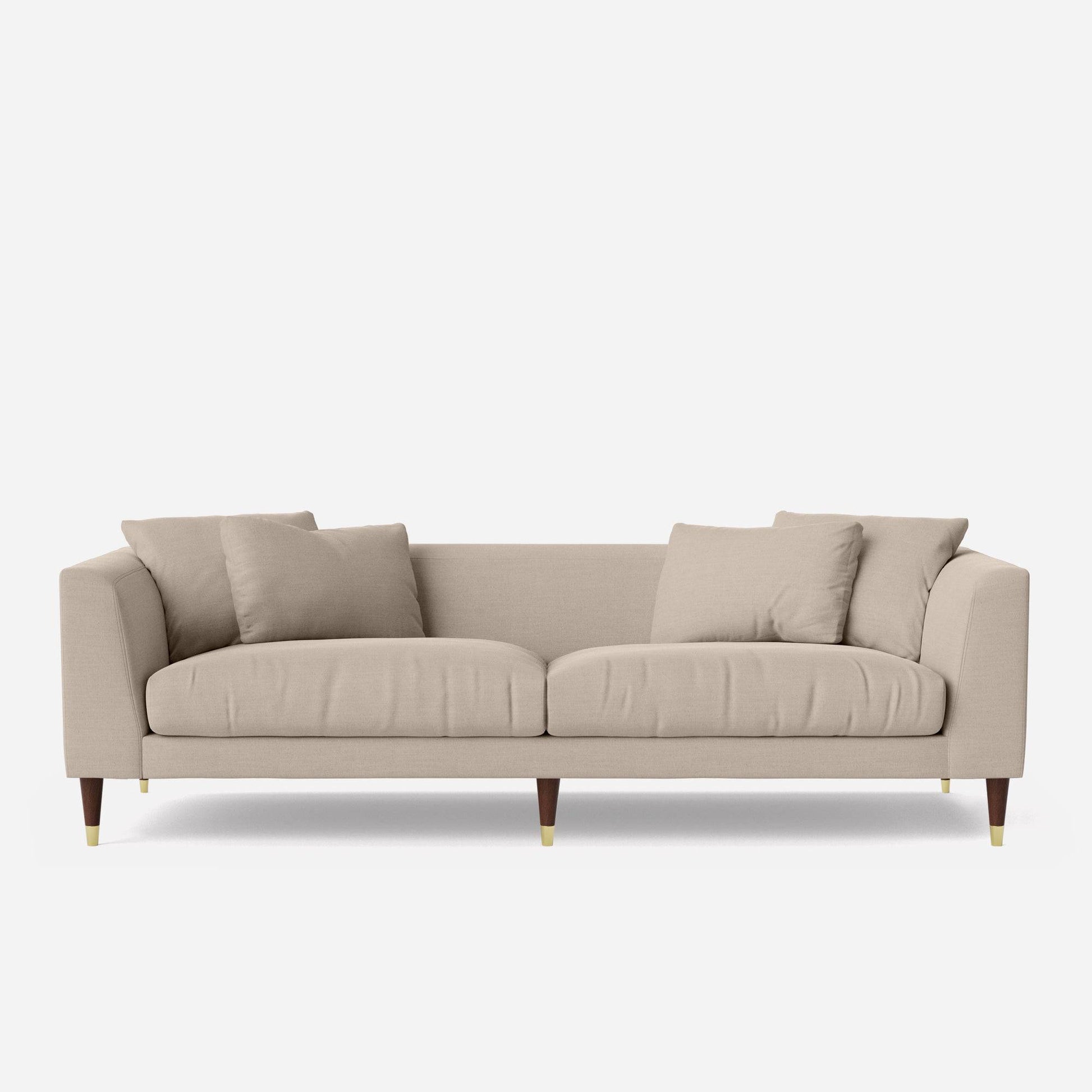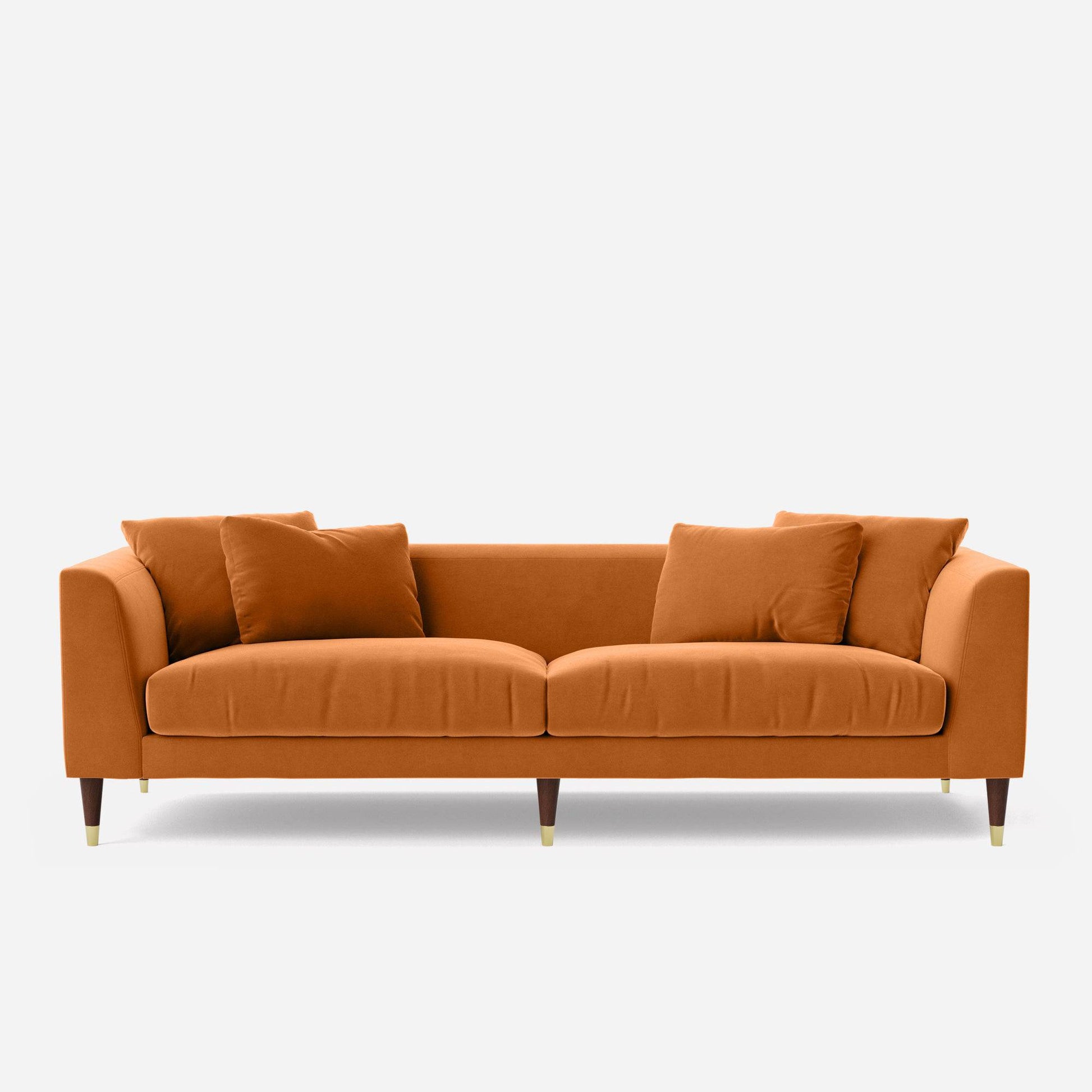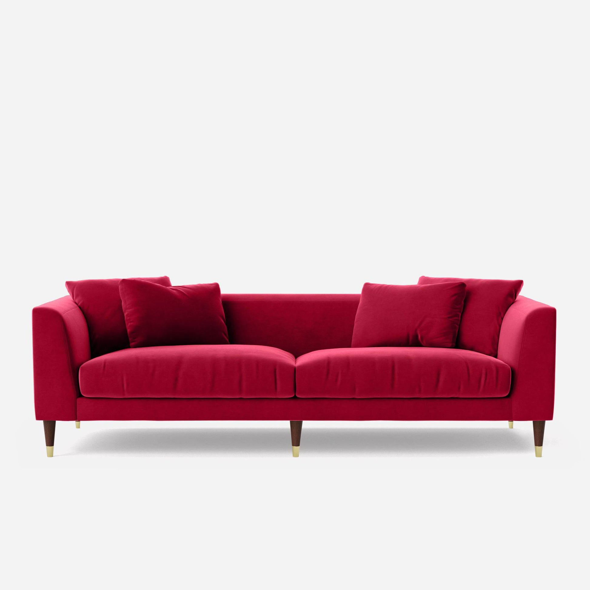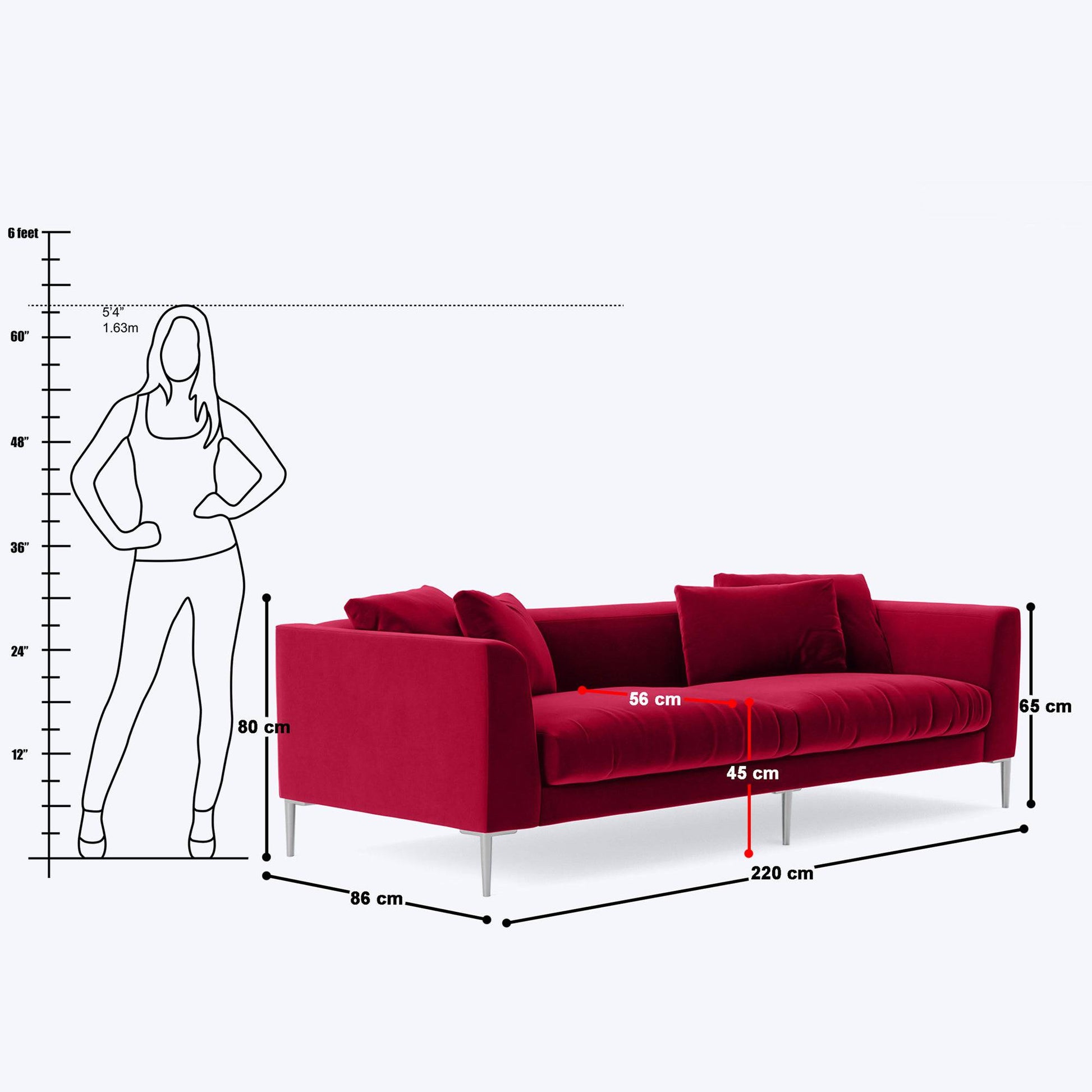 Introducing the Brian 3.5 Seater Sofa, a perfect fusion of comfort and customization. Measuring 85 inches, it's spacious enough for everyone. Brian's design features bouncy, sink-into seat cushions and broad, elegantly curved arms for ultimate relaxation. What sets Brian apart is its customizability, with various leg styles from wooden to metallic and a range of finishes to perfectly match your chosen sangria red soft velvet upholstery. Create a sofa that's uniquely yours, blending comfort and style effortlessly.