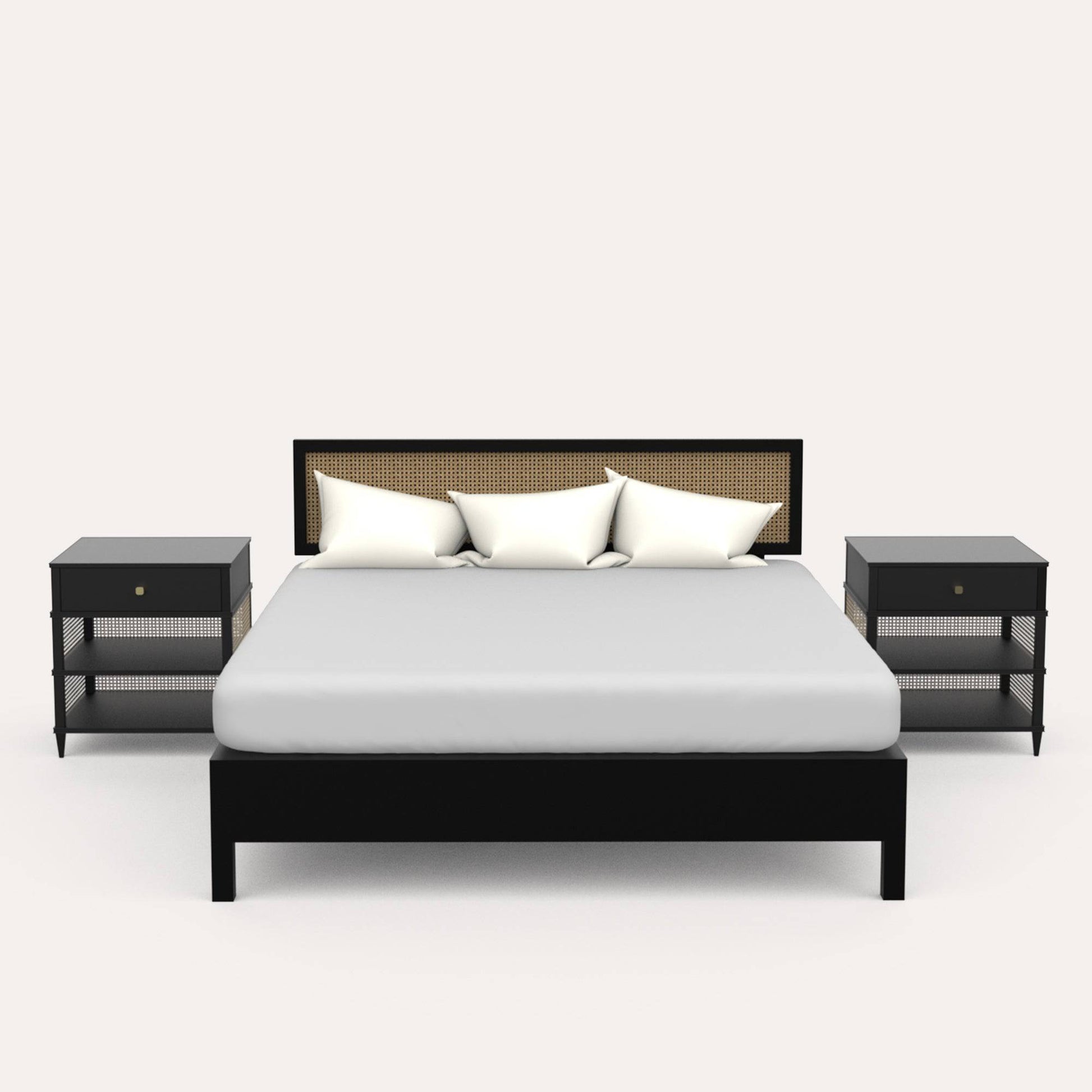 Materials Used: Please note the product - California Bed is in Solid Mango Wood with Natural Rattan Caning. The Side tables are in Solid Mango Wood as well - Both Finished in Black Matte Stain. Pattern and tone on wood might differ slightly from item to item.