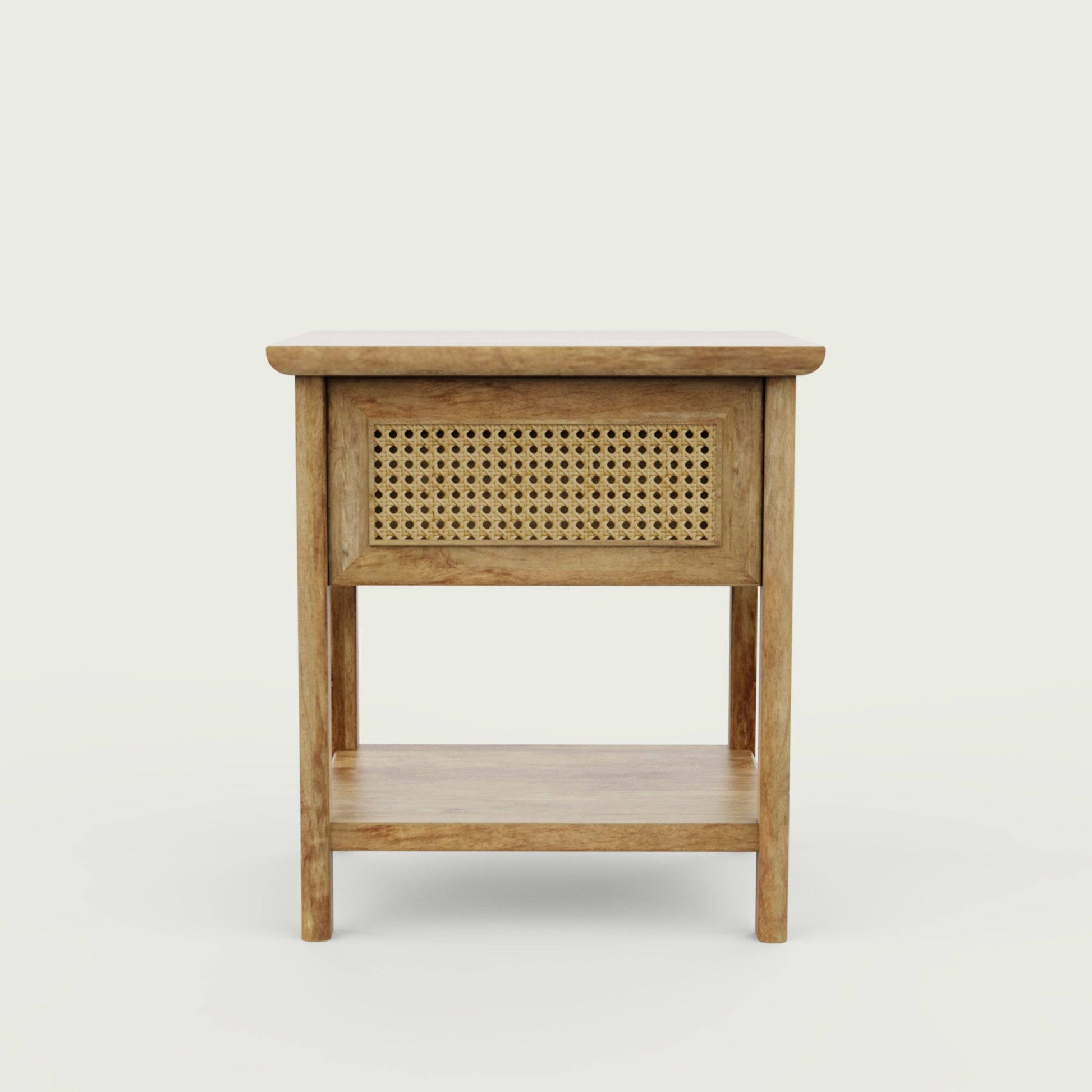 This side table is both spacious and elegant. In natural mango wood finish and with rattan cane work in the front, this pairs well with Rattan beds (Chantel Bed) as well as solid beds to give the decor a nice quaint and light vibe. It features a drawer and a storage space below.