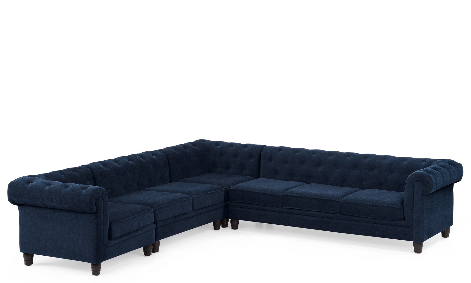Neatly tailored to perfection, this alluring sectional sofa features an impressive rolled back and arms with sumptuous seat cushions for extra comfort. A captivating centerpiece for your living room, the sturdy solid wood structure is elevated on well-rounded bun feet.