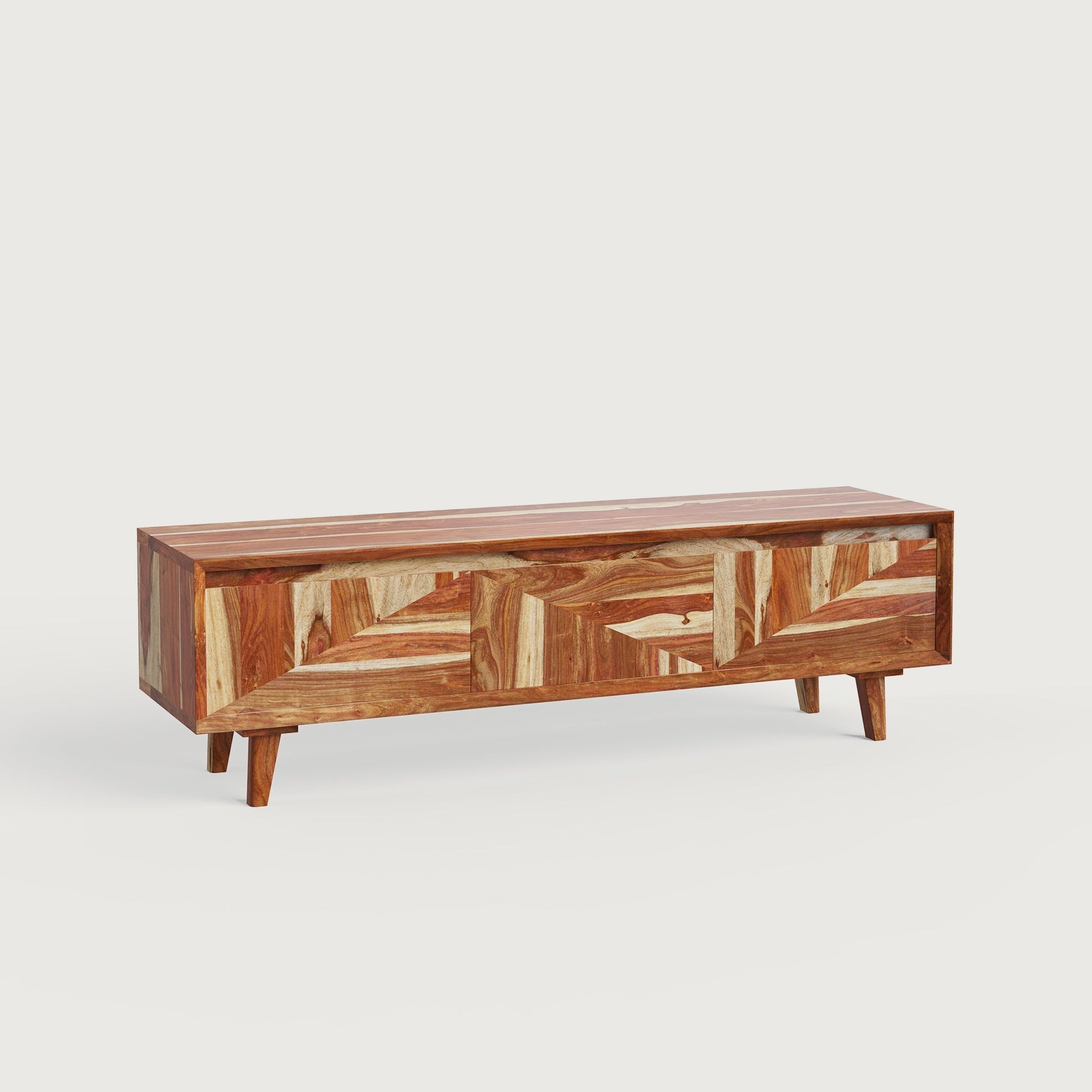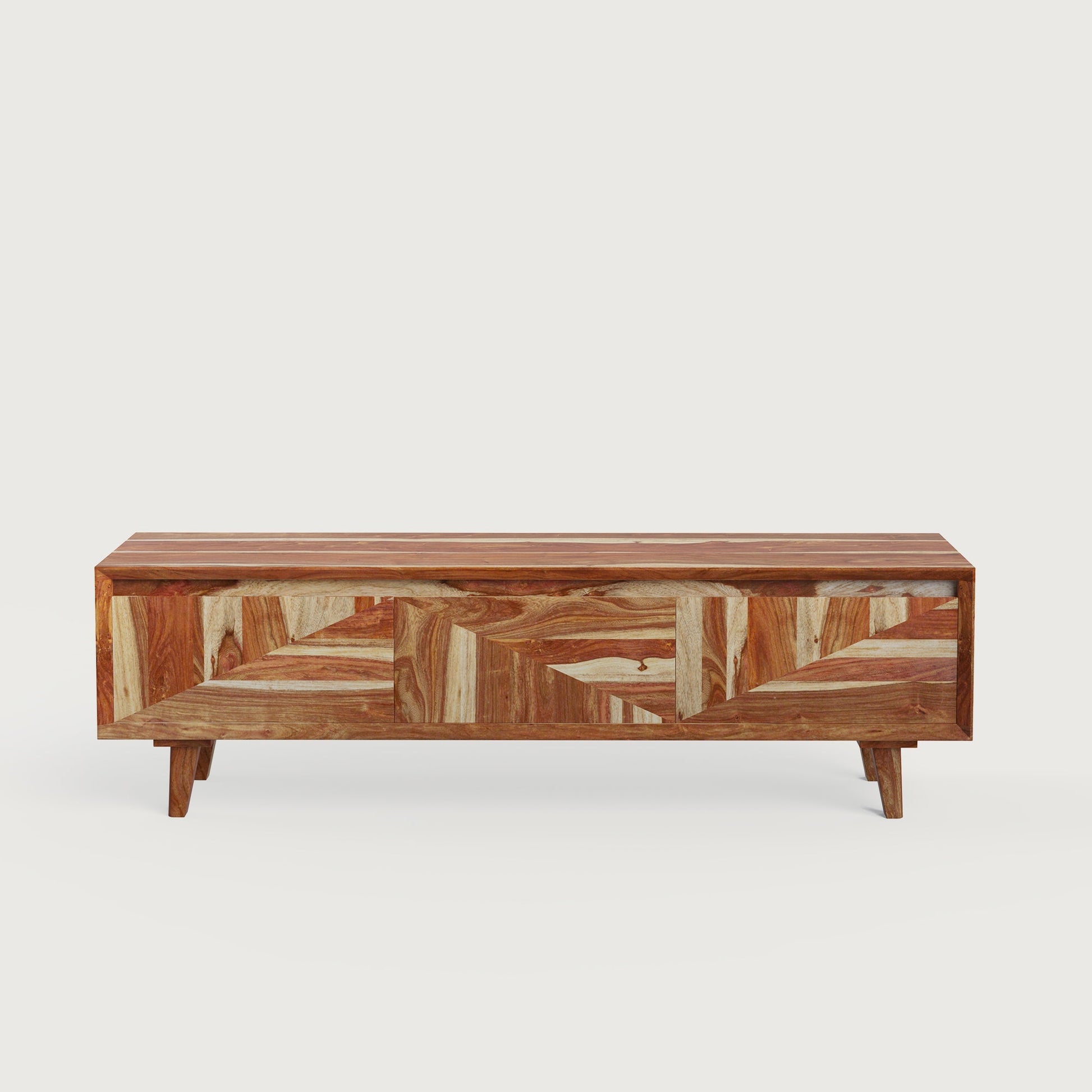 Introducing the Cliff TV Unit Console, a harmonious fusion of classic Scandinavian elegance and contemporary flair. Crafted from exquisite sheesham wood with a Natural polish and parqueted fronts, this console exudes sophistication. Its design seamlessly blends classic and modern aesthetics, featuring round, tapered solid wood legs.