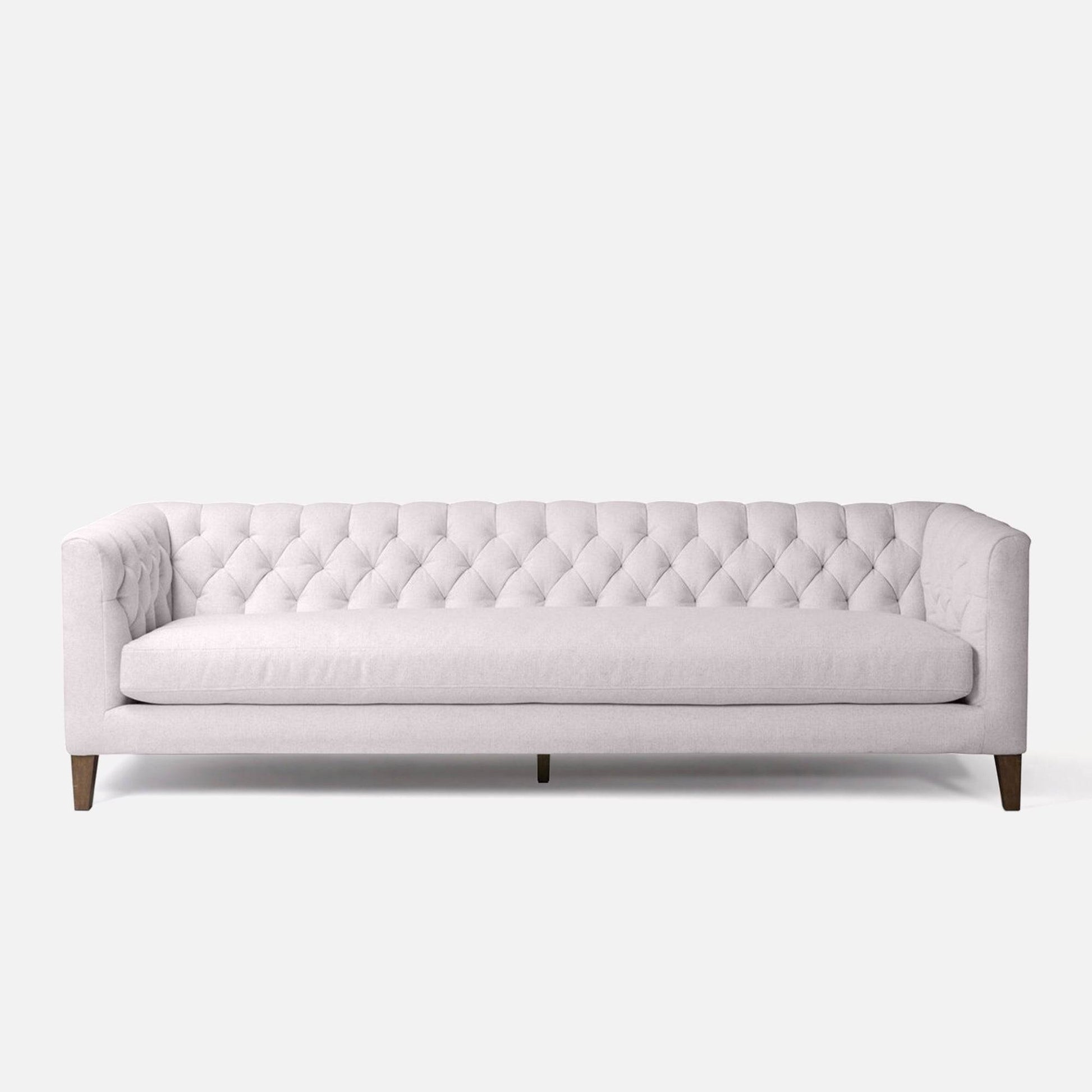 Introducing the "Cruz 4 Seater Sofa - 96"," a testament to midcentury elegance and comfort. This handcrafted sofa features a diamond tufted back and arms, enveloped in smooth high-quality 100% Cotton Fabric in Light Ash Grey. Its design ensures both durability and a soft foaming, offering comfortable seating for lounging.