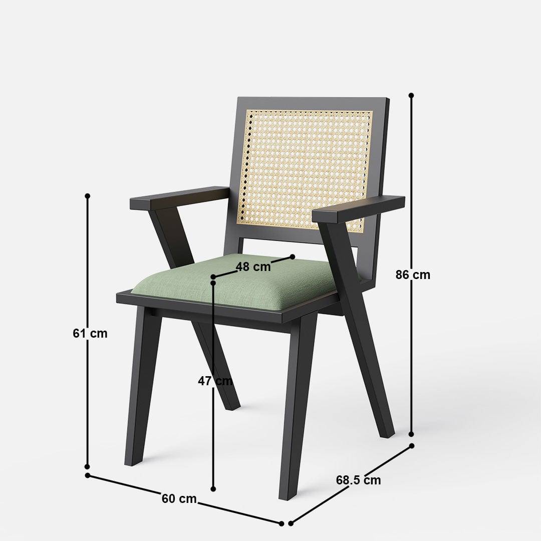 Experience classic Scandinavian elegance with the Dido Luxury Dining Table set. Its sleek design, robust construction, and exquisite black metal detailing illuminate your dining room with unmatched allure. Meticulously crafted from solid mango wood, the table's durability and resilience stand out against wear and tear. The slanted legs imbue the design with a unique and elegant touch. Complementing the set, the Flora chair boasts an inverted V leg design, fashioned from Sheesham wood, and features a natural cane woven back support with an upholstered seat, evoking a delightful sense of nostalgia.