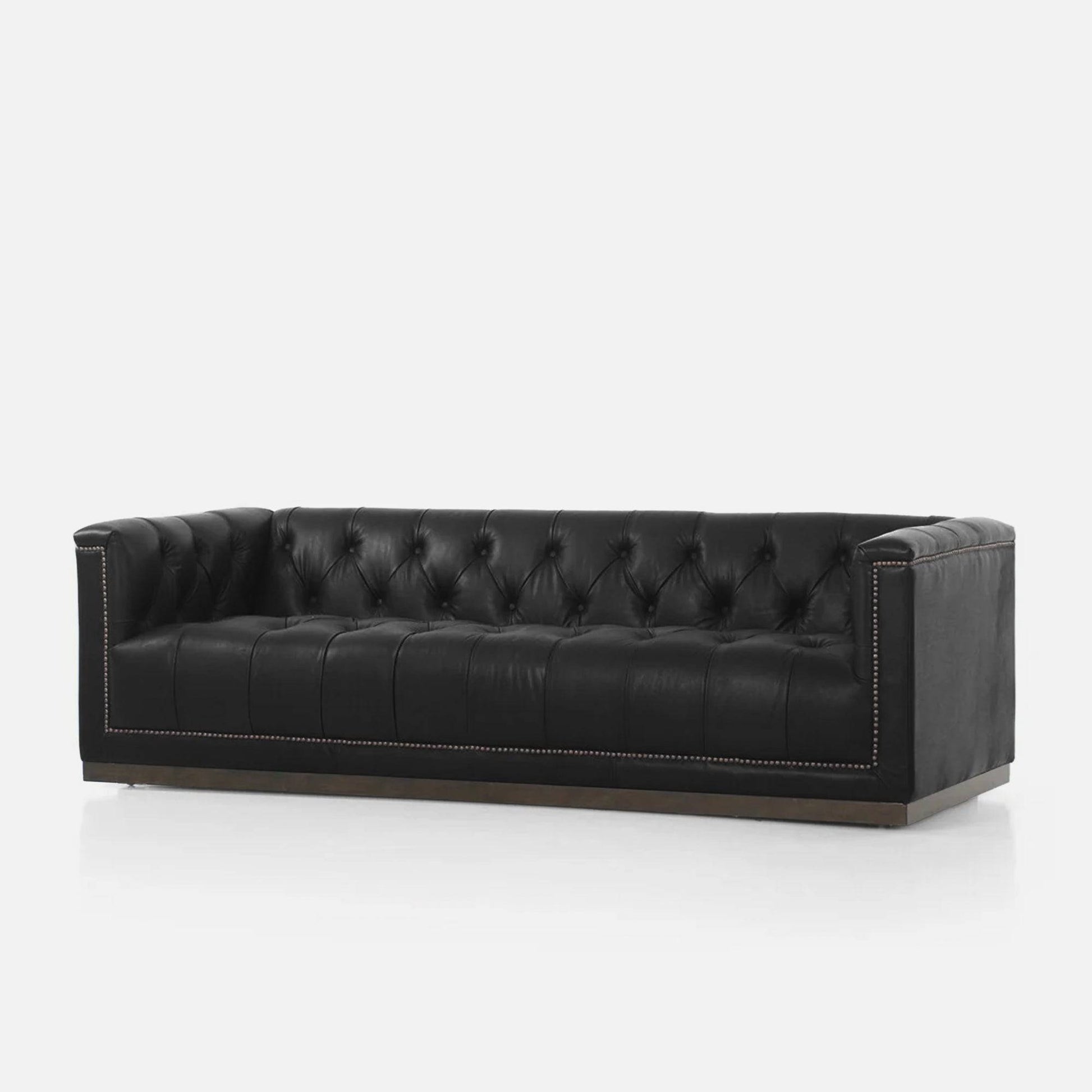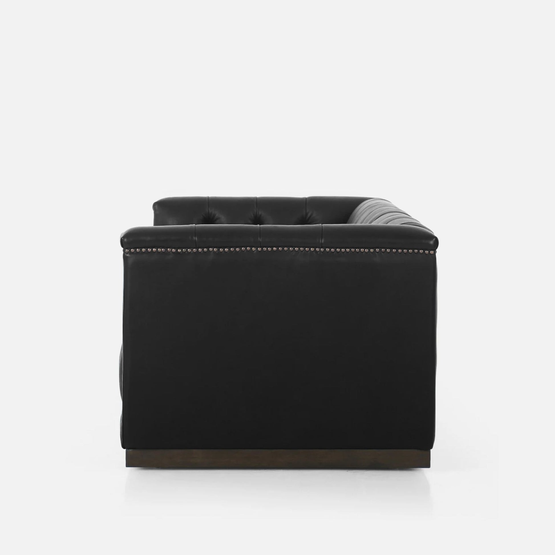 Introducing the "Diego 3 Seater Sofa - 84"," a blend of classic sophistication and modern flair. This creative interpretation of the library sofa boasts a slightly textured Vegan leather upholstery in Lead Black, complemented by aged bronze nailheads for a touch of modernity. Mounted on a solid wood base, it is handcrafted to perfection, ensuring durability and style. Soft foaming provides comfortable seating, making it an ideal addition to any living space.
