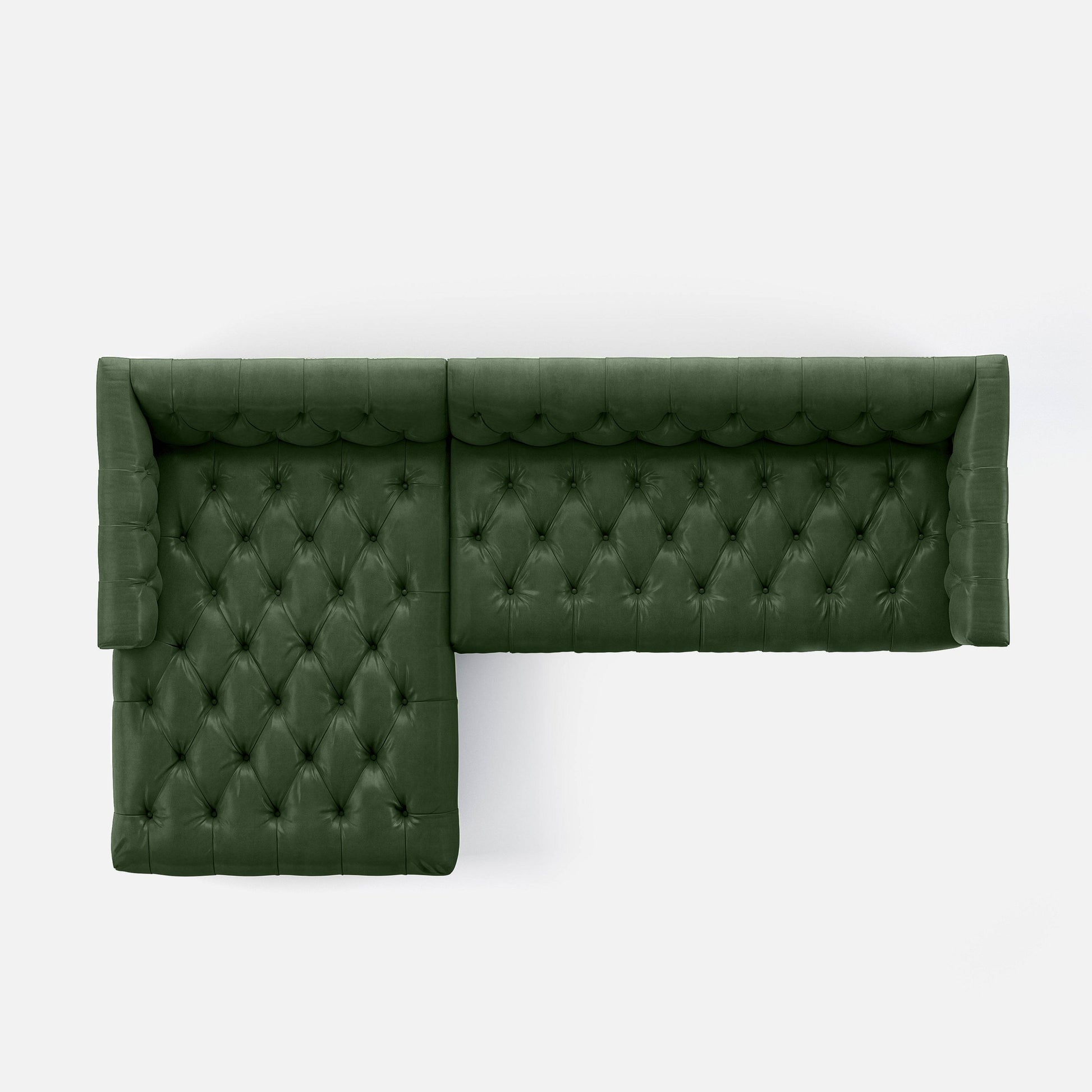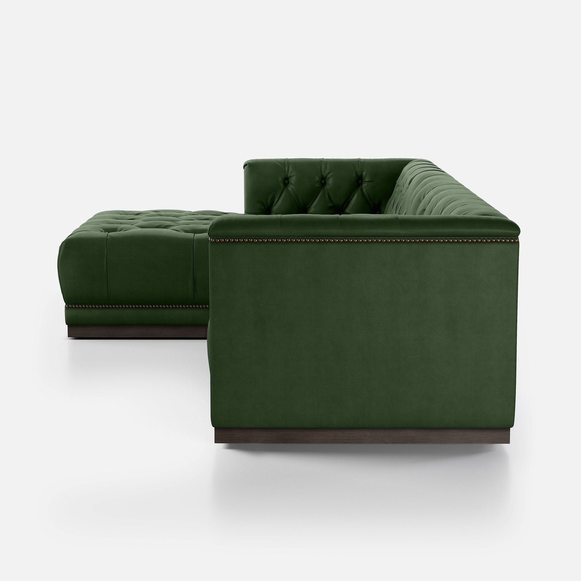 Introducing the Diego L Shape Sofa - 108.5", a blend of timeless design and modern functionality. This sectional sofa combines the classic library style with contemporary elements. It's upholstered in slightly textured Vegan leather in Forest Green, complemented by aged bronze nailheads for a touch of modernity. Mounted on a solid wood base, this sofa is handcrafted for durability and perfection. Soft foaming ensures comfortable seating, making it ideal for lounging and relaxation.