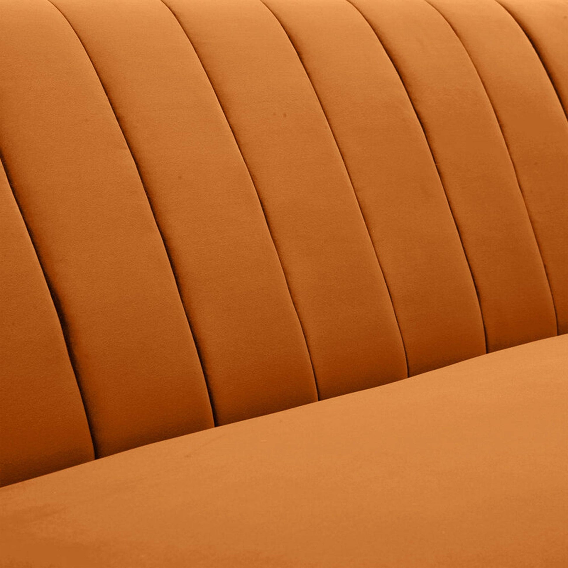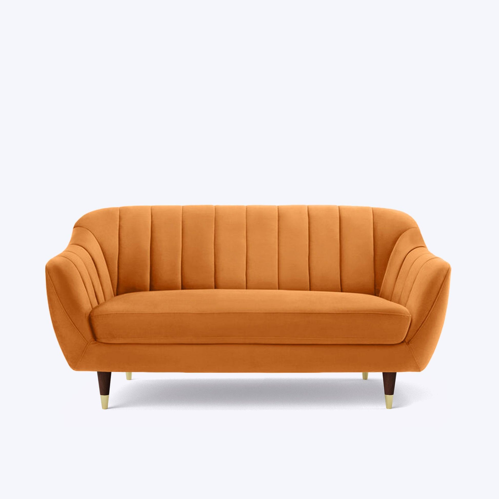Introducing the Emily 2-seater Sofa, a chic and sophisticated addition to your living space. Measuring 60 inches, it offers spacious seating for three. Emily boasts a distinctive flared arm design and a channel tufted backrest that adds a touch of elegance to any room. Supported by robust solid wood legs, this sofa combines style with durability. Draped in a rich Cider Orange soft velvet fabric, it's a statement piece that brings both luxury and charm to your decor.