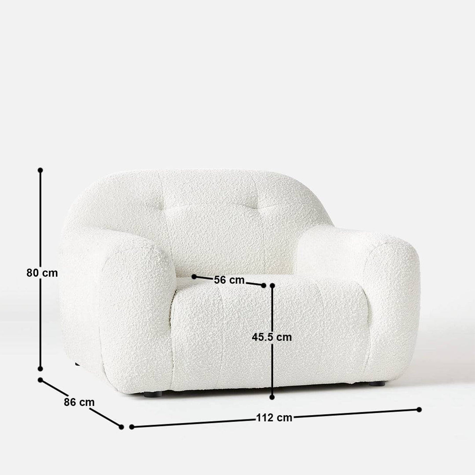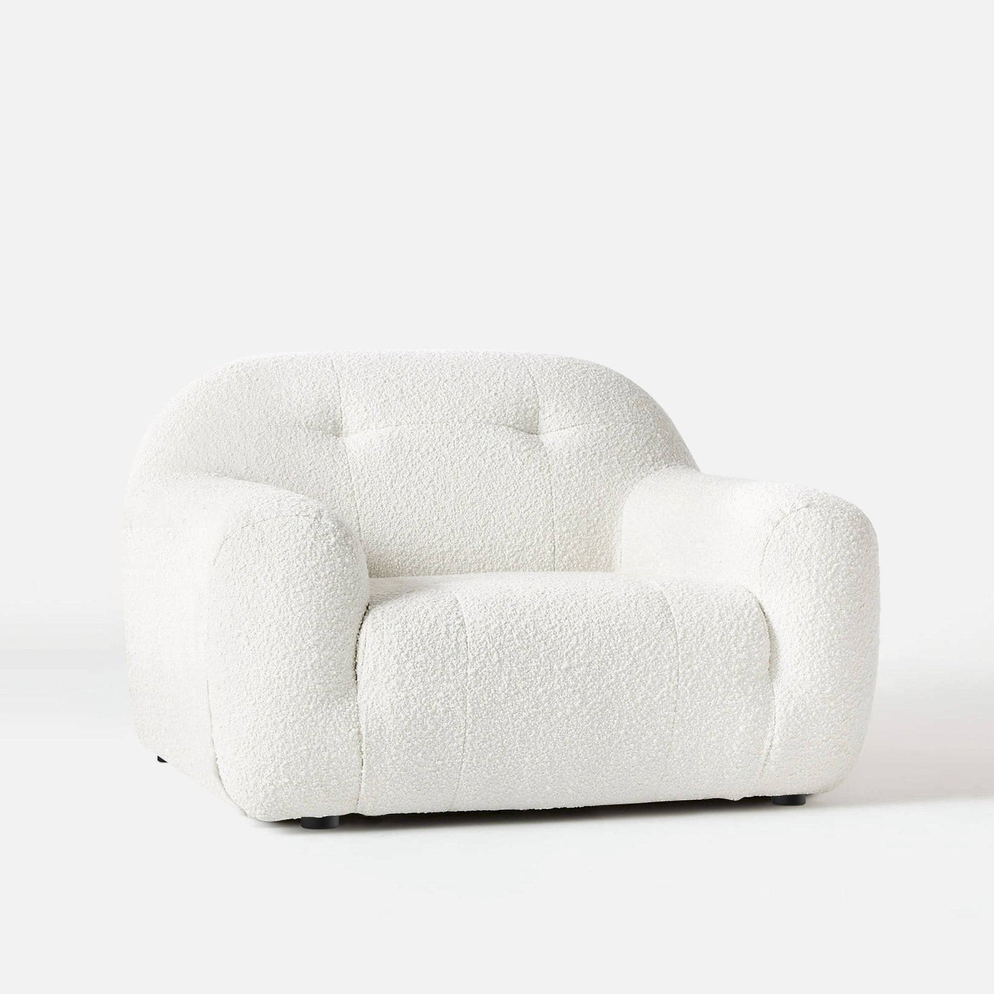 The Fred Accent Chair: A masterpiece of Italian-inspired design that effortlessly blends style and comfort. With its curvaceous form and low, deep seat, sinking into luxury has never been easier. Elevate your space with Fred's elegant silhouette. Crafted for relaxation, it boasts premium Lilia white bouclé fabric upholstery that adds a touch of opulence to any room.
