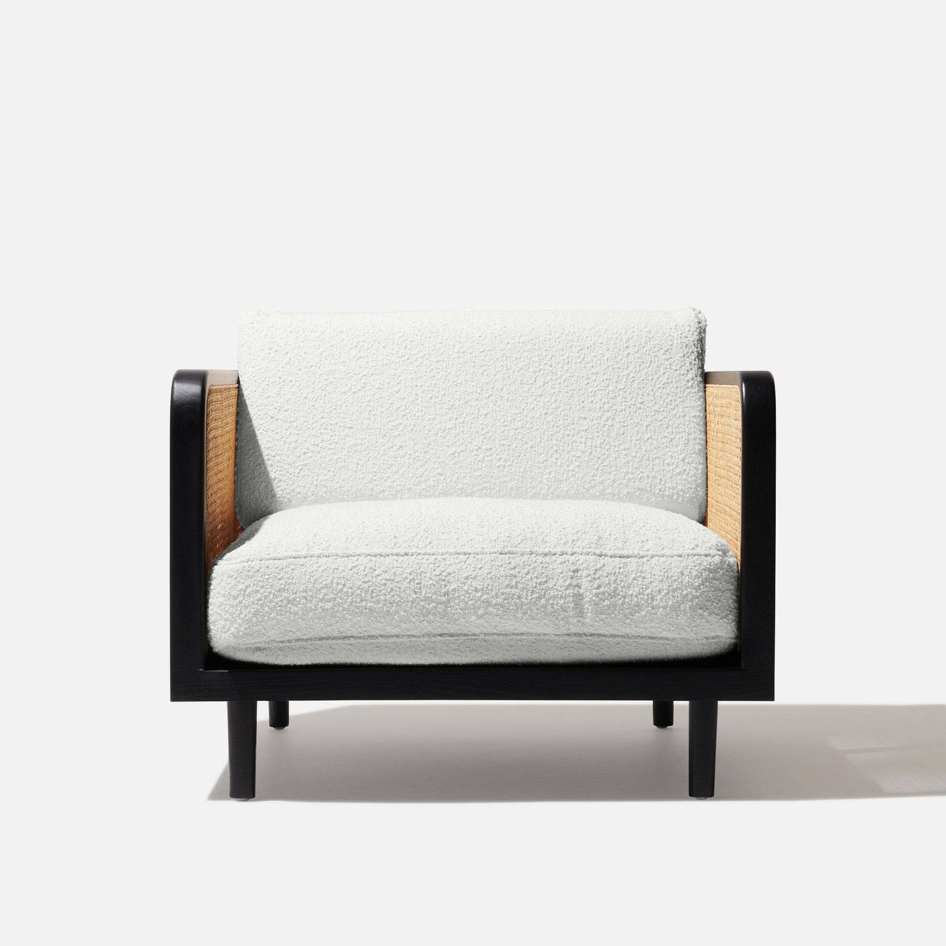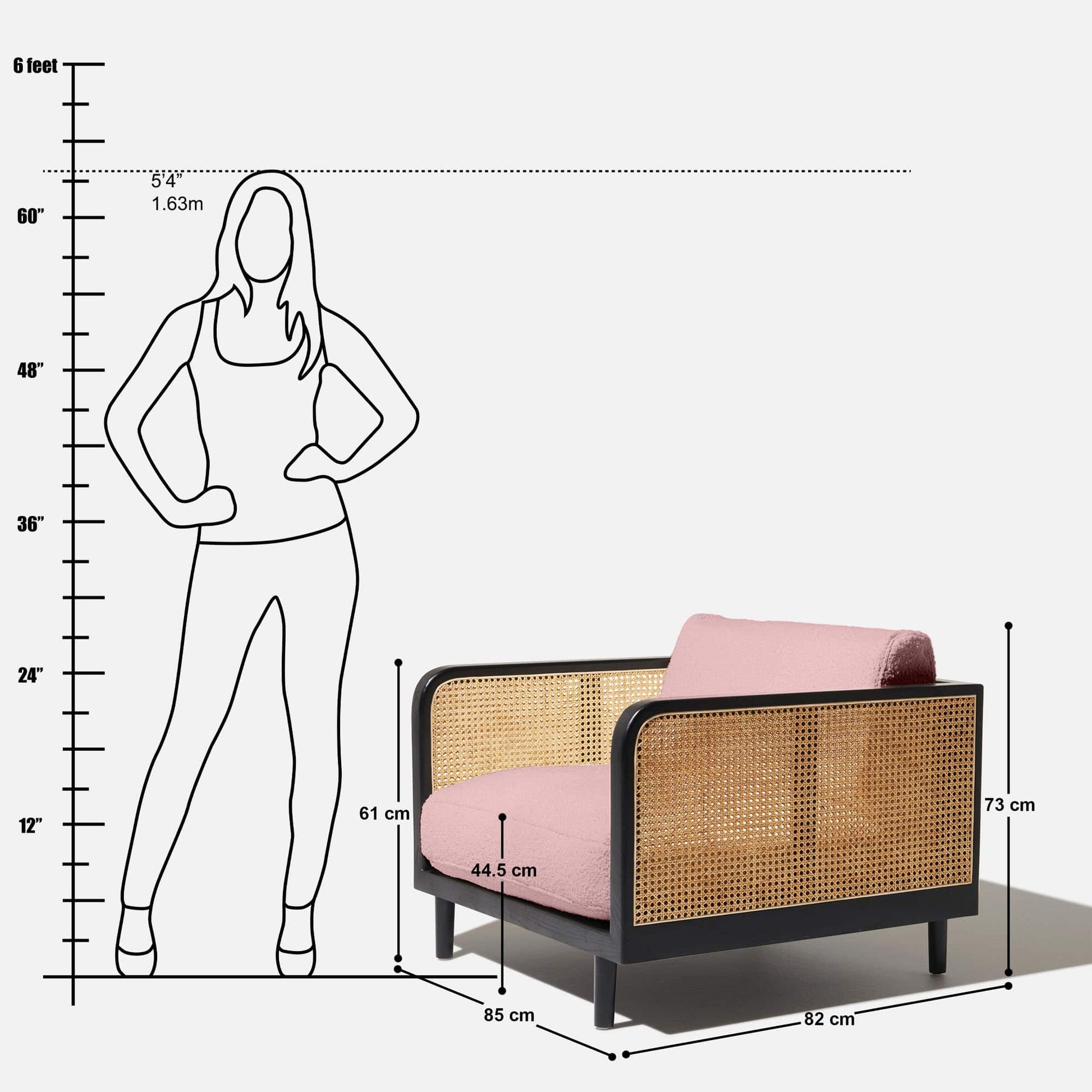 Introducing the "Fry Rattan 1 Seater Sofa - 33.5"," a masterpiece of craftsmanship and comfort. This rattan sofa boasts a sleek frame crafted from Mango Wood with Black Matte Polish, complemented by Rose Gold Boucle upholstery. Handcrafted to perfection, it offers soft foaming for a comfortable seating experience. Available in a variety of wood finishes and fabric colors to suit any decor.