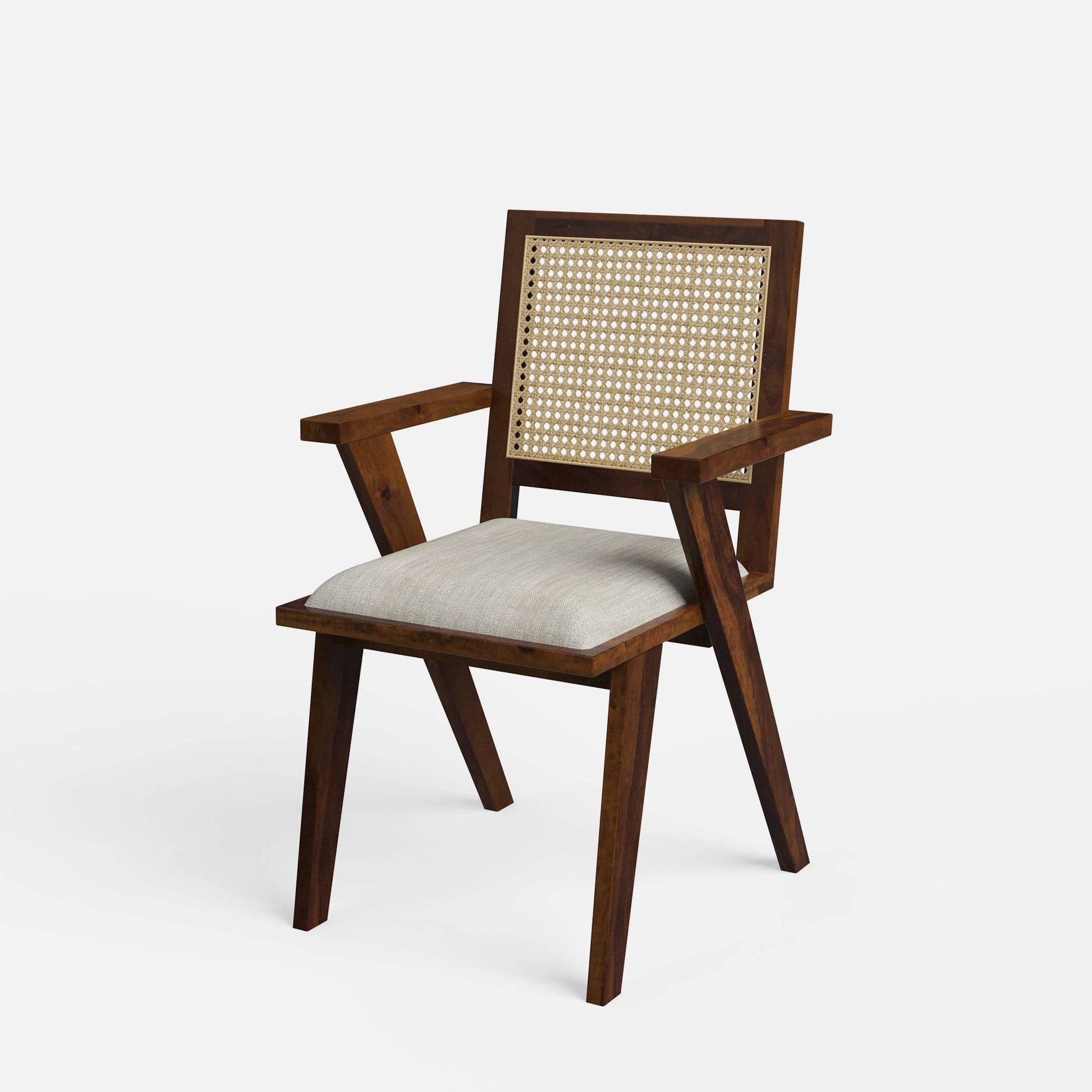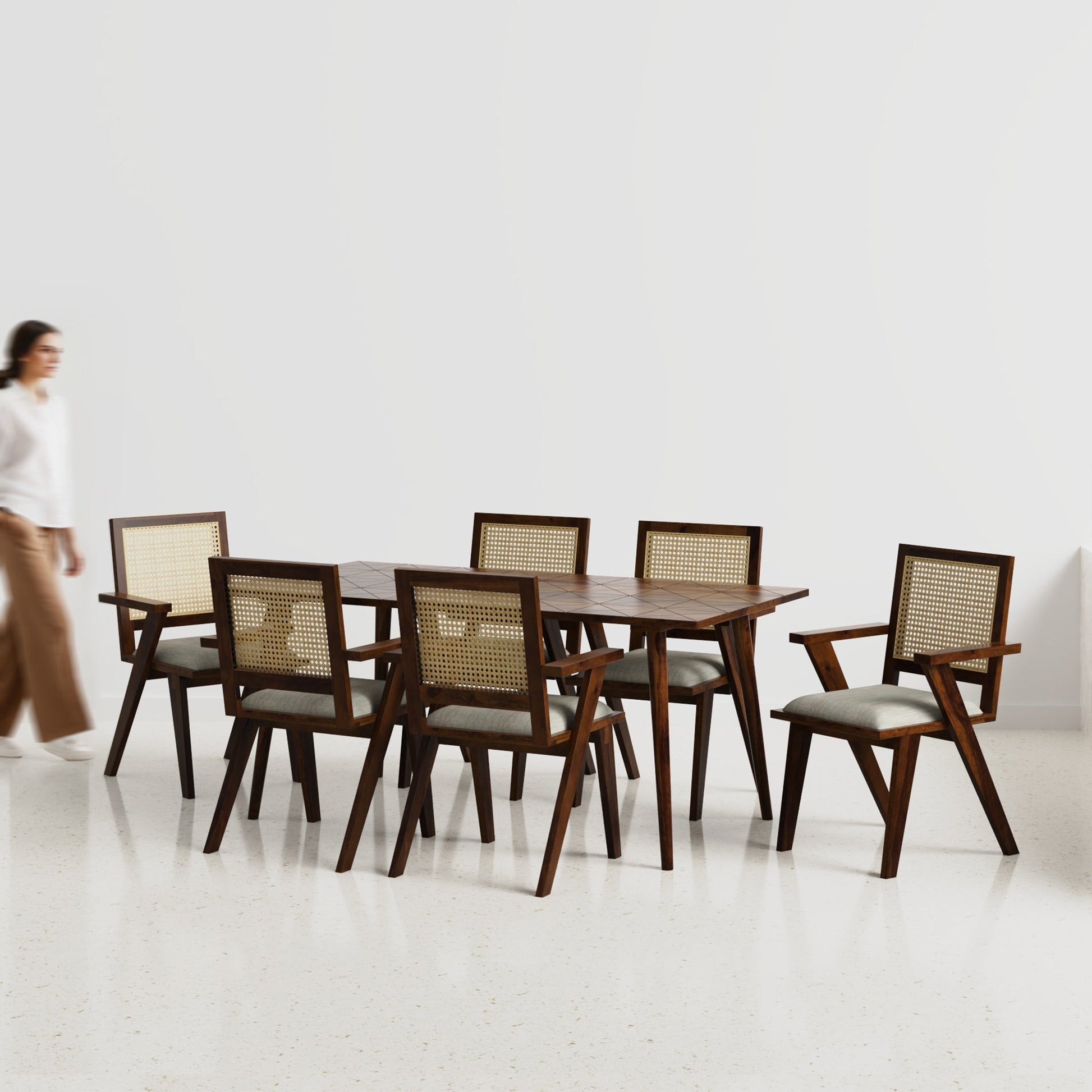 Discover modern Scandinavian elegance with Crafts Mill's Helena Dining Table. Its parquet-finish top and sturdy design hail from the contemporary collection. Paired impeccably with our Flora chairs, their quality craftsmanship enhances your dining experience. The Helena Dining Table, boasting a Walnut Polish on Sheesham wood, showcases a finely crafted parquet top and distinctive slanted legs for unparalleled elegance. With an inverted V leg design crafted from Sheesham wood, the Flora chair features a natural cane woven back support and upholstered seat, adding a touch of nostalgic charm.