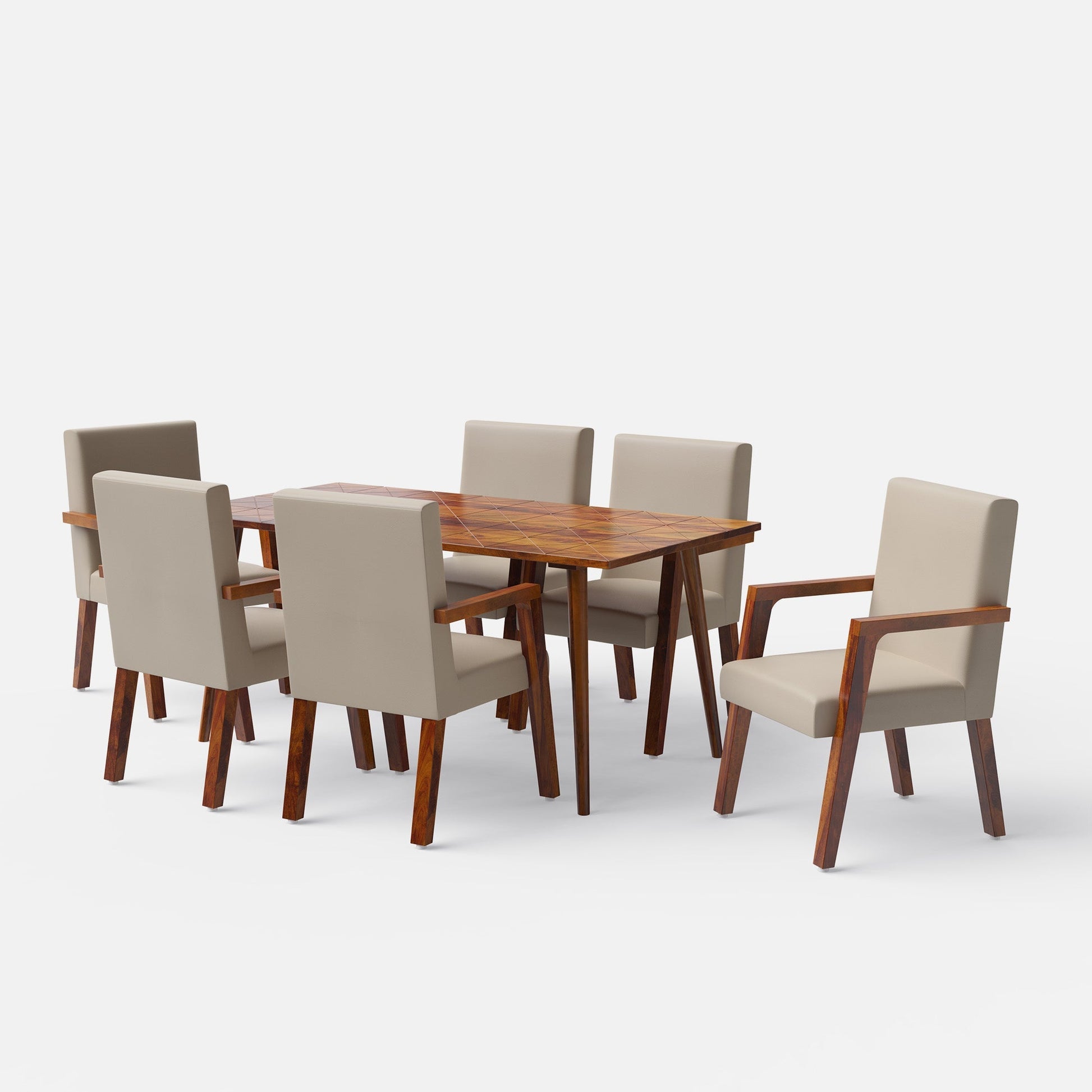 - Sheesham wood Helena table with a Honey finish and parquet-patterned top