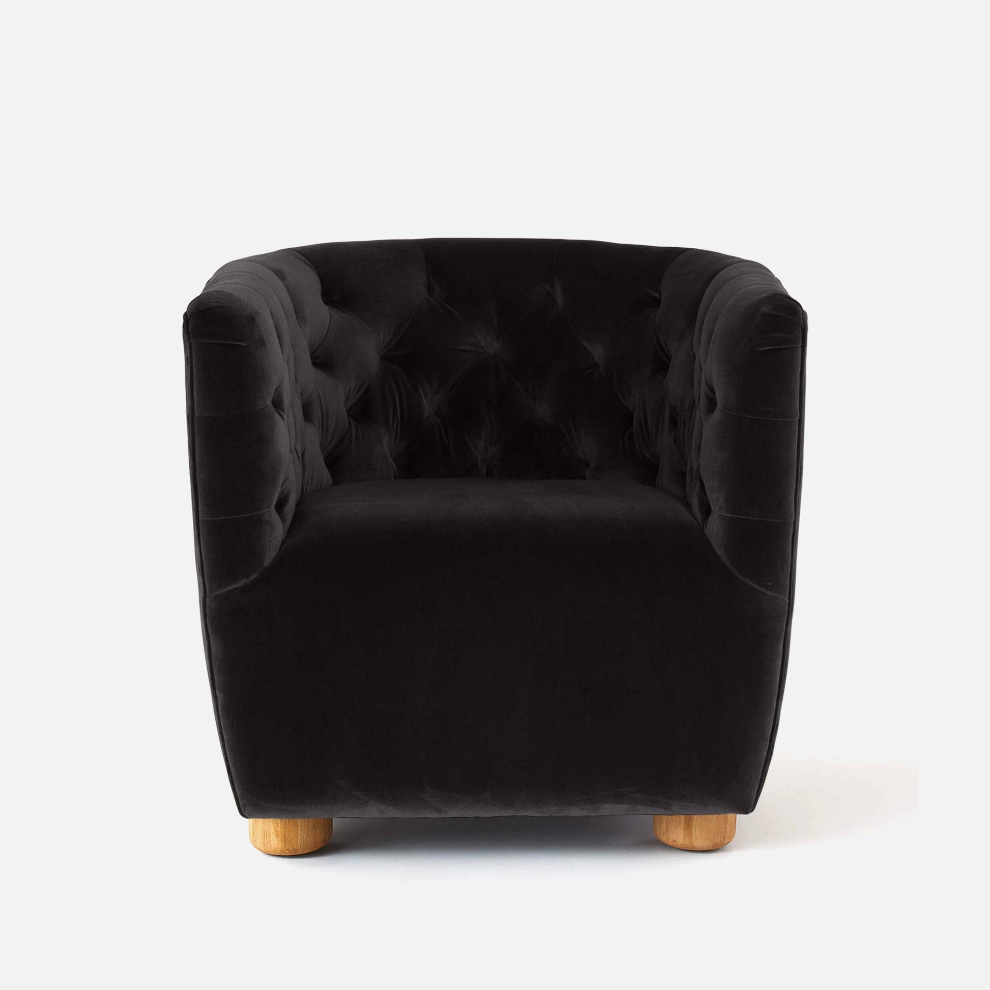 Introducing the "Isabella Accent Chair," a masterpiece of design and craftsmanship. This chair stands out with its perfectly curved silhouette atop block legs crafted from solid mango wood. Upholstered in velvety Charcoal Black fabric, it boasts dramatic blind tufting and high, shapely arms for a touch of elegance. Available in various materials and colours, each piece is handcrafted to perfection, ensuring durability and style. Soft foaming ensures comfortable seating, making it ideal for both aesthetic appeal and comfort.