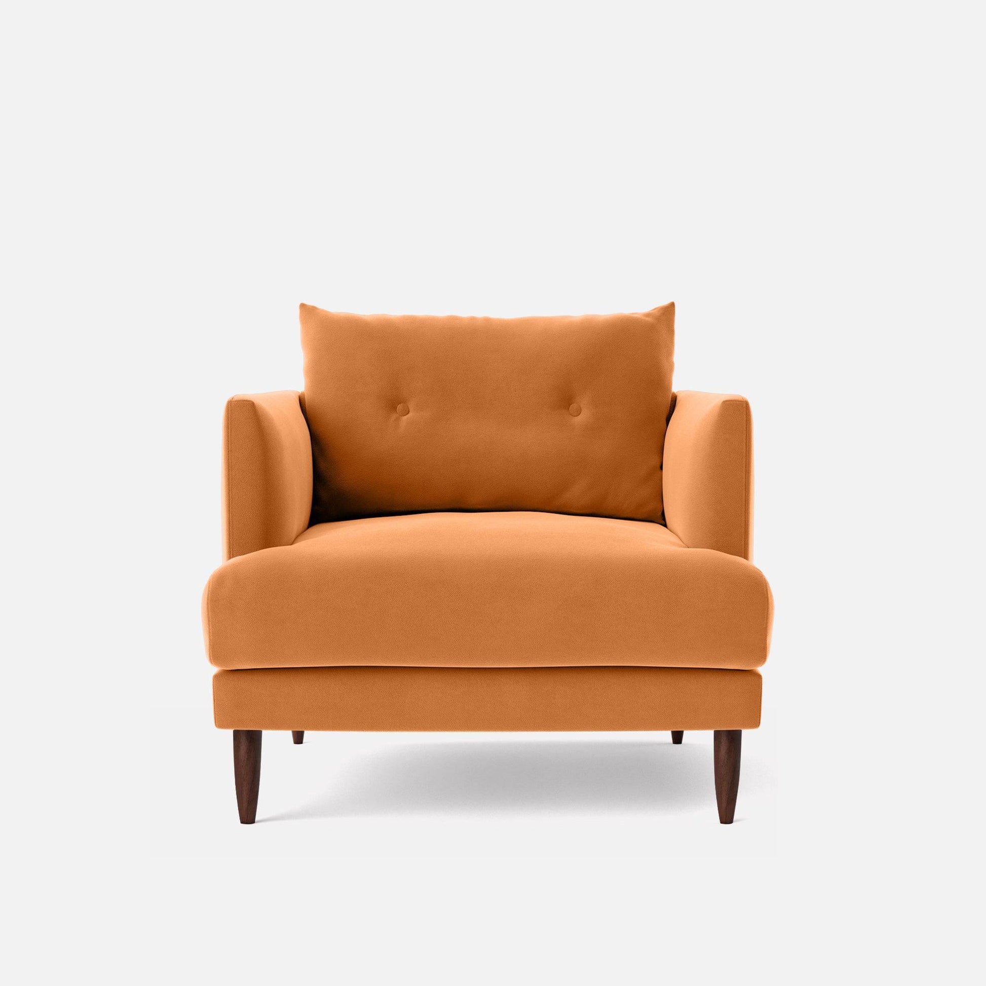 Introducing the Islay Single Seater Sofa, our top-selling masterpiece of classic contemporary design. At a compact 32 inches, it's perfect for small spaces or cosy corners. The Islay sofa features a timeless elegance with its soft cushion and button-tufted backrest, offering both comfort and sophistication. Supported by solid wood rounded tapered legs, it combines style with stability. Dressed in a rich Cider Orange soft velvet fabric, this sofa is a statement piece that adds a touch of luxury and warmth to your decor.