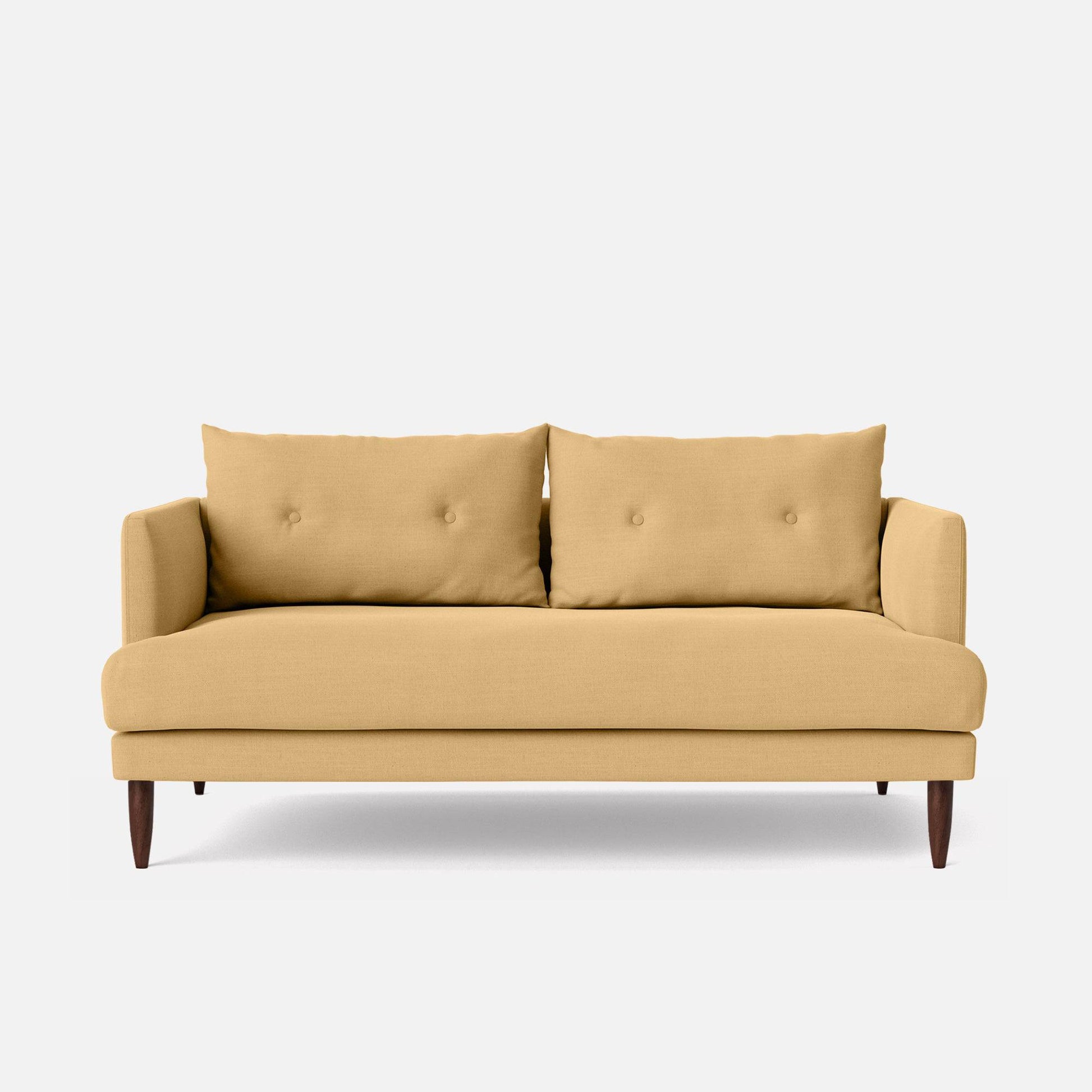 Introducing our top-selling Islay 2-seater Sofa, where classic elegance meets contemporary design. Measuring 57 inches, it provides cosy seating for two. The Islay sofa exudes timeless style with its soft cushion and button-tufted backrest, offering both comfort and sophistication. Supported by solid wood rounded tapered legs, it combines aesthetics with durability. Draped in a rich Amber Yellow Cotton Blend fabric, this sofa is a statement piece that adds warmth and a pop of colour to your living space.
