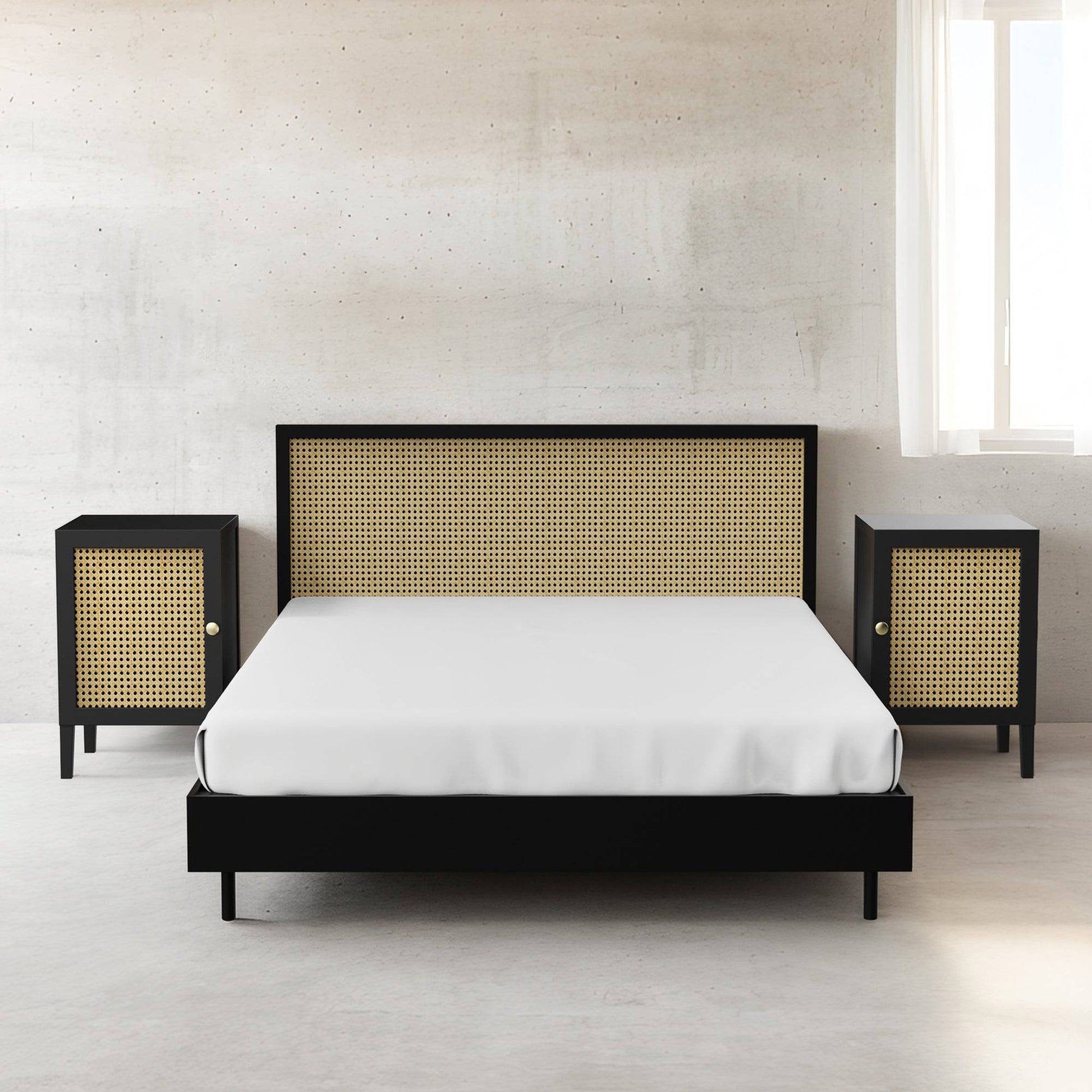 Materials Used: Please note the product - July Bed is in Solid Mango Wood with Natural Rattan Caning. The Side tables are in Solid Mango Wood as well - Both Finished in Black Matte Stain. Pattern and tone on wood might differ slightly from item to item.