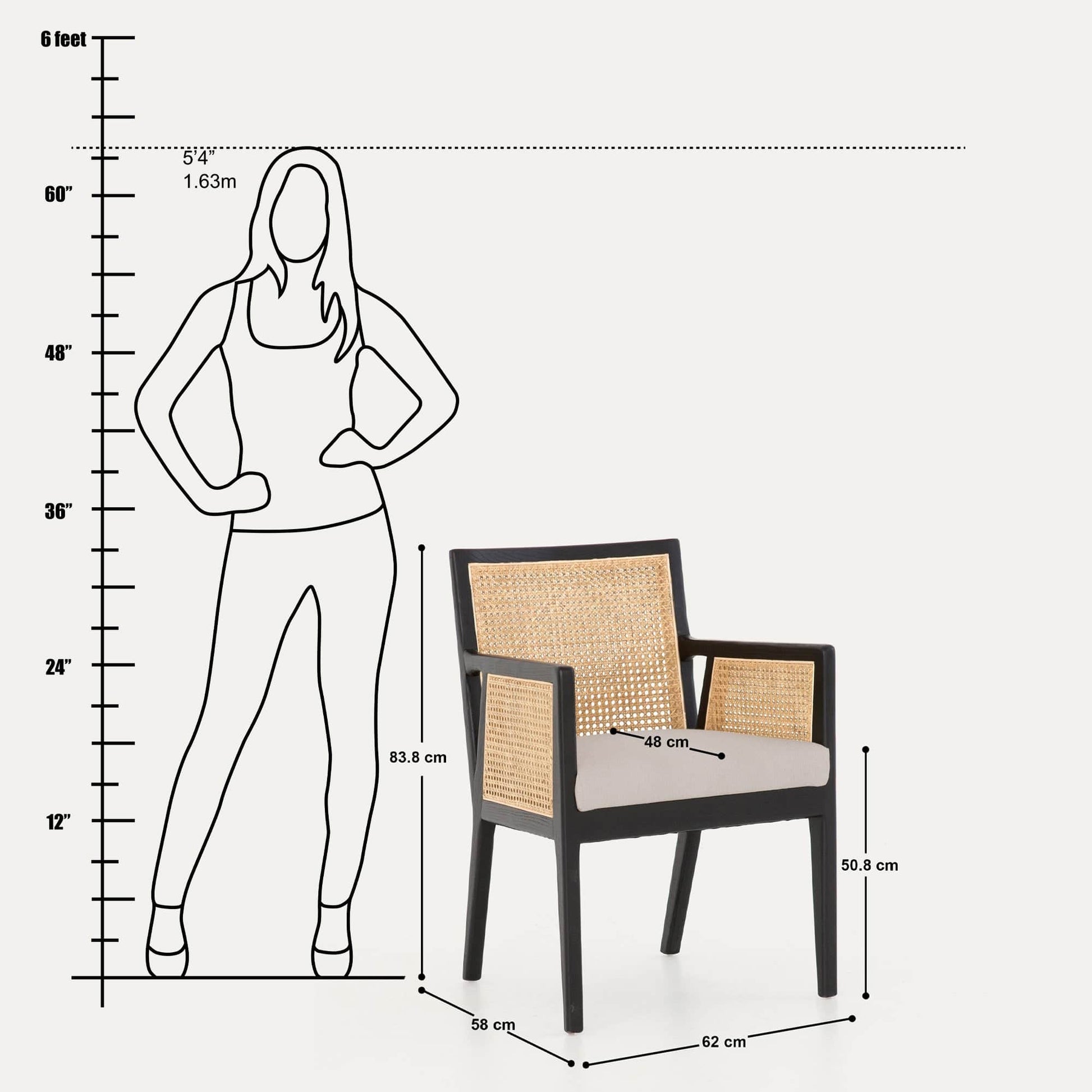 Introducing the Kipling Upholstered Rattan Chair, a perfect combination of excellent craftsmanship and stylish design. This dining chair features a unique rattan back and arm design, adding a touch of elegance. The chair is crafted with a black matte polish on Sheesham wood, ensuring durability and sophistication. The seat upholstery is made of a comfortable 100% Cotton fabric in a chic Ash Grey colour. The standout feature of the Kipling Chair is its retro-style design, offering a nostalgic and fashionable look to any dining space.