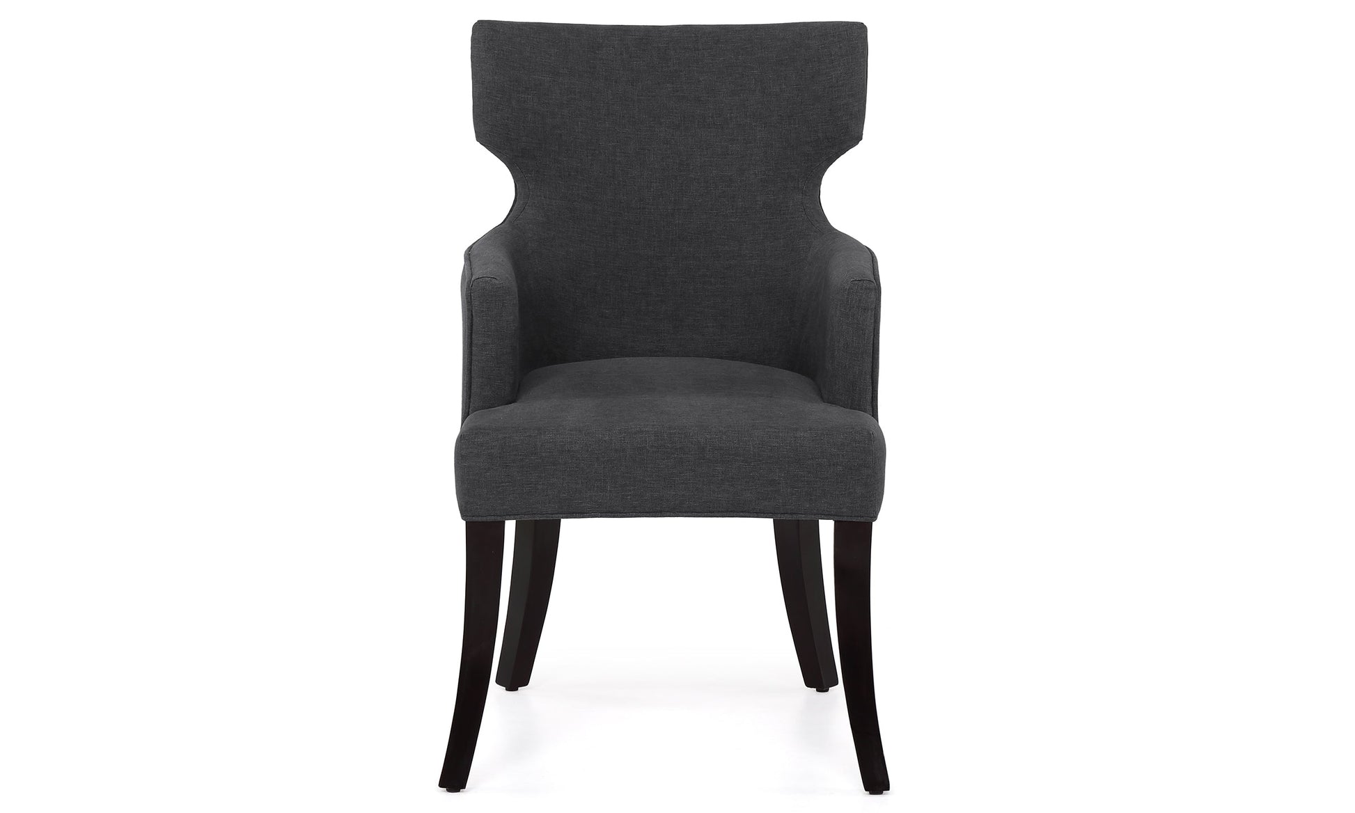 Amply padded and exquisitely designed for homes that are high on style, the Liana adds an air of sophistication to your modern dining room. Its beauty lies in details like the curved backrest, armrests, and splayed wooden legs.