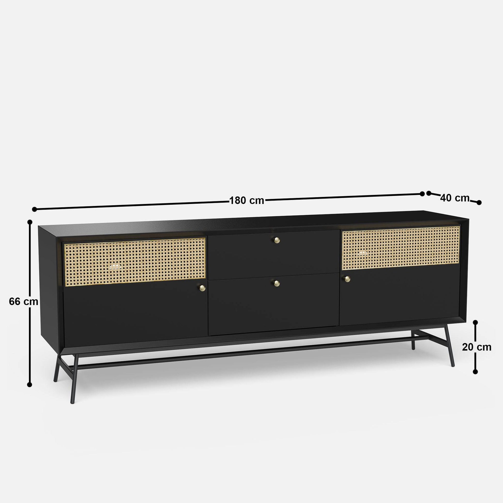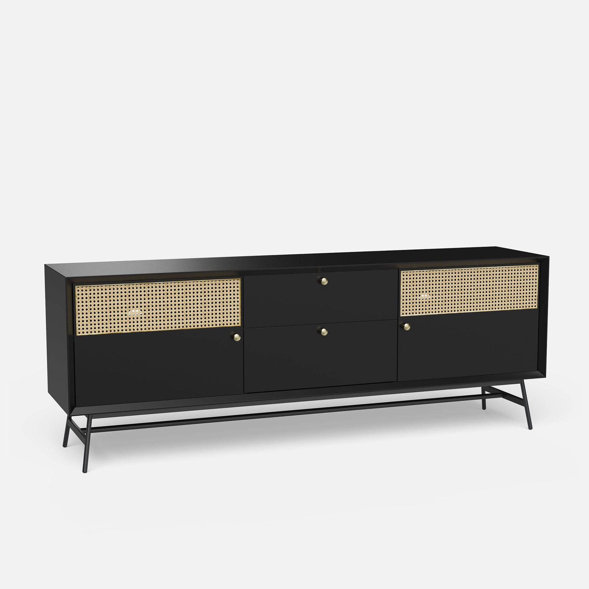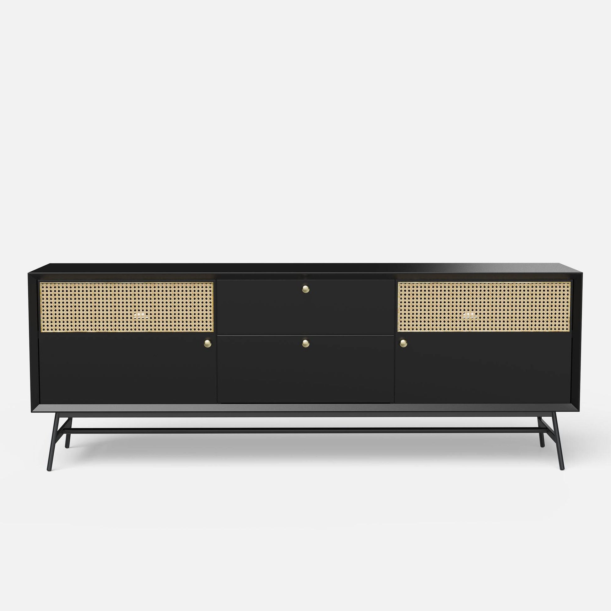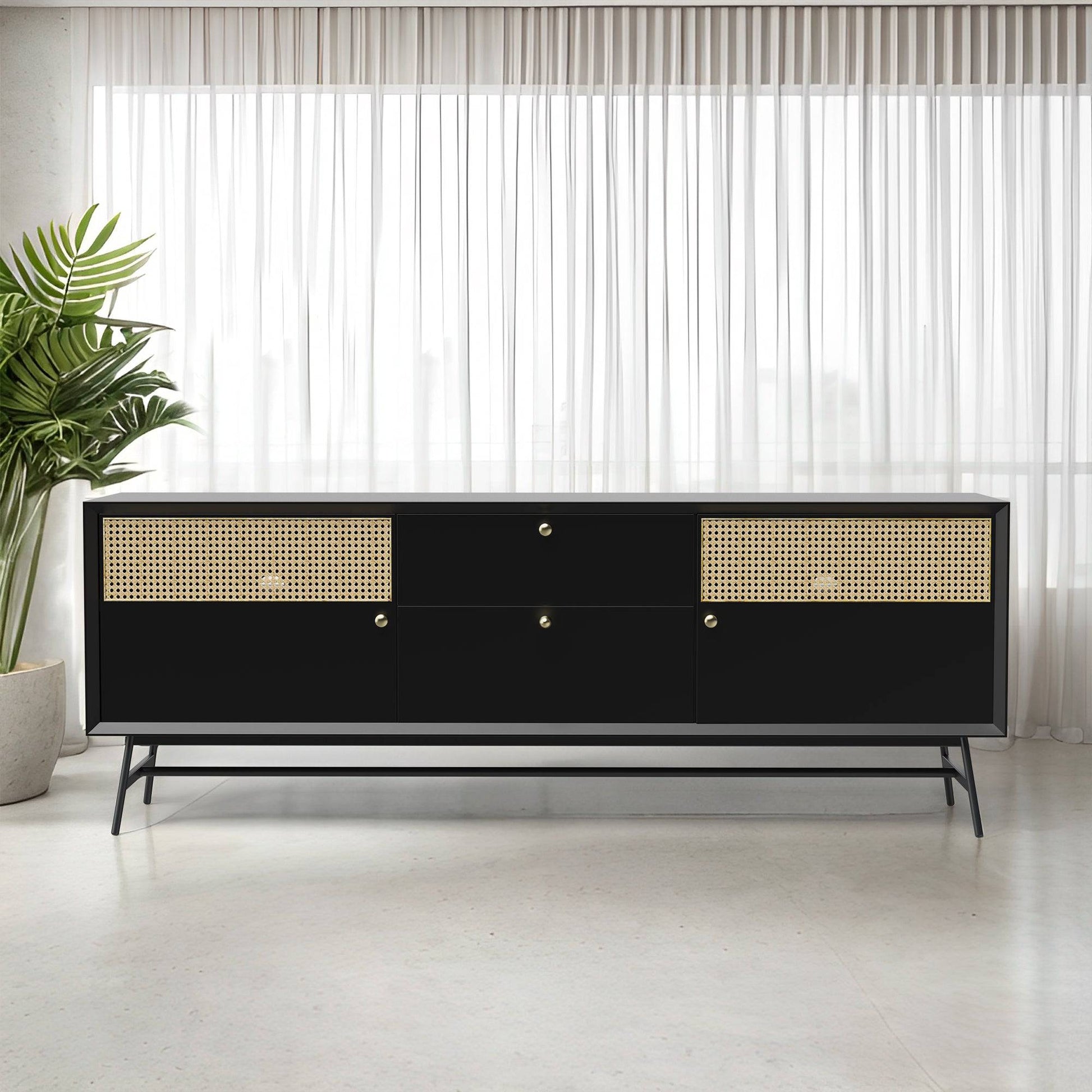Introducing the Long Beach TV Table Console, a perfect blend of sophistication and functionality. Crafted from Mango wood with a modern Matte Black Finish, this console boasts Rattan weave on the doors, providing a touch of natural elegance. With spacious drawers featuring brass knobs and supported by sleek metal legs, it's available in multiple finishes to suit your style.