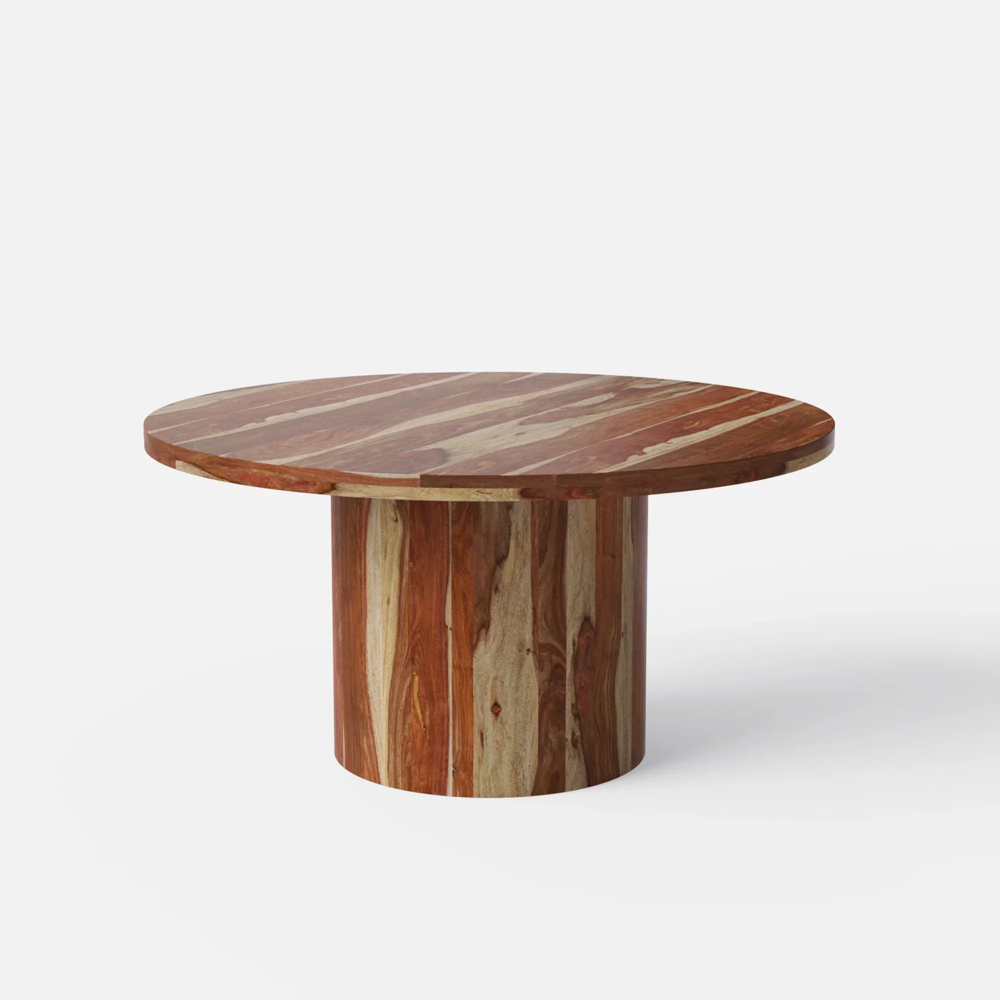 Modern dining table design: Round dining table with pedestal legs in natural Sheesham wood.
