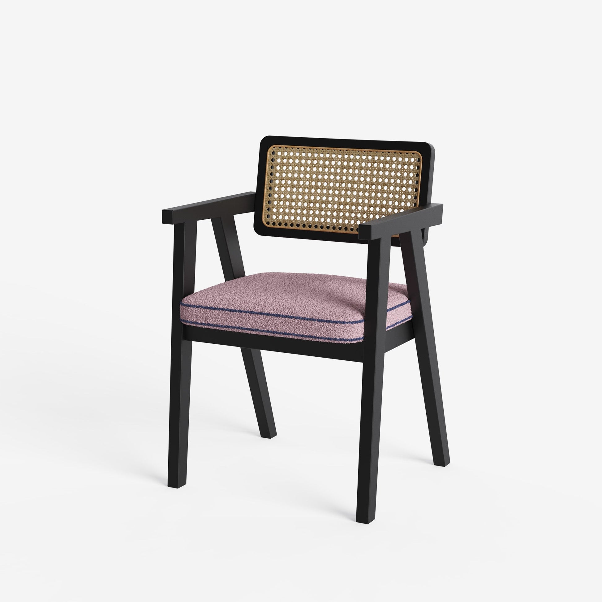 Comfortable seating: Soft foaming rattan dining chairs with luxurious boucle upholstery.
