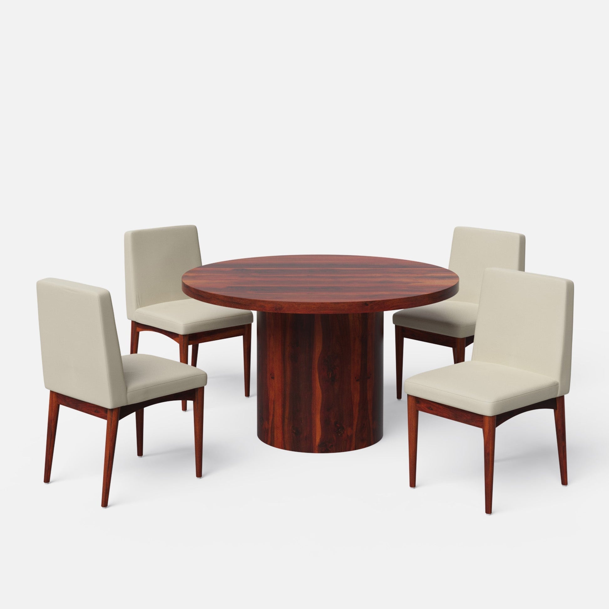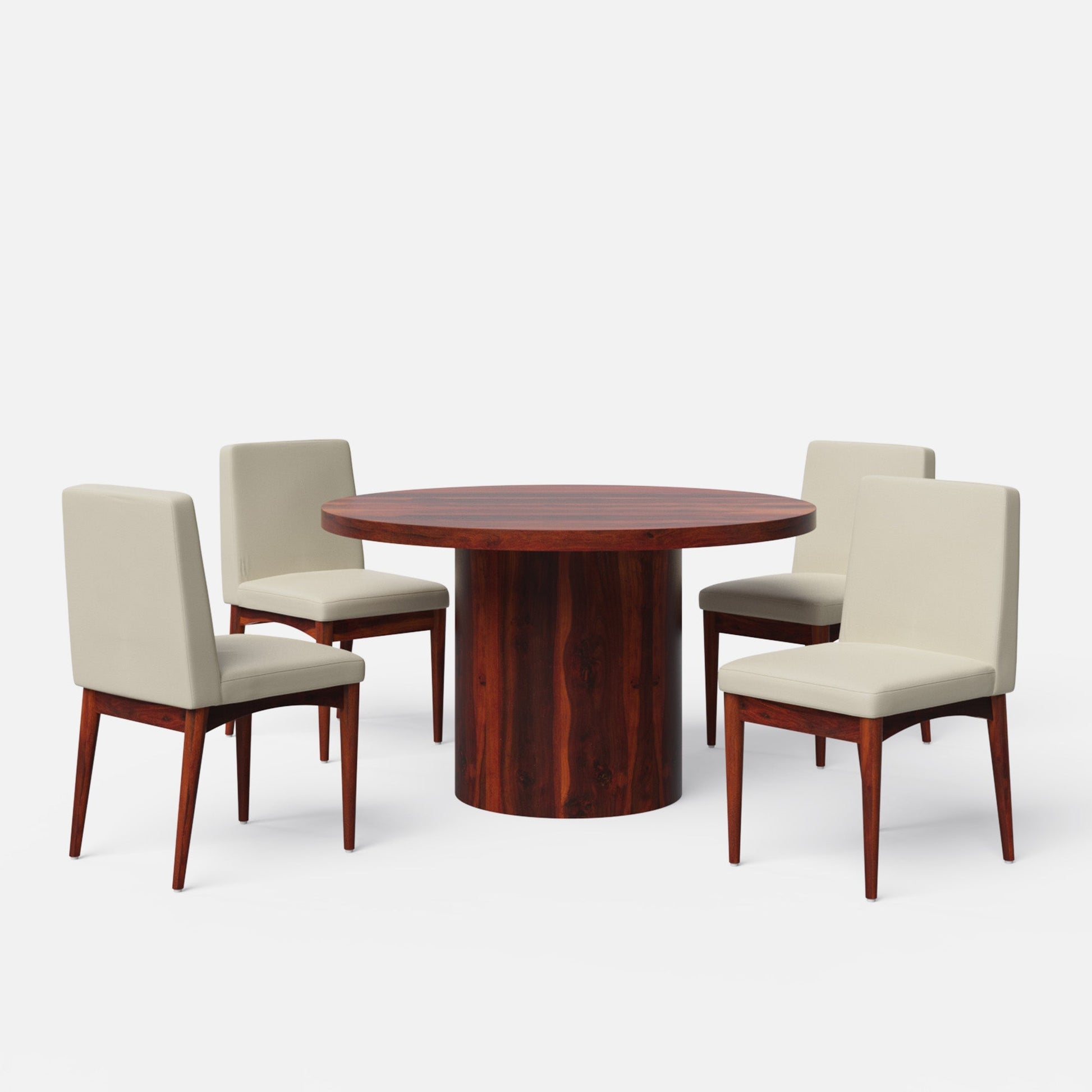 The "Luis-Lidia Dining Table Set" blends contemporary design with traditional craftsmanship. The Luis table features a round top and pedestal leg design, made from Sheesham wood in a luxurious Honey Walnut finish. Paired with the elegant Lidia chairs, featuring an armless design and sleek legs, this set offers plush seating with ivory vegan leather upholstery. Handcrafted to perfection, the set is available in multiple wood finishes and fabric colors, ensuring soft foaming and a cozy dining experience.