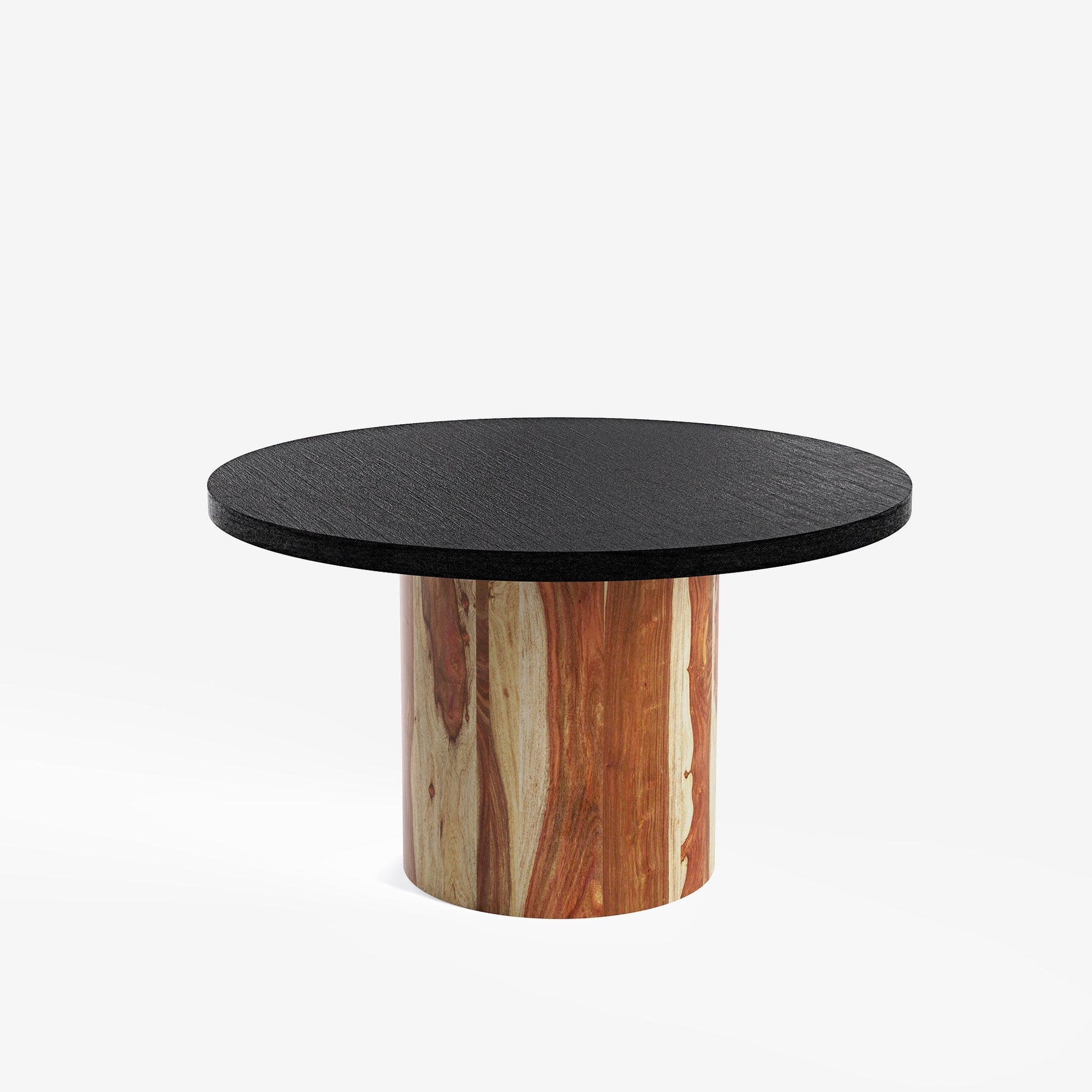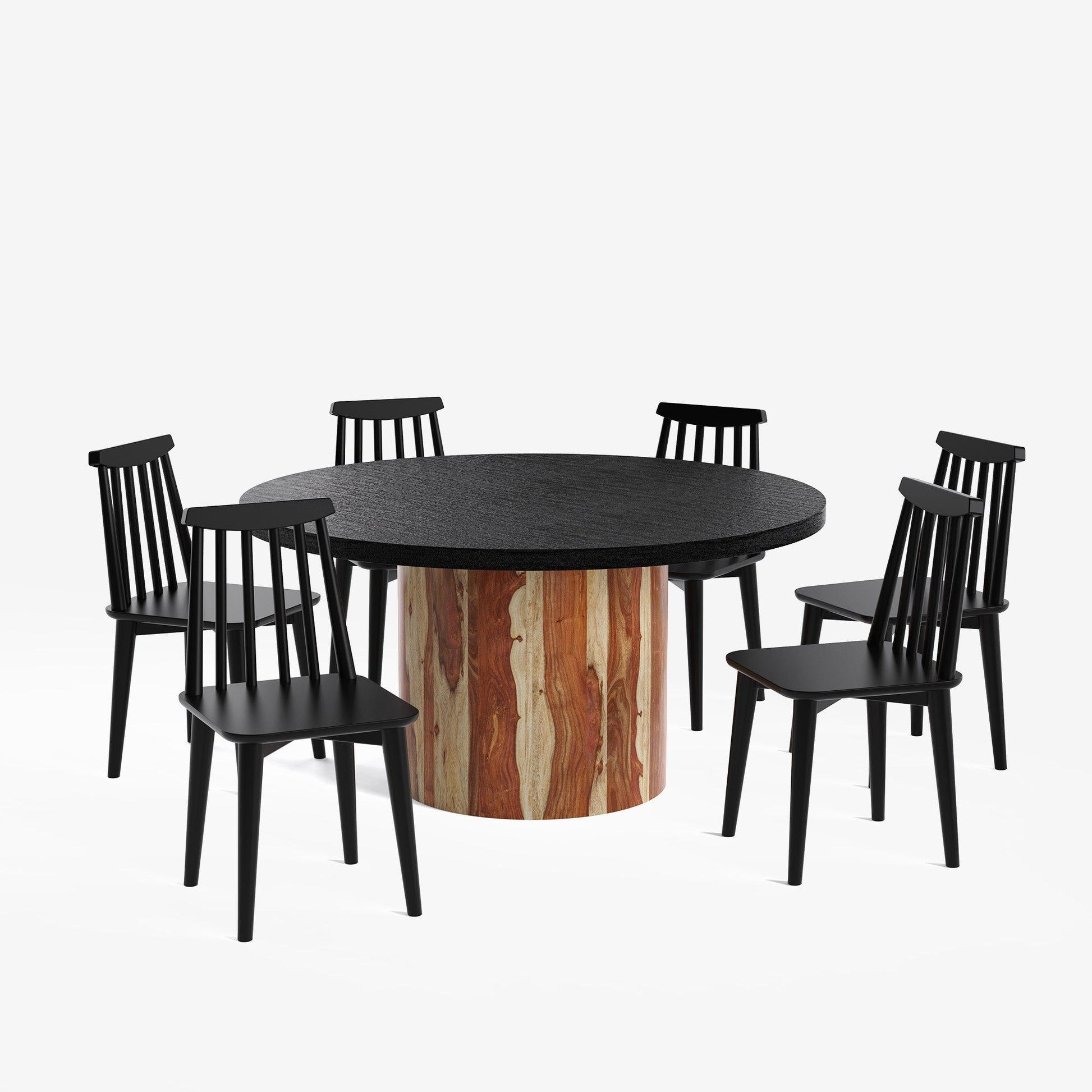 Premium dining table design: Round dining table with textured black matte Sheesham wood top and pedestal legs.