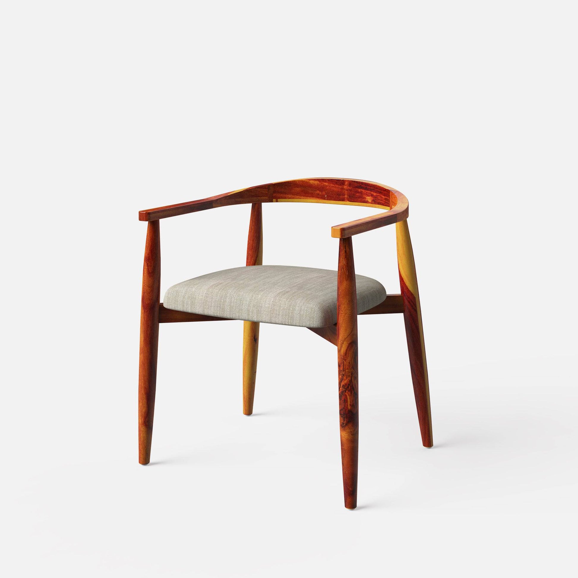 The Maya dining table set with Millie Upholstered chairs is a testament to contemporary modern design. Crafted from Sheesham wood with a light honey finish, the table stands out with its rounded tabletop design, adding a unique touch to your dining space. The Millie chairs, inspired by Hans J Wegner's round chair design, feature tapered round legs with a matching light honey finish. Their greige grey cotton blend fabric upholstery, wooden curved armrests, and sleek Scandinavian style offer both comfort and sophistication. For added versatility, the set offers an option with an upholstered bench, ensuring comfortable and stylish seating.