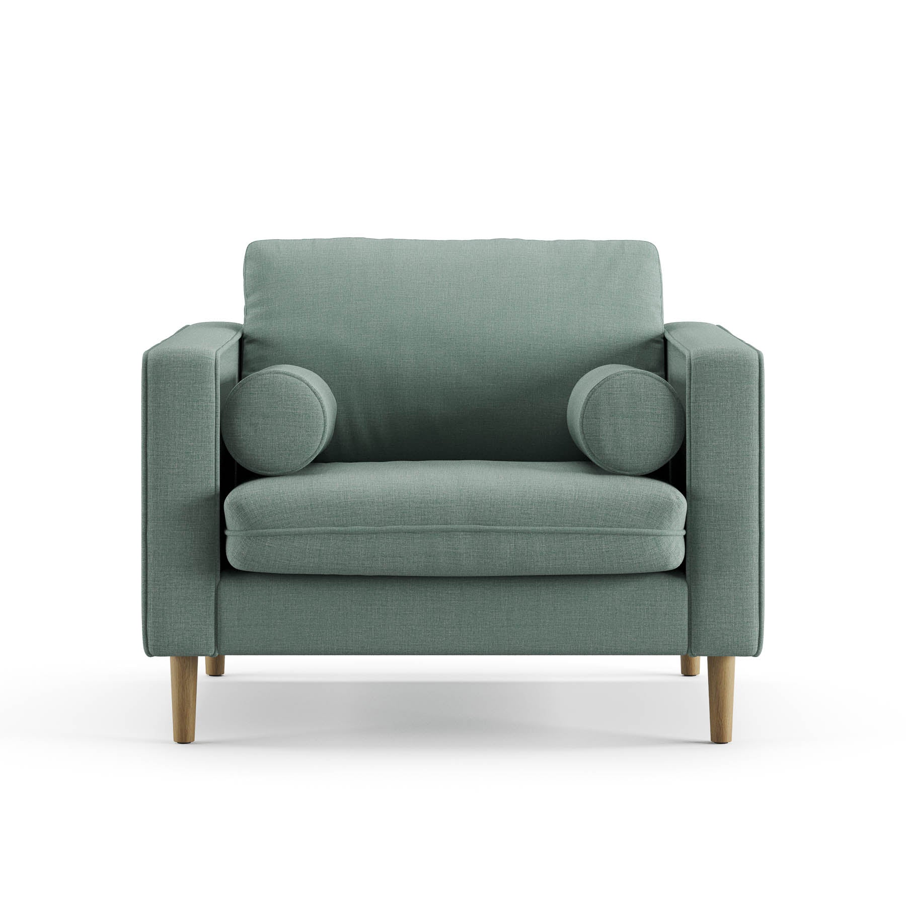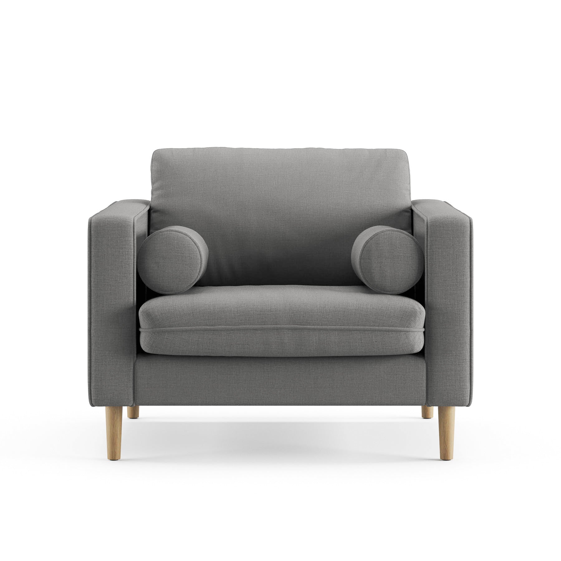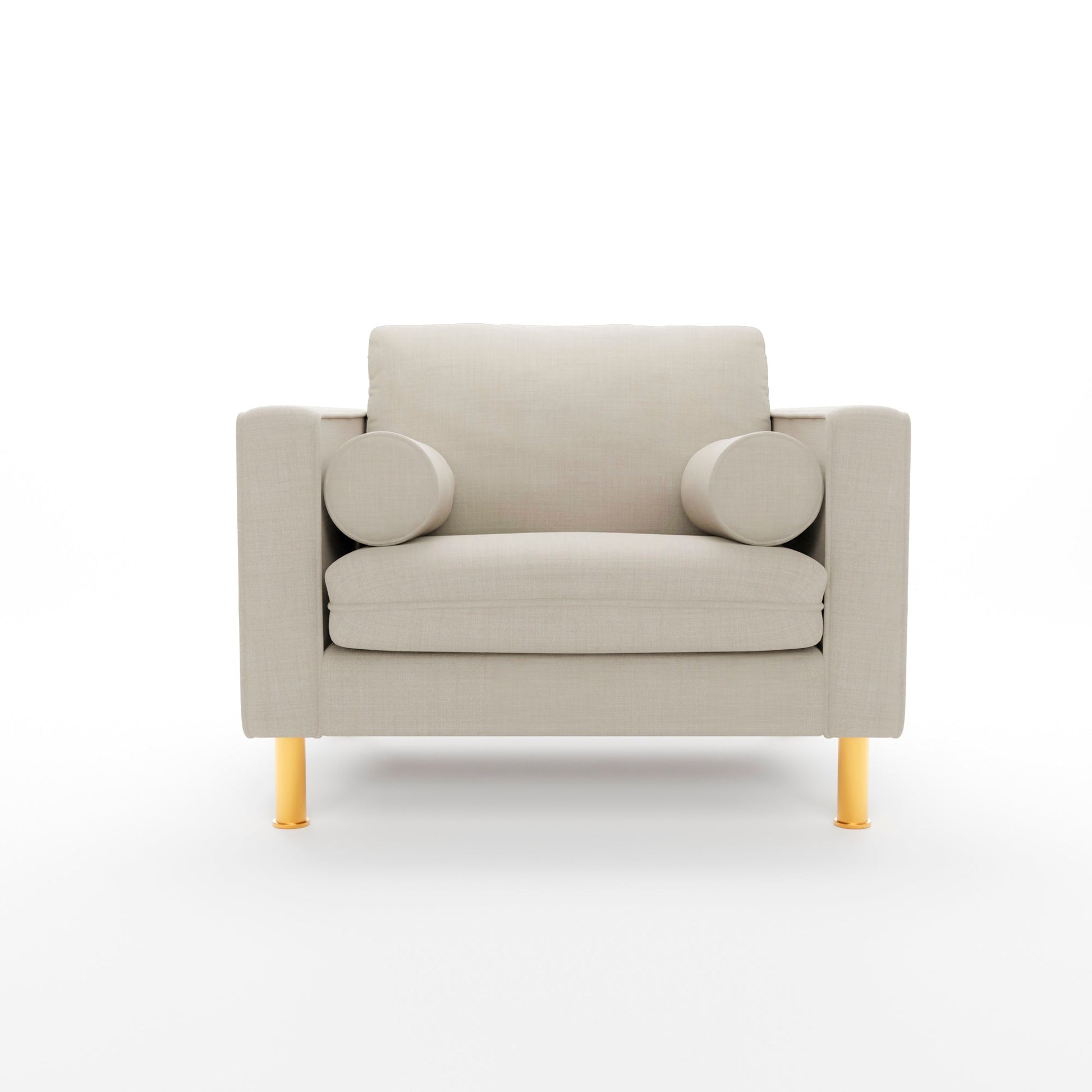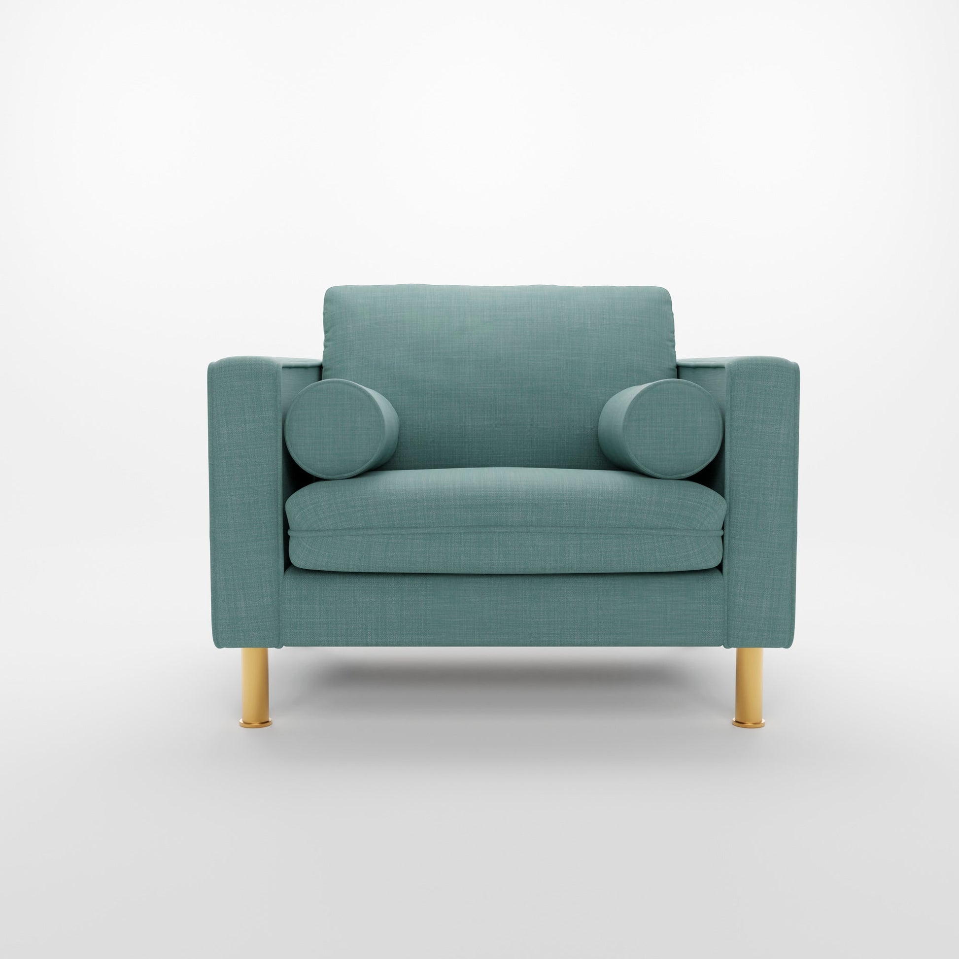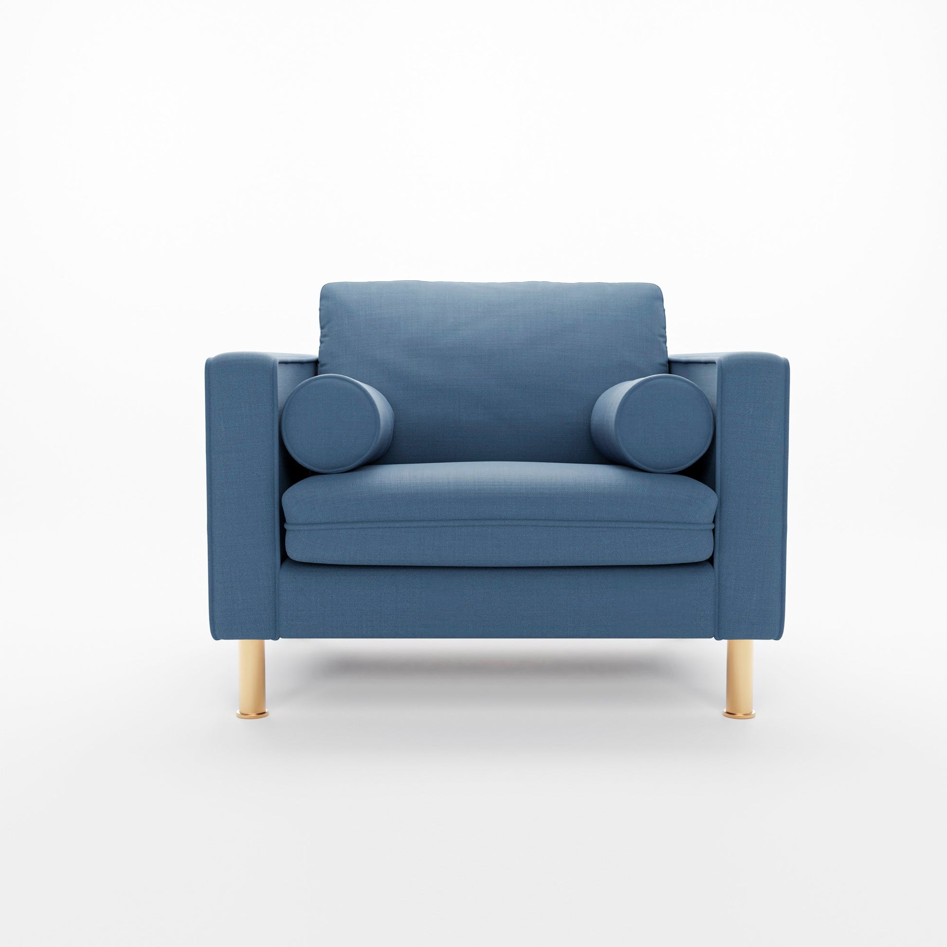 Our most popular sofa, reimagined as a large, cozy lounge chair. This modern take on a mid-century classic features clean lines, a tufted seat, and a luxuriously stuffed back cushion. Two matching round bolsters complete the look.