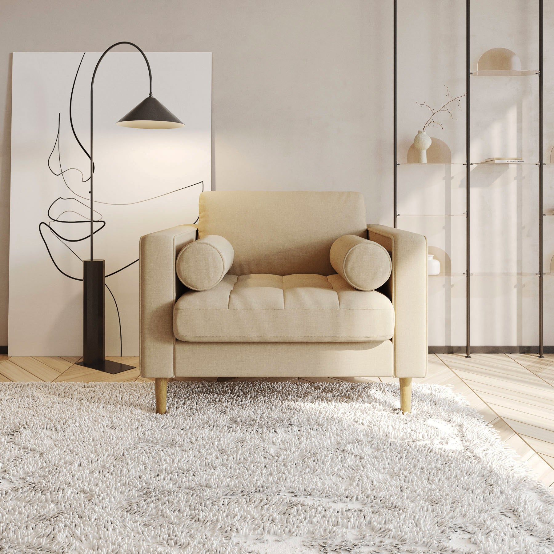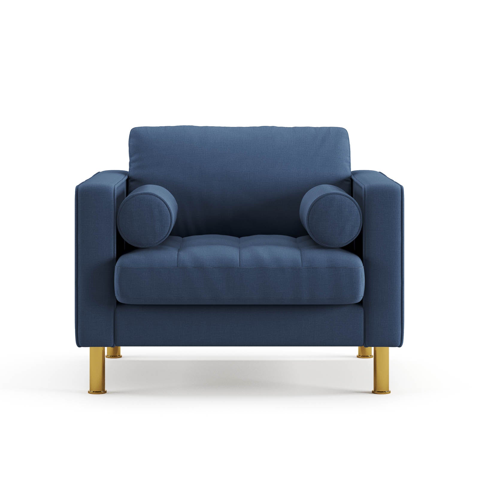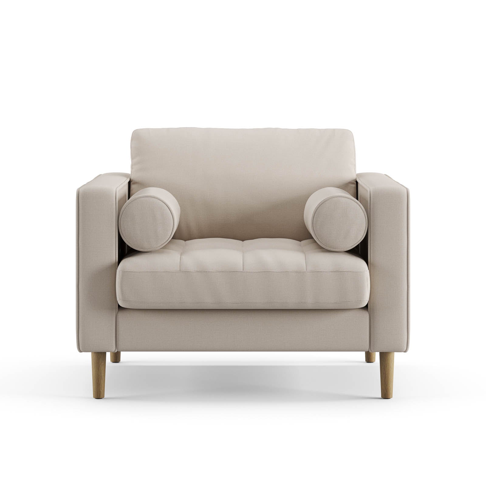 Our most popular sofa, reimagined as a large, cozy lounge chair. This modern take on a mid-century classic features clean lines, a tufted seat, and a luxuriously stuffed back cushion. Two matching round bolsters complete the look.