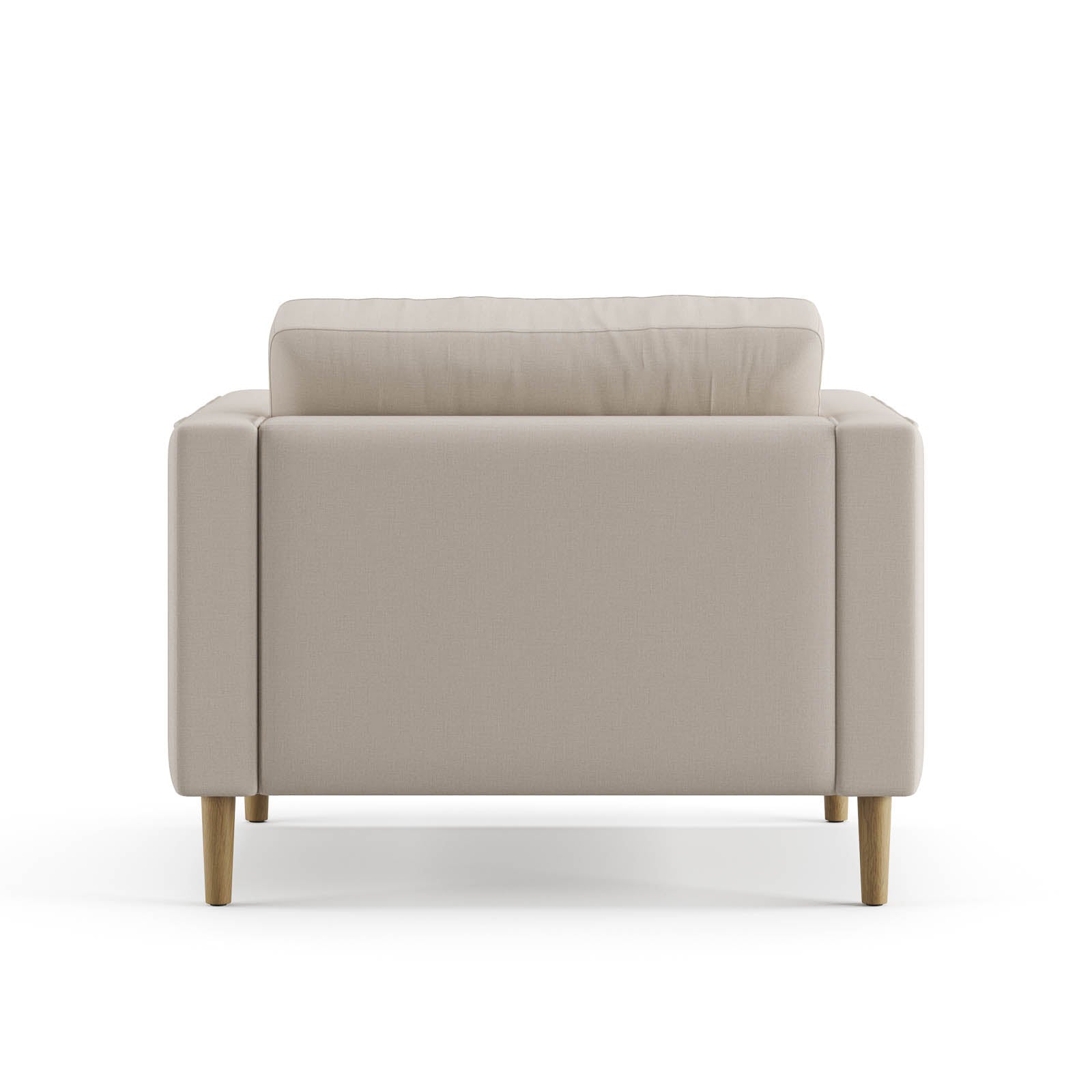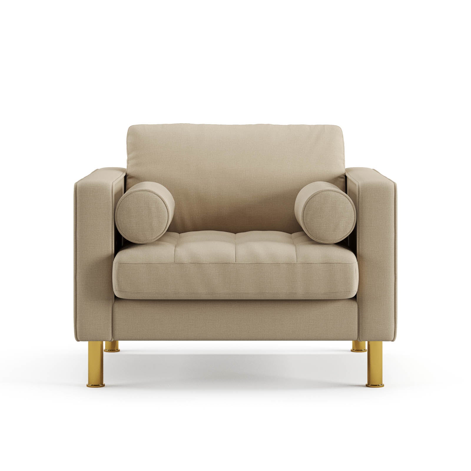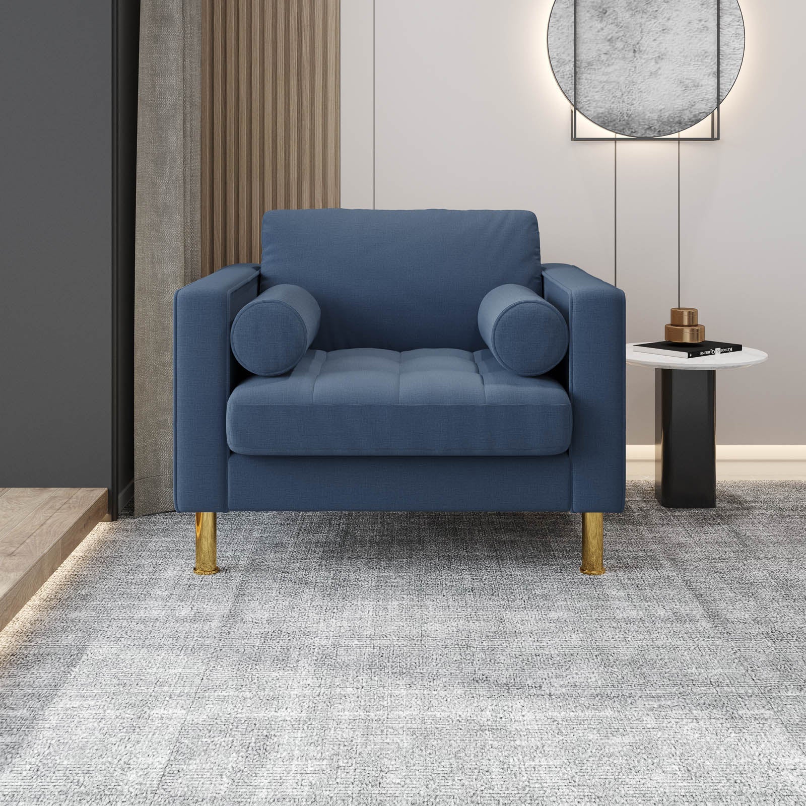 Our most popular sofa, reimagined as a large, cozy lounge chair. This modern take on a mid-century classic features clean lines, a tufted seat, and a luxuriously stuffed back cushion. Two matching round bolsters complete the look.