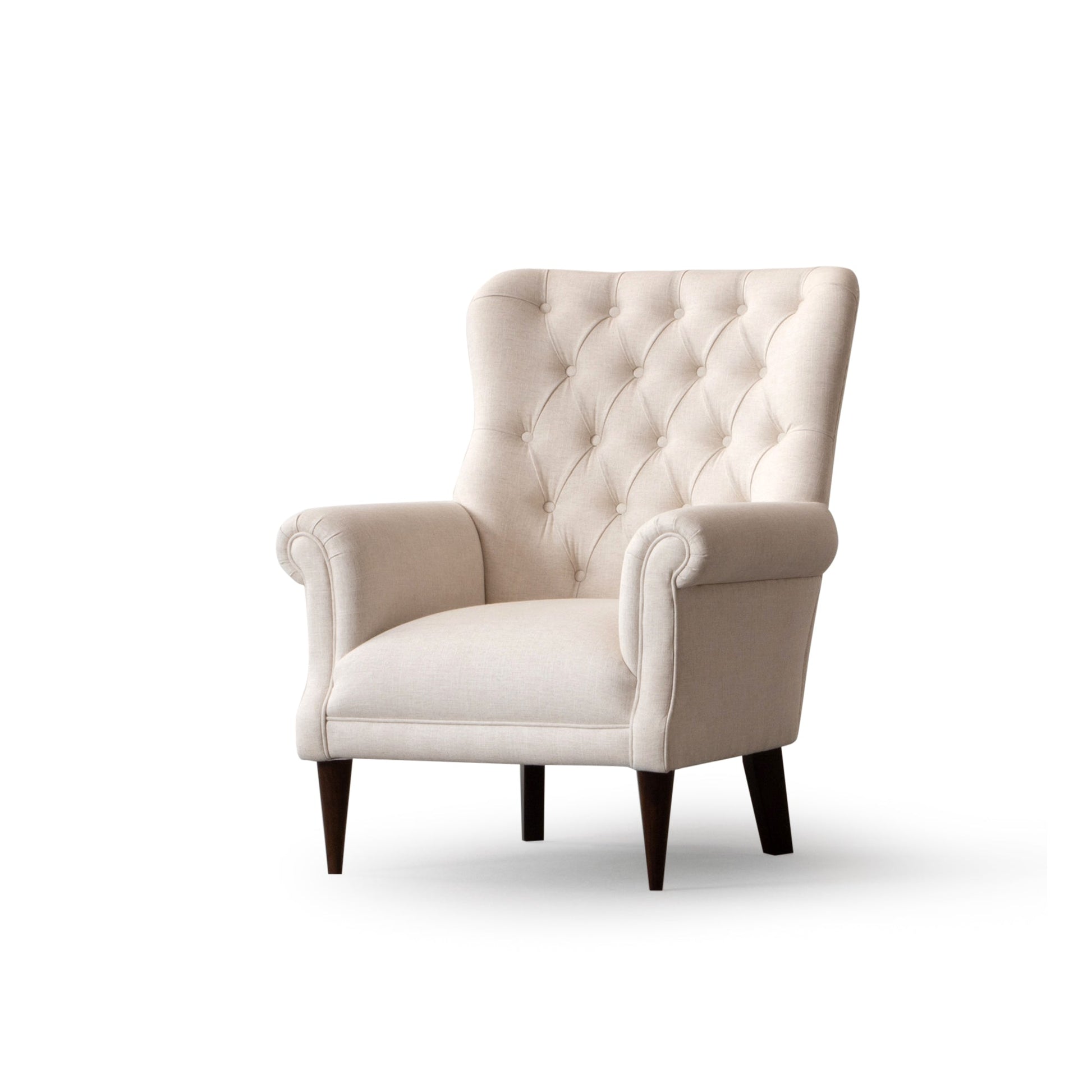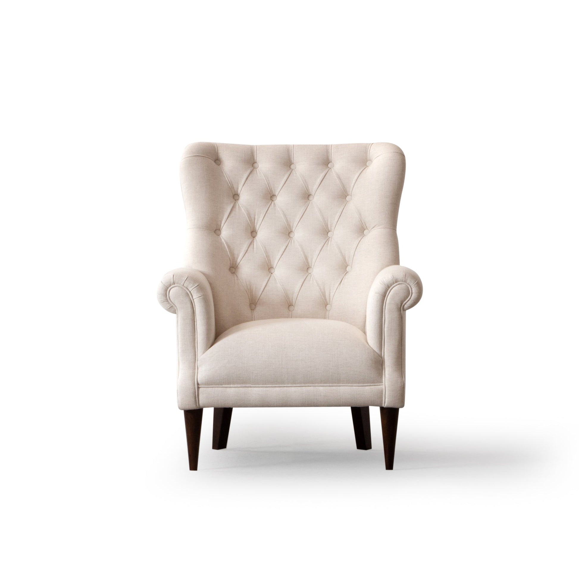 Old world charm meets modern day craftsmanship to create this charming Armchair with exquisite details. Tufted by hand, the style is inspired by the British classic armchairs. Finishing details include fabric-wrapped buttons and hand turned legs.