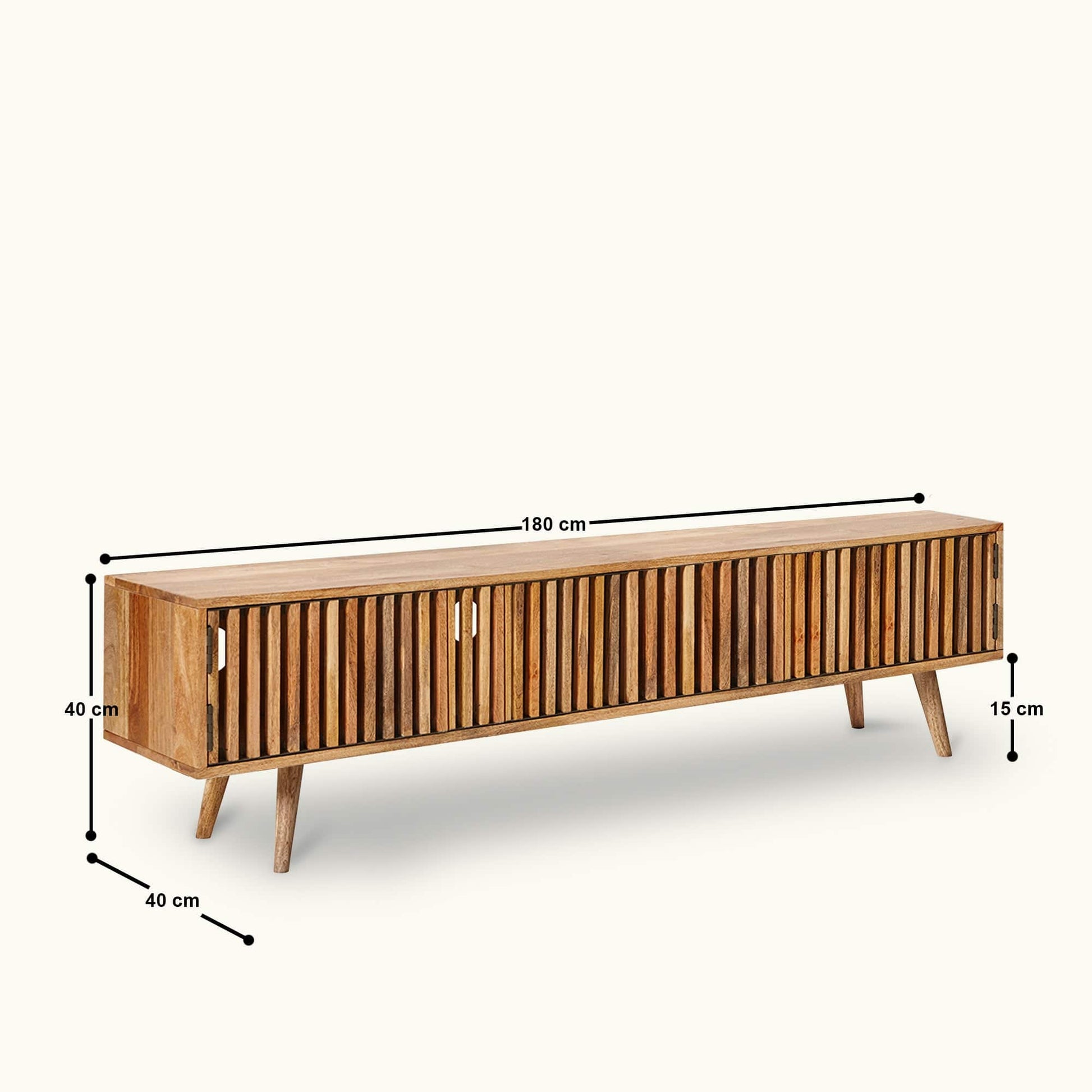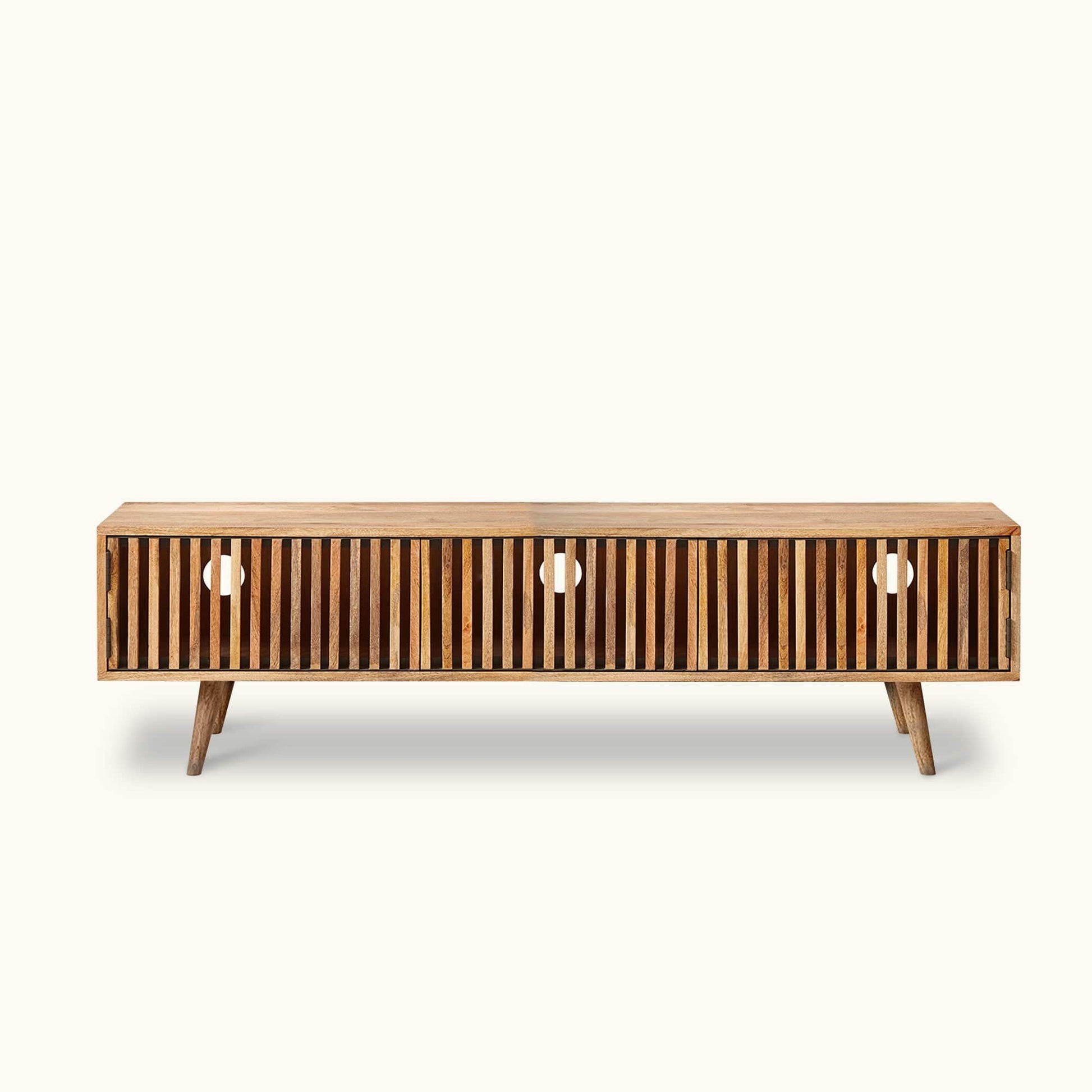 Introducing the Rainer Large TV Unit, a testament to contemporary simplicity and versatility. Crafted from premium mango wood with a natural polish and featuring slatted fronts, this console seamlessly blends modern design with its round, tapered solid wood legs. Its timeless appeal and sleek aesthetics make it a perfect fit for any living room or bedroom.
