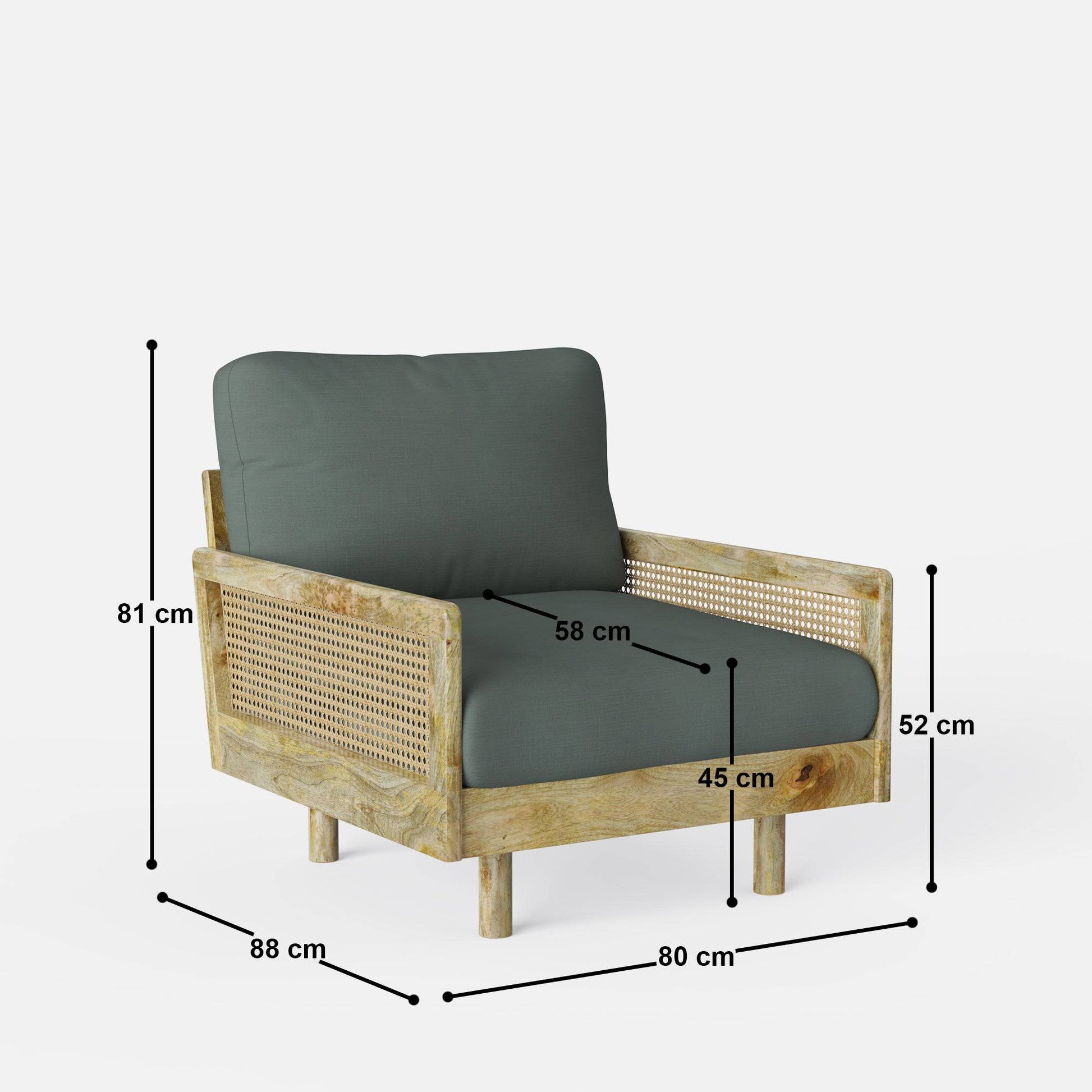 Discover the Ramon 1-Seater Sofa, our bestseller that seamlessly marries style and comfort. Measuring 31.5 inches, it offers spacious seating for three. Ramon features a unique design with a rattan weave against a natural mango wood frame, creating a captivating visual contrast. Sink into its soft cushion and enjoy the plush comfort it offers. Supported by solid wood dowel legs, this sofa ensures stability and longevity. Draped in a soothing Deep aqua cotton fabric, it adds warmth and elegance to your decor.