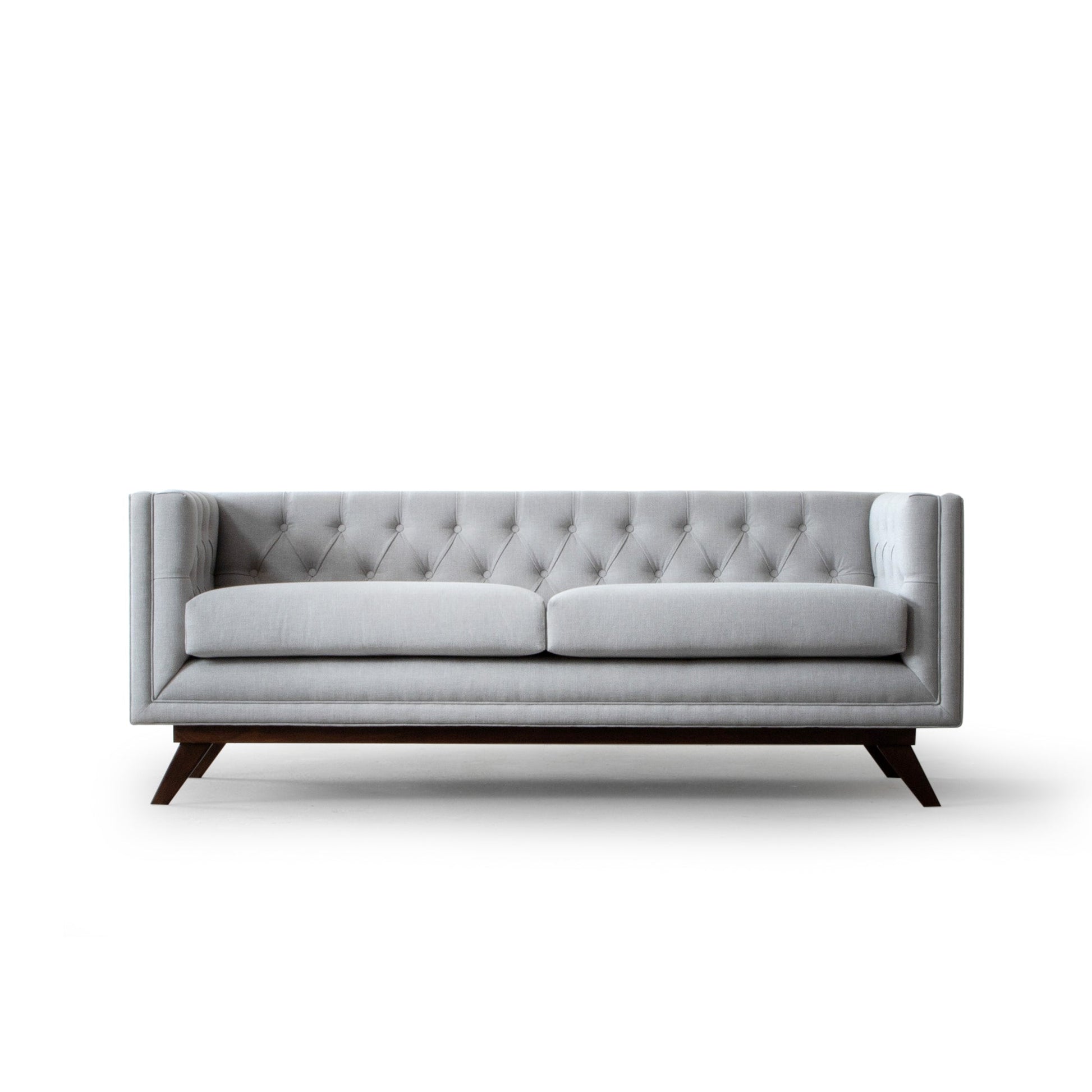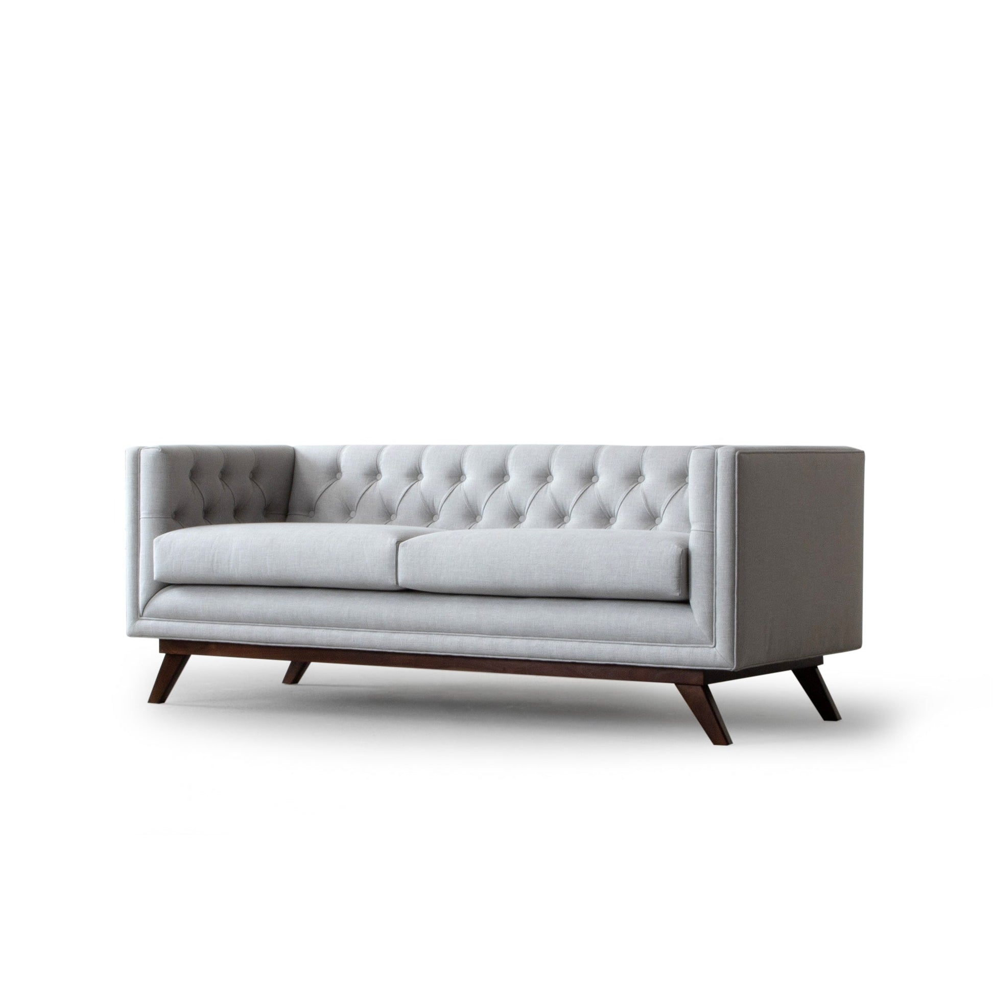 The all-over tufting and with art deco legs of this mid-century inspired shape make for a stately, modern upgrade to your living room centerpiece. One of the finest pieces to come from Golden Mayer's hand-tufted collection, with straight lines outside and deep hand tufted inside with the right amount of tapered back seat is nothing less than an awesome style statement in any living space.