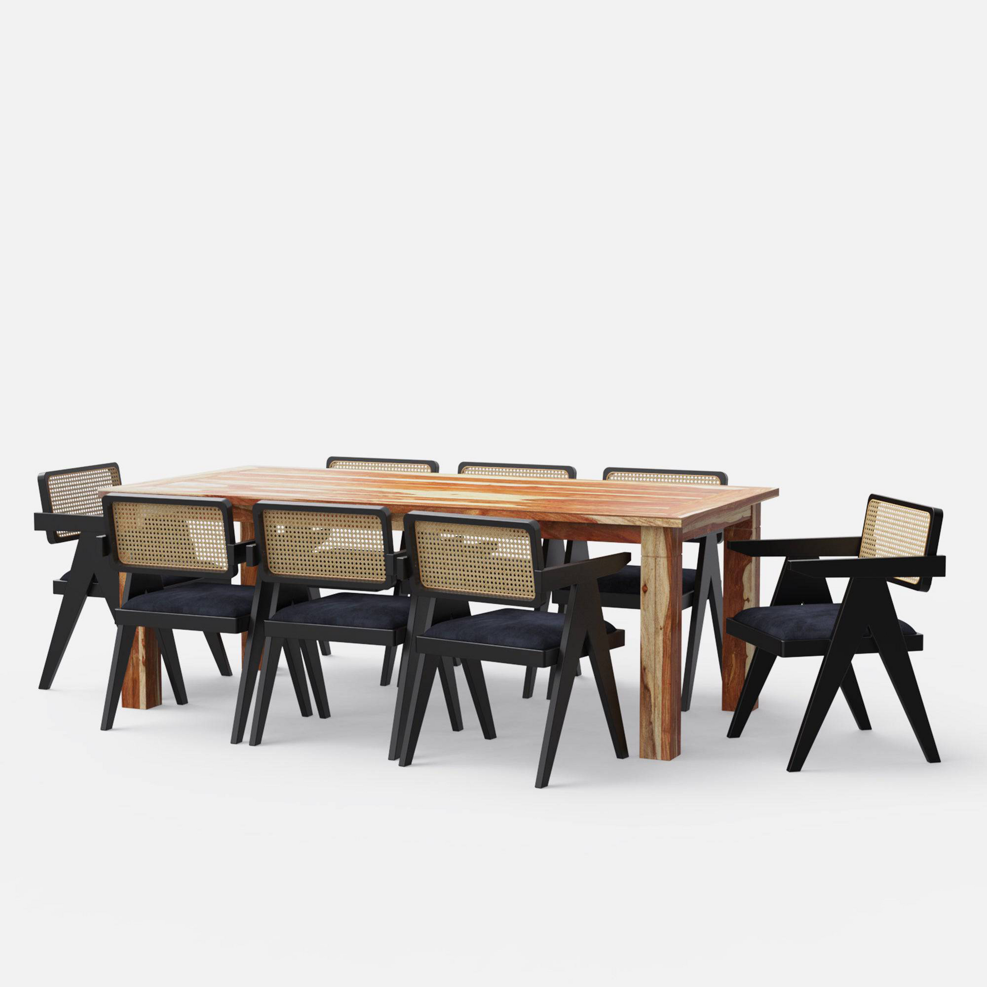 Introducing the Roma-Pierre luxury dining table set, a blend of contemporary modern aesthetics and enduring craftsmanship. Available in three sizes: 100 cm, 150 cm, and 175 cm, the table is expertly crafted from Sheesham wood with a natural polish, showcasing its intrinsic beauty. The robust block legs ensure durability and stability. Accompanying this elegant table are the Pierre chairs, featuring classic Pierre Jeanerette design elements. Crafted from Sheesham wood with a matte black finish, the chairs offer a comfortable dining experience with seaweed green cotton blend fabric upholstery and a natural rattan cane weave backrest.