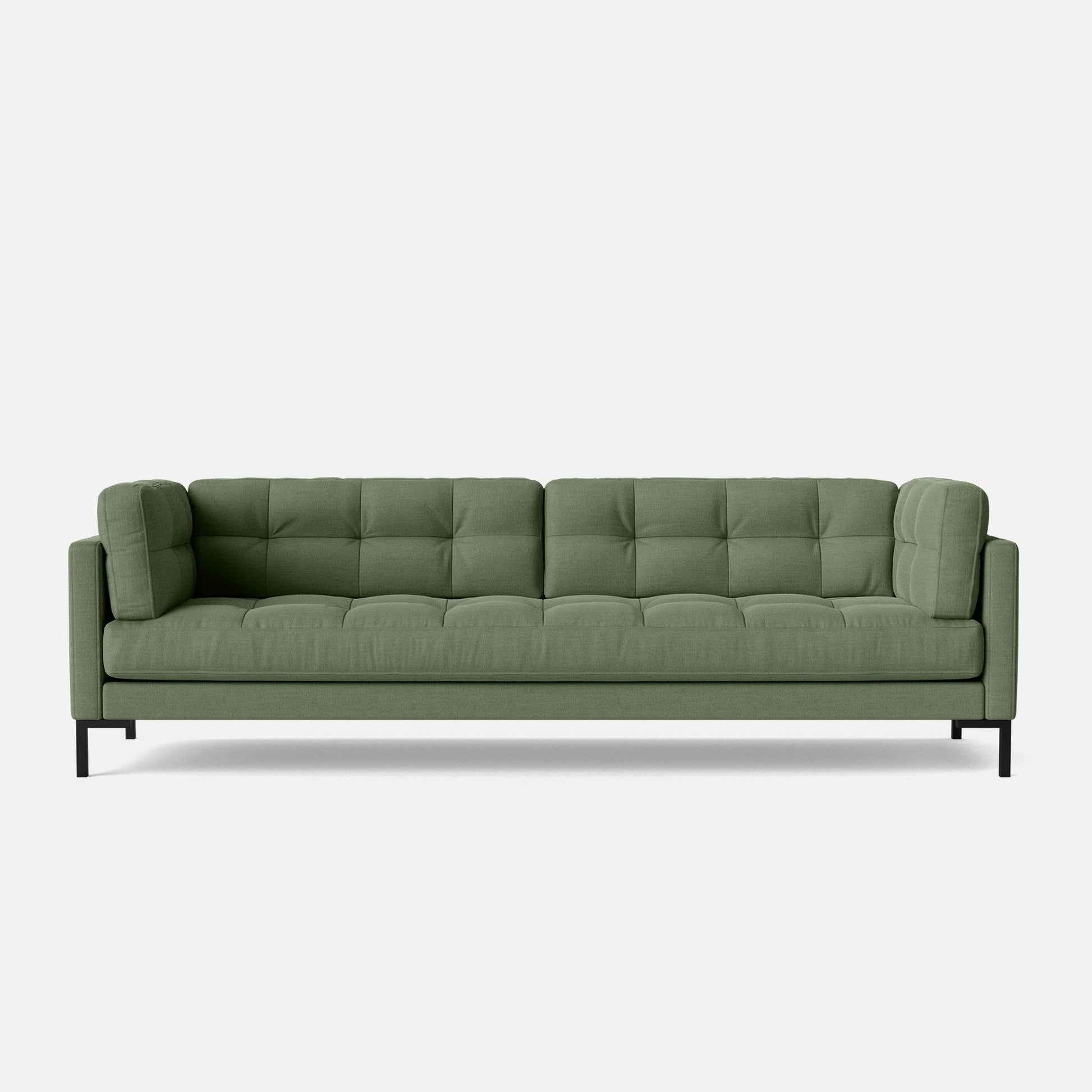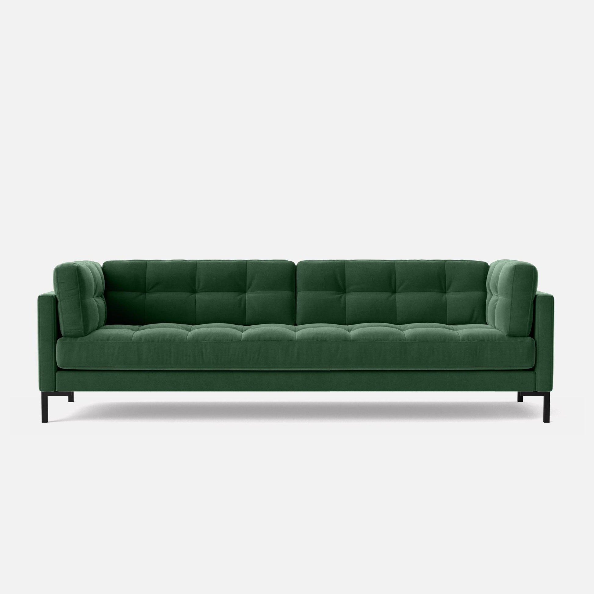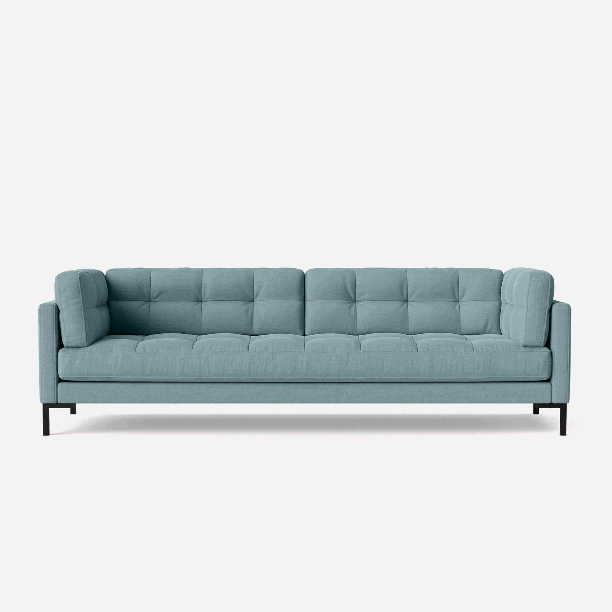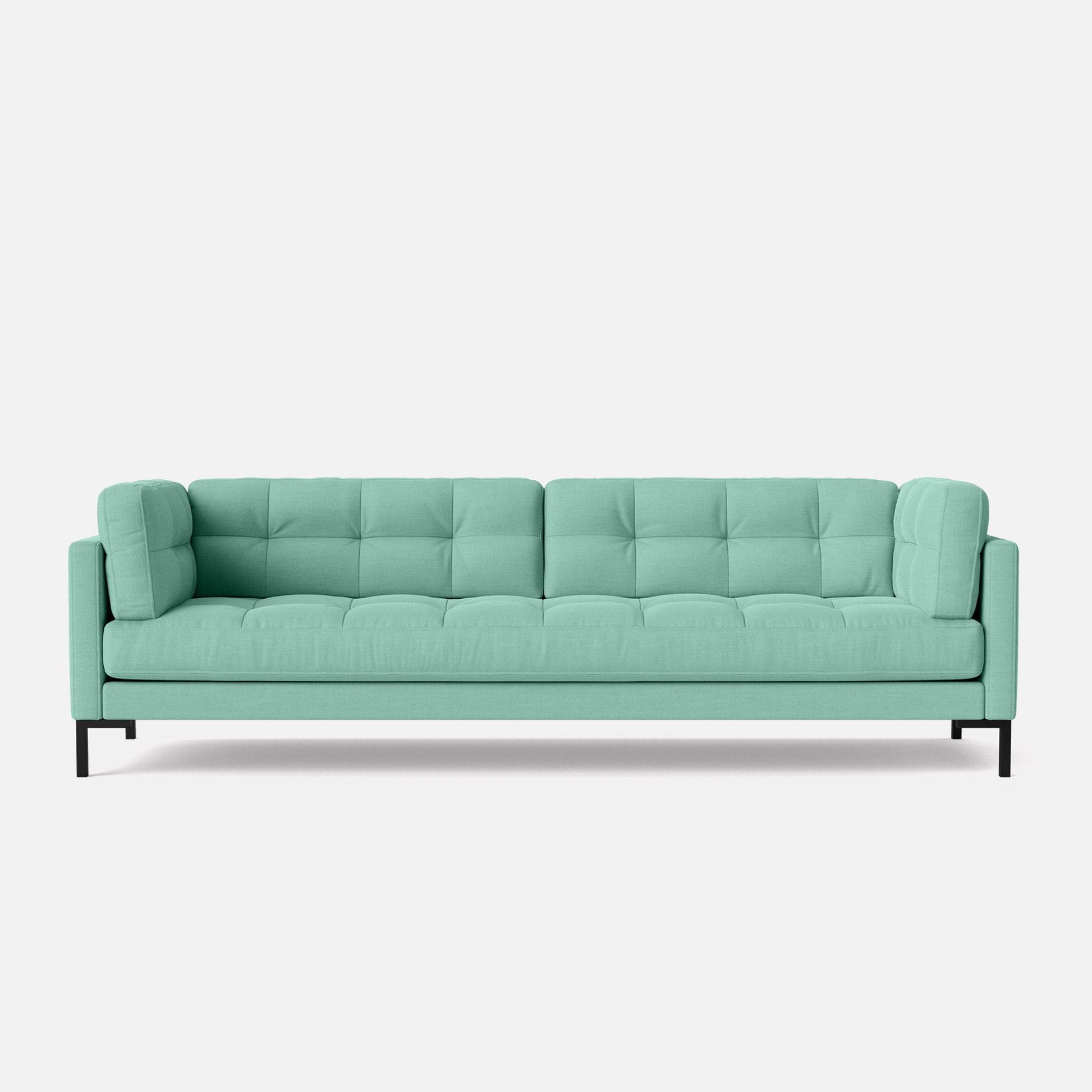 Introducing the Roman 4-seater Sofa, our bestseller that effortlessly combines style and comfort. Measuring 93 inches, it offers generous seating for four. Roman features all-over deluxe quilting that adds a contemporary flair, while its soft cushioning ensures a comfortable and inviting sitting experience. Supported by stylish T-shaped metal legs, this sofa combines aesthetics with durability. Draped in a luxurious Teal Green Cotton Blend fabric, it's a statement piece that infuses sophistication and a touch of opulence into your living space.