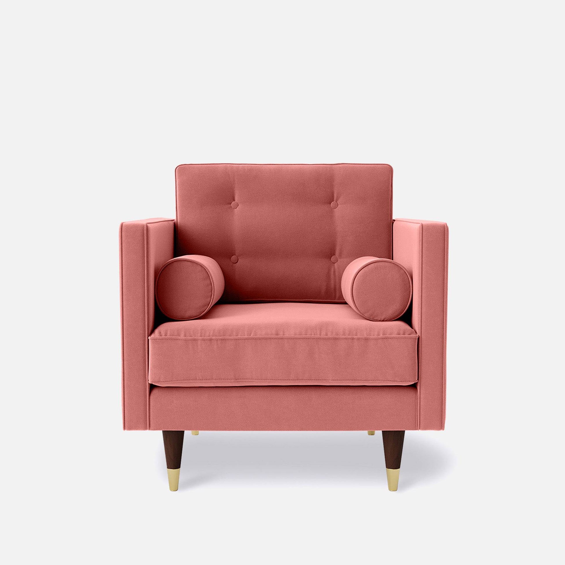 Introducing the Seville Single Seater Sofa, a bestseller renowned for its compact elegance. At just 32 inches, it's a versatile addition to any space. Seville boasts clean lines, a button-tufted back, and bolster-style cushioning for extra comfort. Its stylish wooden legs with brass caps add a touch of sophistication. Adorned in a luxurious salmon red soft velvet fabric, it's a statement piece that brings both warmth and style to your decor.
