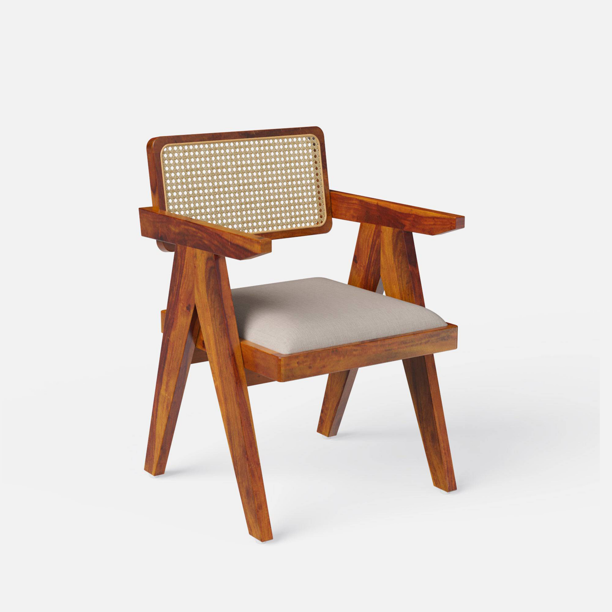 Introducing the Shelly-Pierre dining table set, a captivating ensemble that effortlessly blends Scandinavian sophistication with classic charm. Crafted from sheesham wood with a Honey finish, the table boasts a parqueted tabletop and sleek tapered metal legs. The accompanying Pierre chairs feature the timeless Pierre Jeanerette design, made from sheesham wood with a matte black finish. Upholstered in Fur beige cotton blend fabric, the seats offer soft cushioning, while the natural rattan cane weave backrest adds a touch of texture and elegance. Experience comfort and style in this exquisite dining set.