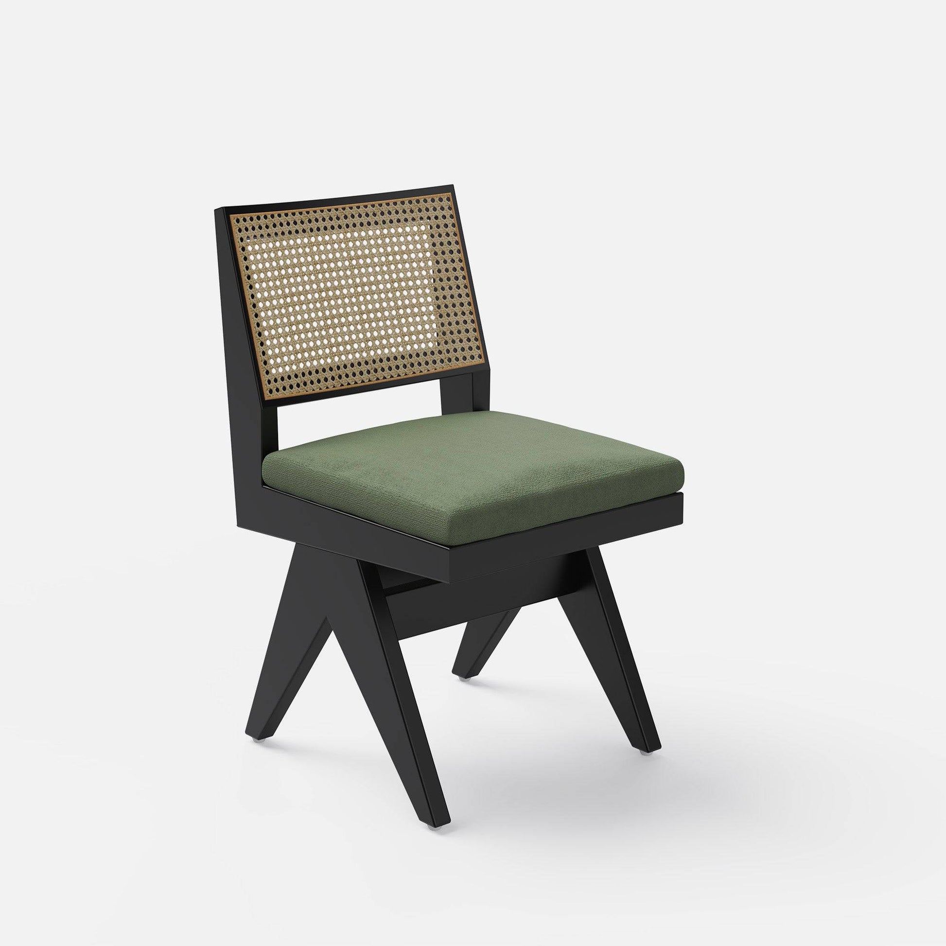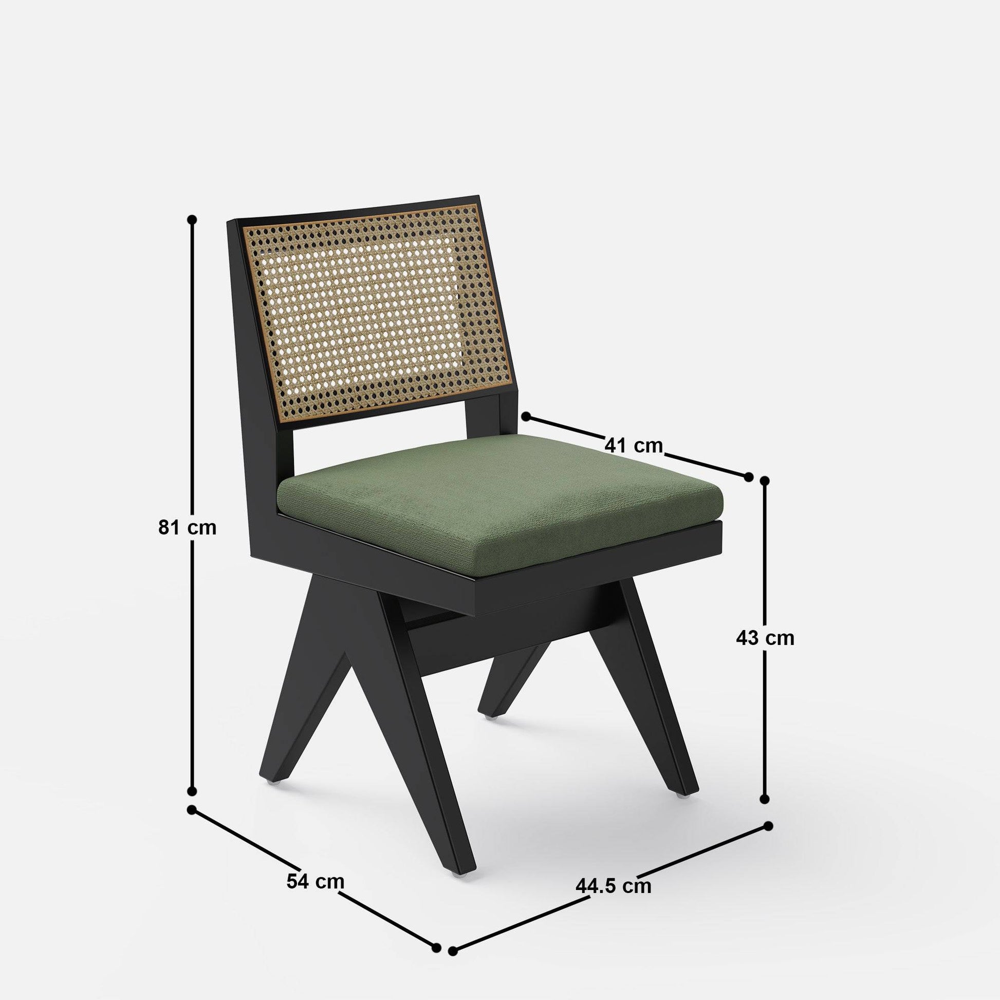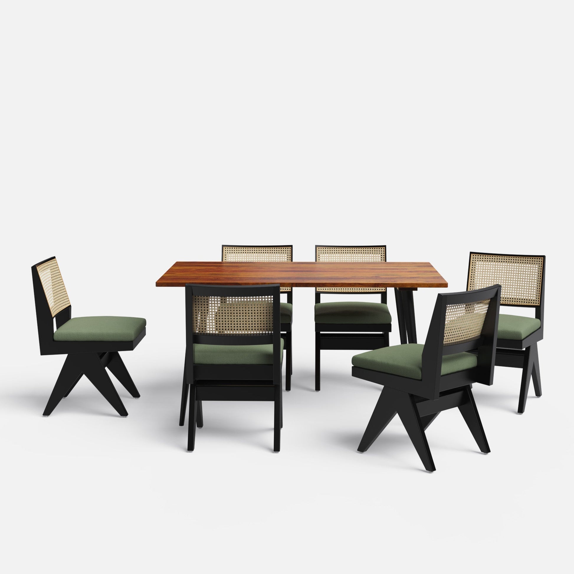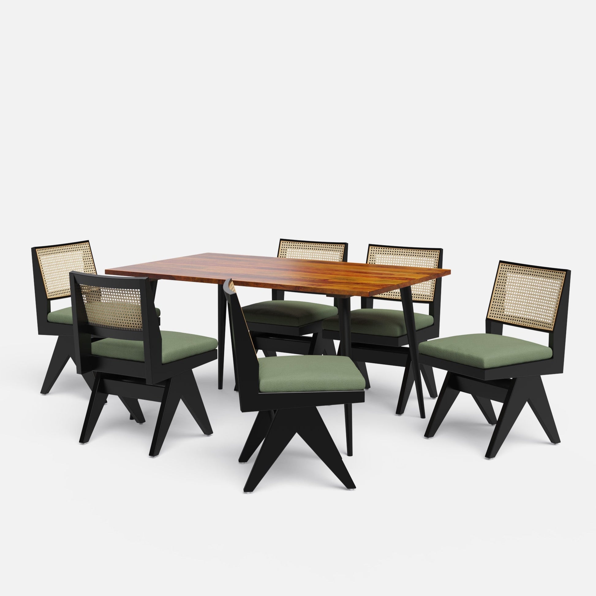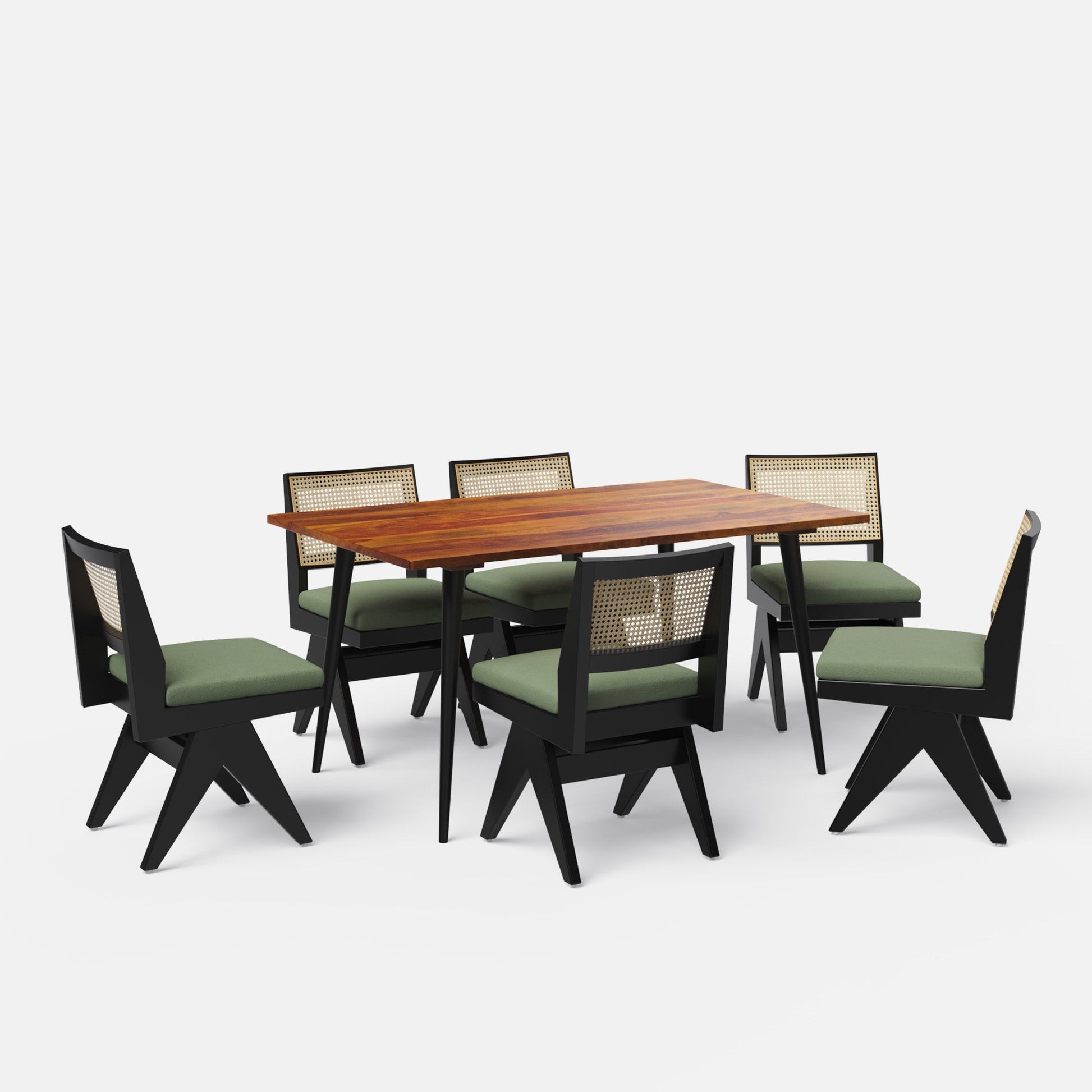 Introducing the Shelly Plaintop Jean Dining Set, a fusion of Scandinavian elegance and modern simplicity. Crafted from Sheesham wood, the Shelly table in honey finish features sleek metal legs and a plain Honey finish top. The Jean chairs, in a black matte finish, boast an armless Pierre Jeanneret-style design with seats upholstered in Seaweed Green cotton blend fabric. Available in 4 and 6-seater sizes, this set harmonizes timeless style with contemporary flair, creating a stylish and inviting dining space.