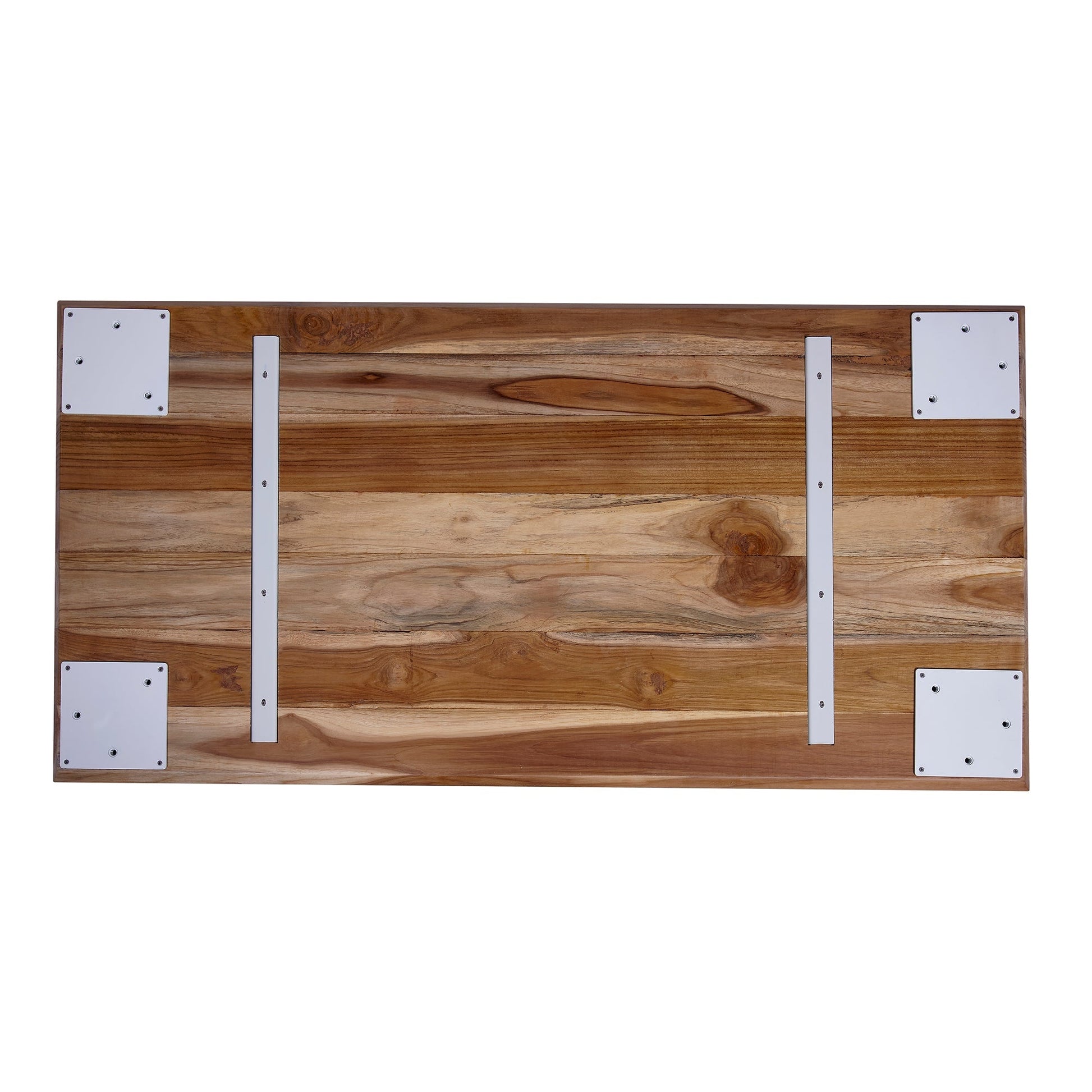 We use selected teak wood lumber seasoned at 6%-10% moisture and join them together using spline joints, creating a solid teak tabletop that is beautiful and lasts a long time of use.