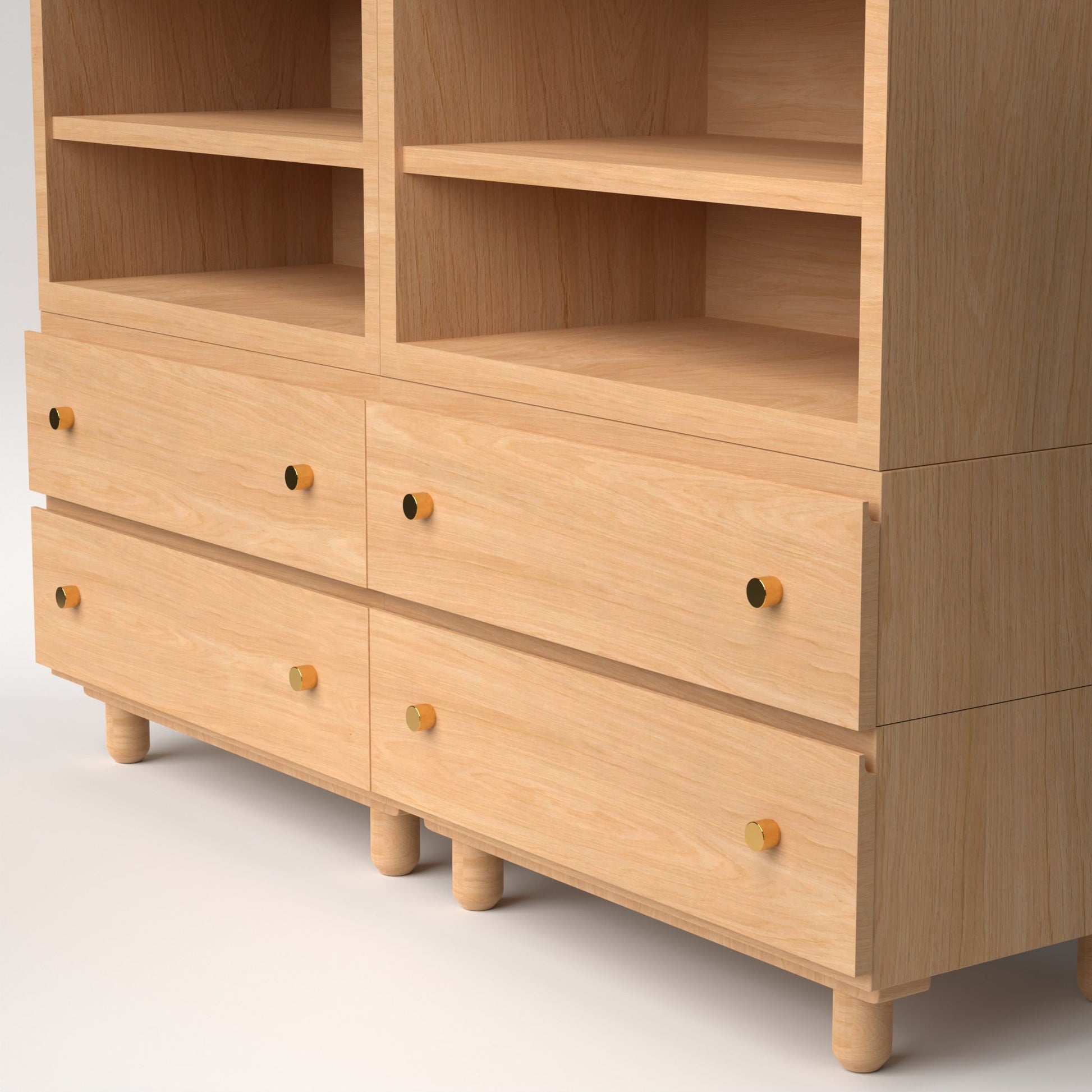 - Open or closed configuration — choose between all-drawer, all-shelf, or mixed layouts