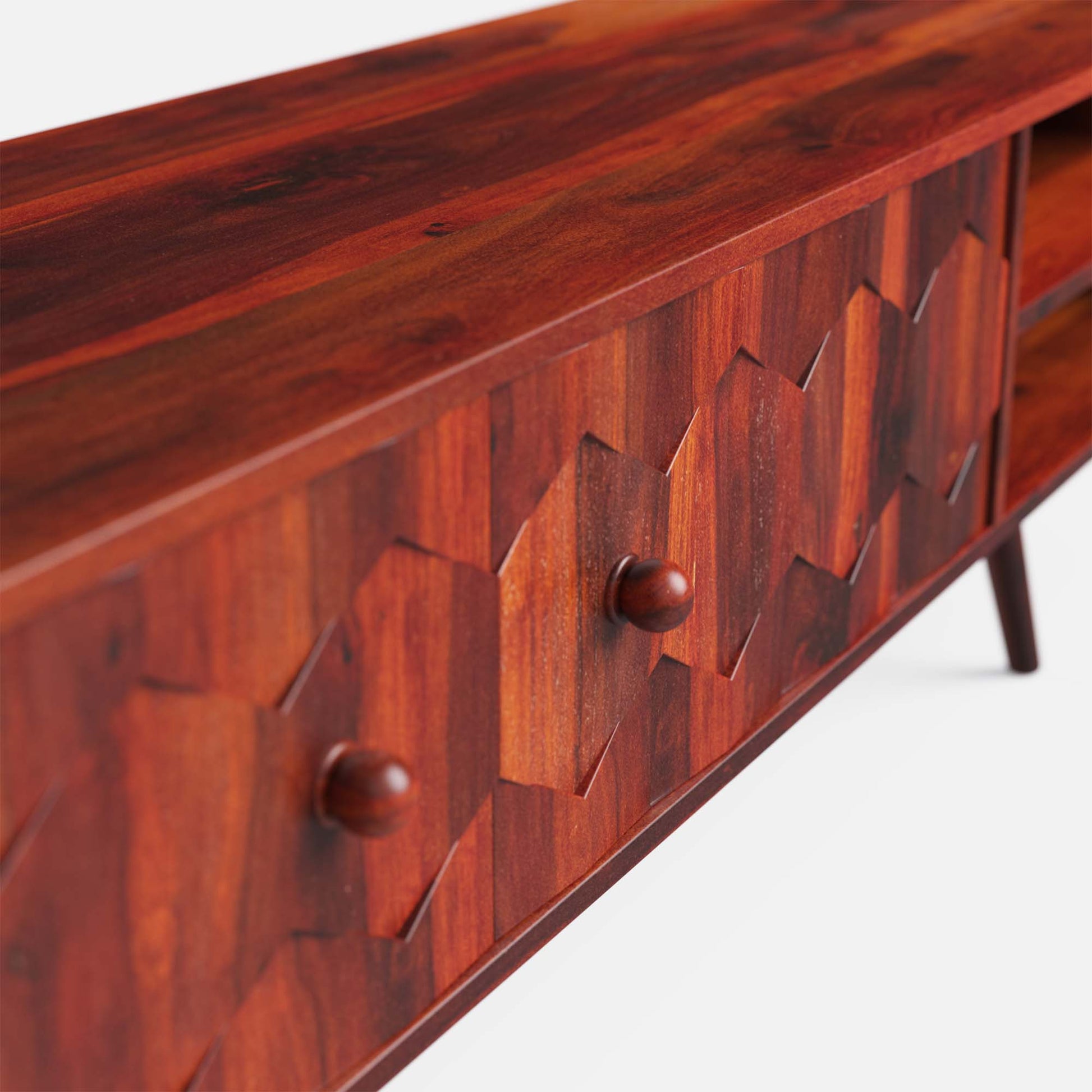 Introducing the Taiga Solid Wood TV Table Console, a versatile addition to your living space. Crafted from premium Sheesham wood with a lustrous honey walnut polish, the Taiga is available in multiple finishes to effortlessly complement your decor. Its sleek and functional modern design is accentuated by a CNC design front, creating a neat and aesthetic focal point for your TV area.